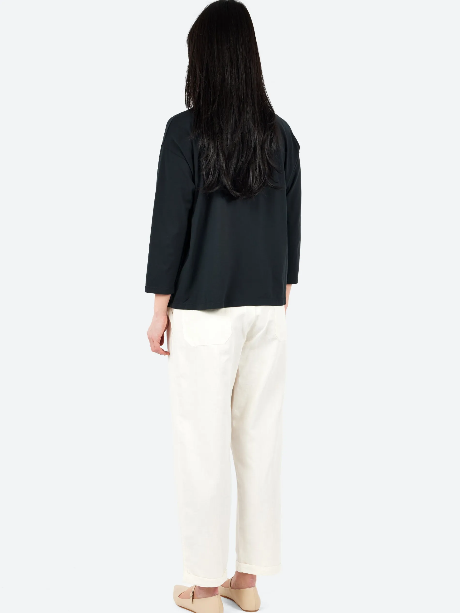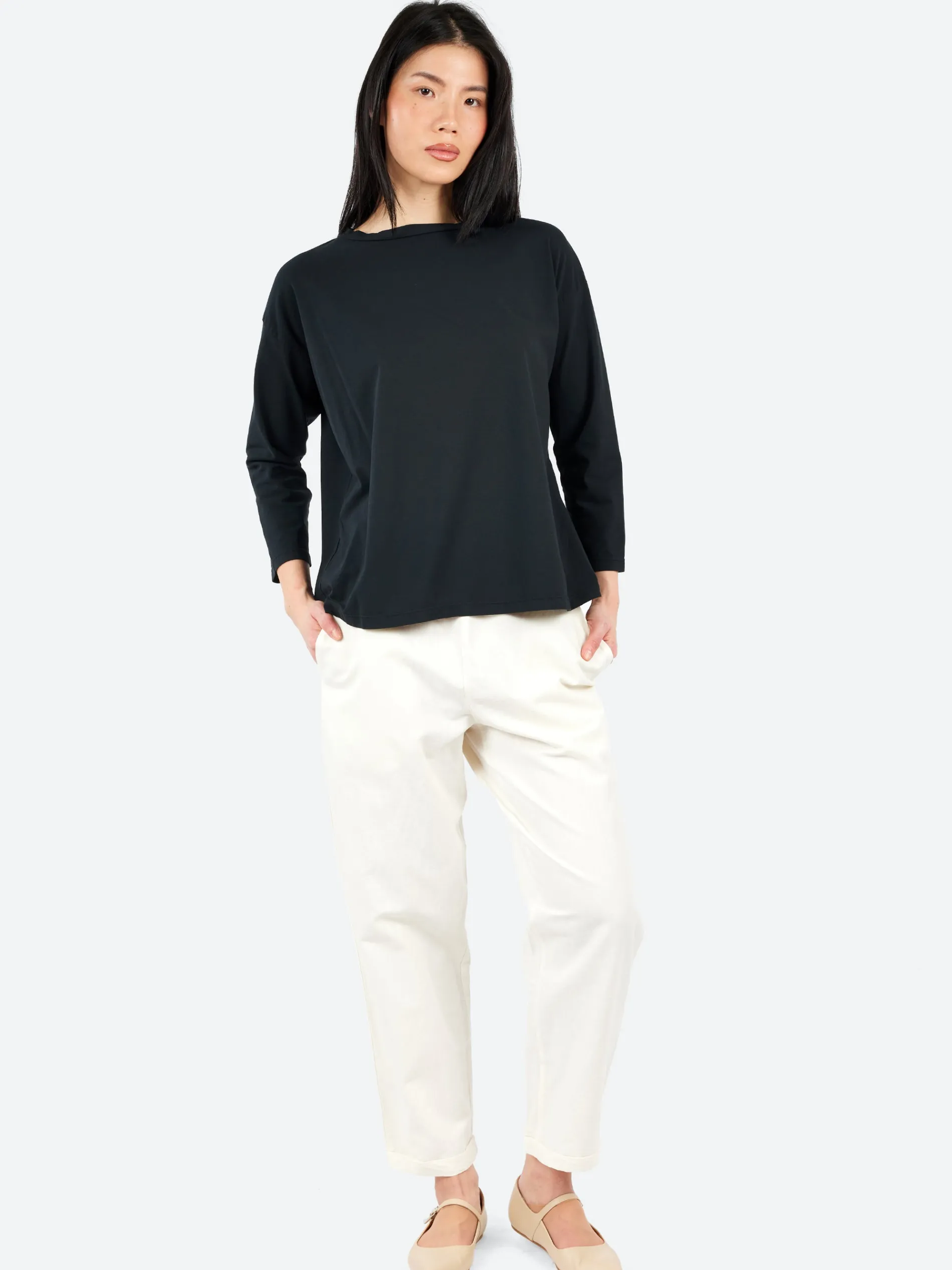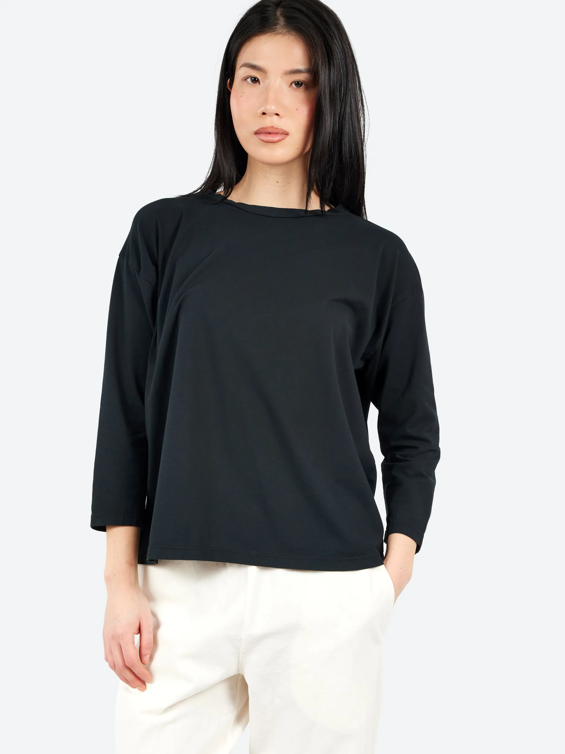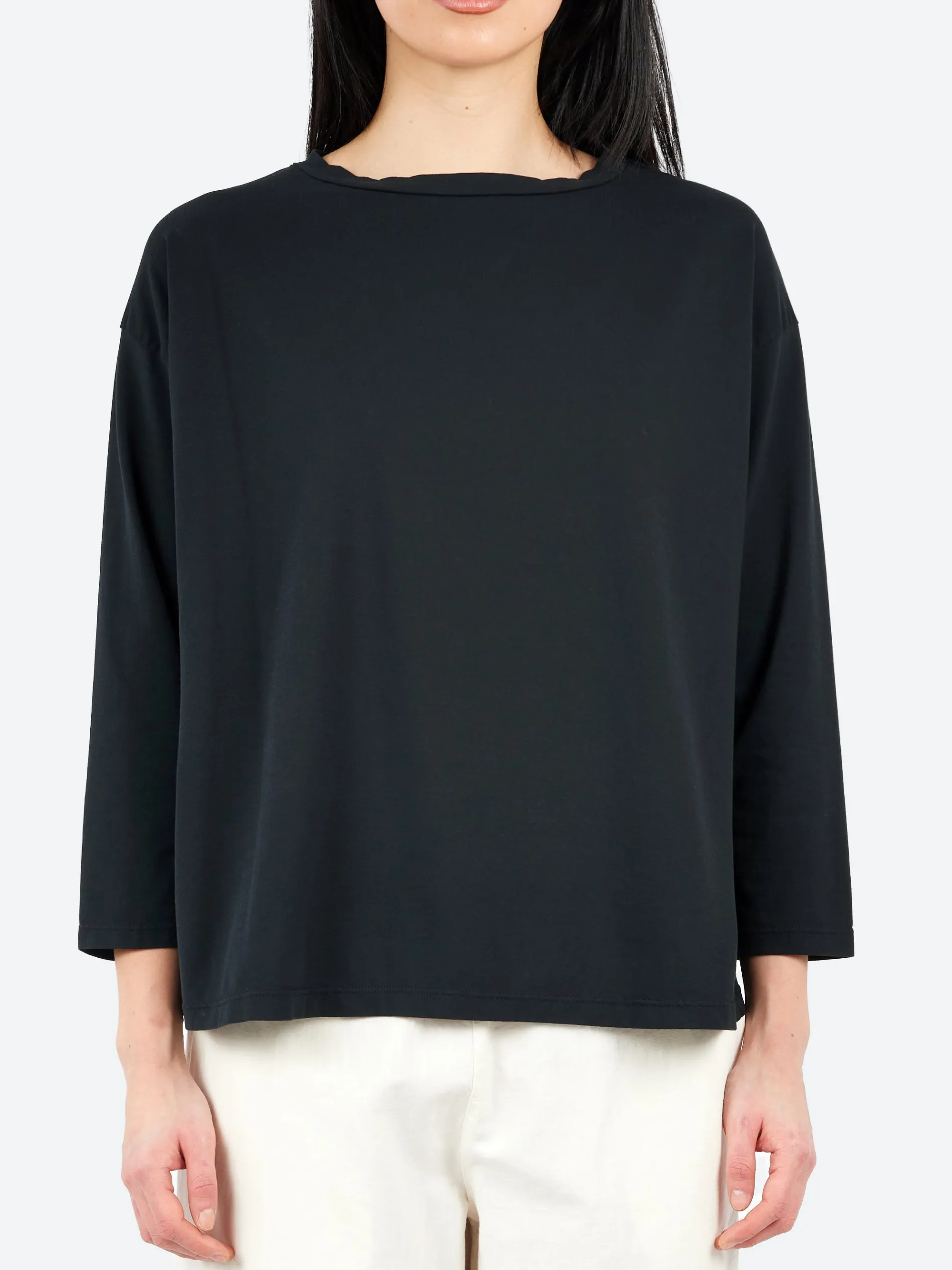 This boatneck tee features a relaxed, boxy fit and is made from a cotton crepe fabric, which is both smooth and comfortable. The three-quarter length sleeves and roll-edge finish at the neckline and hem give it a laid-back, modern vibe. It’s versatile and casual, perfect for layering or wearing on its own.