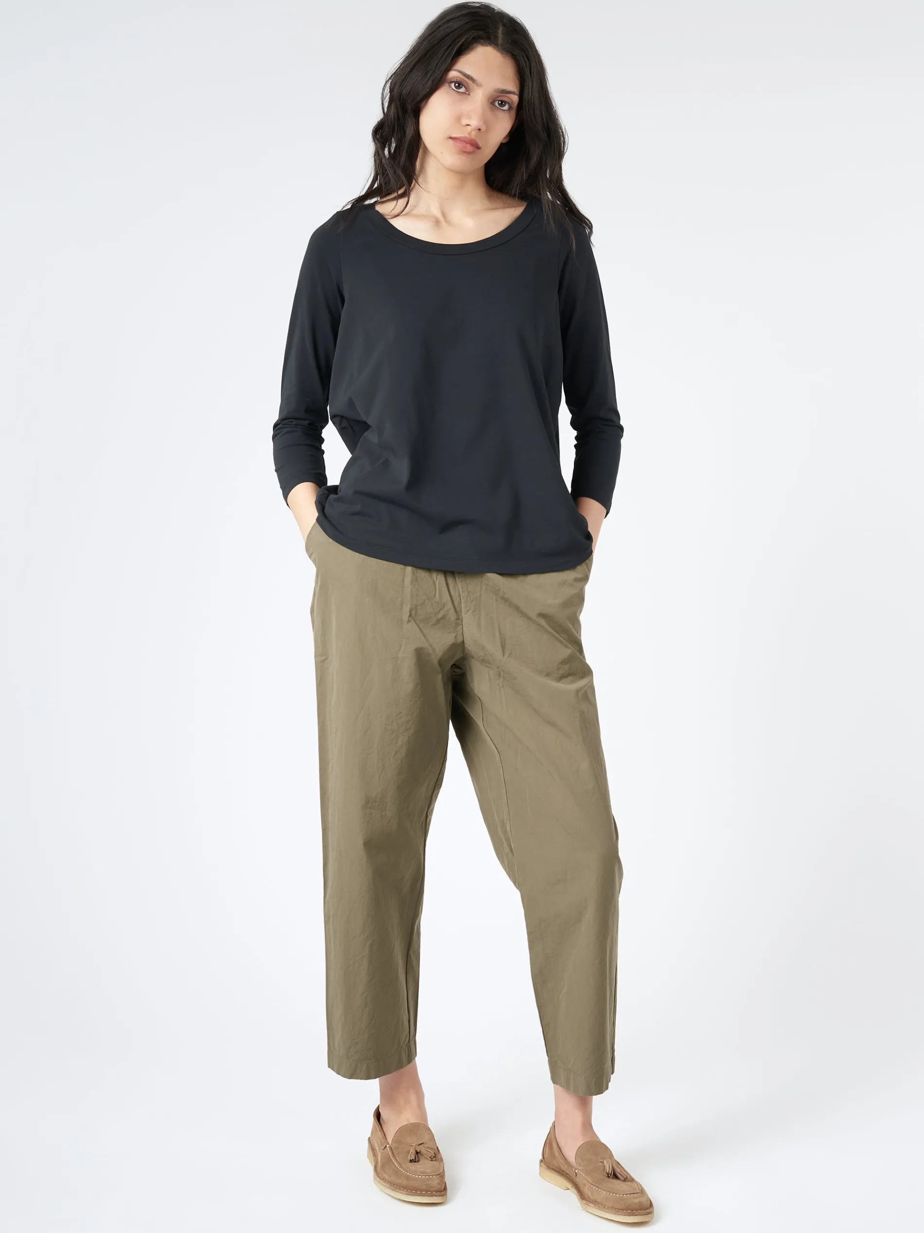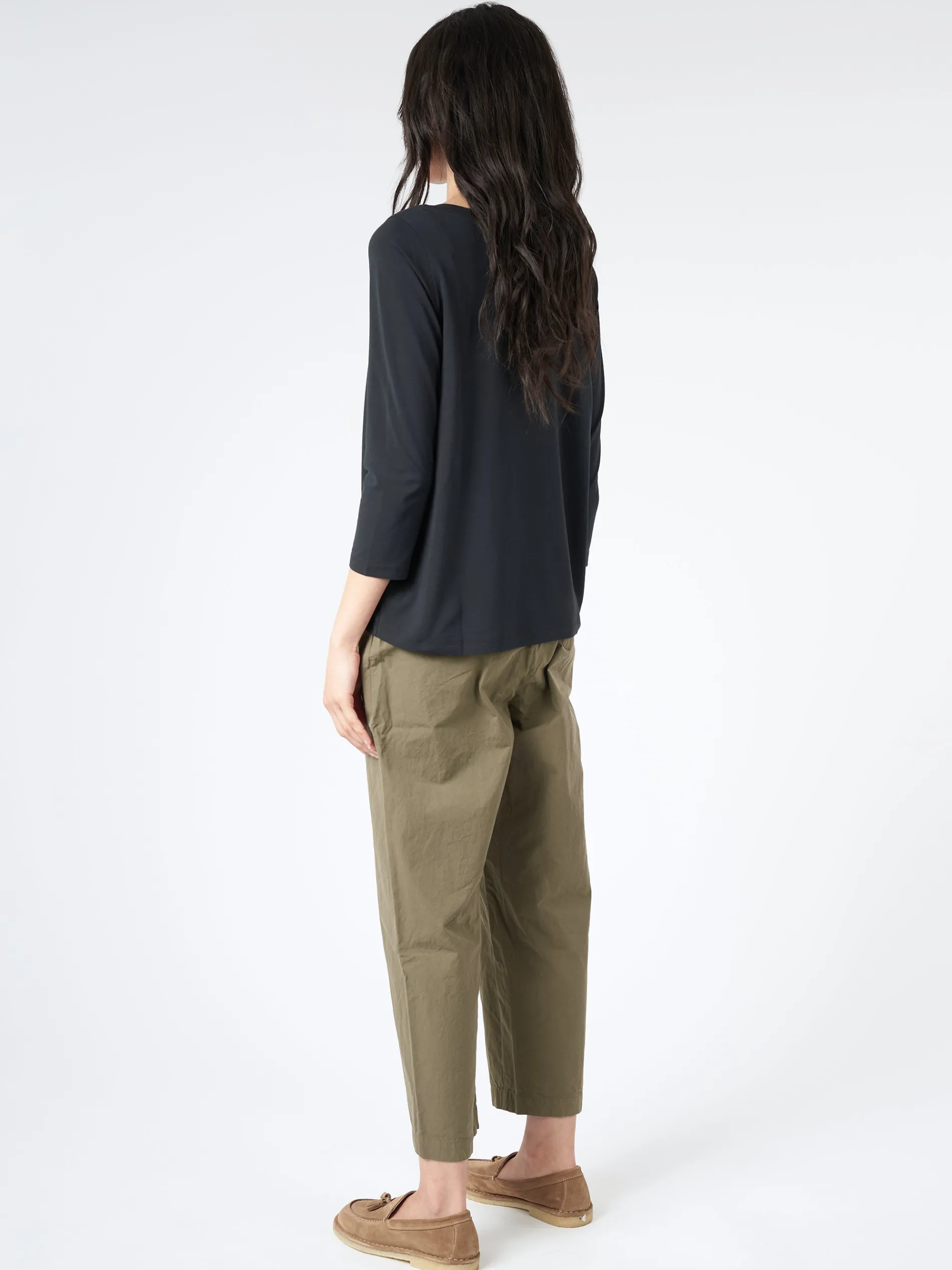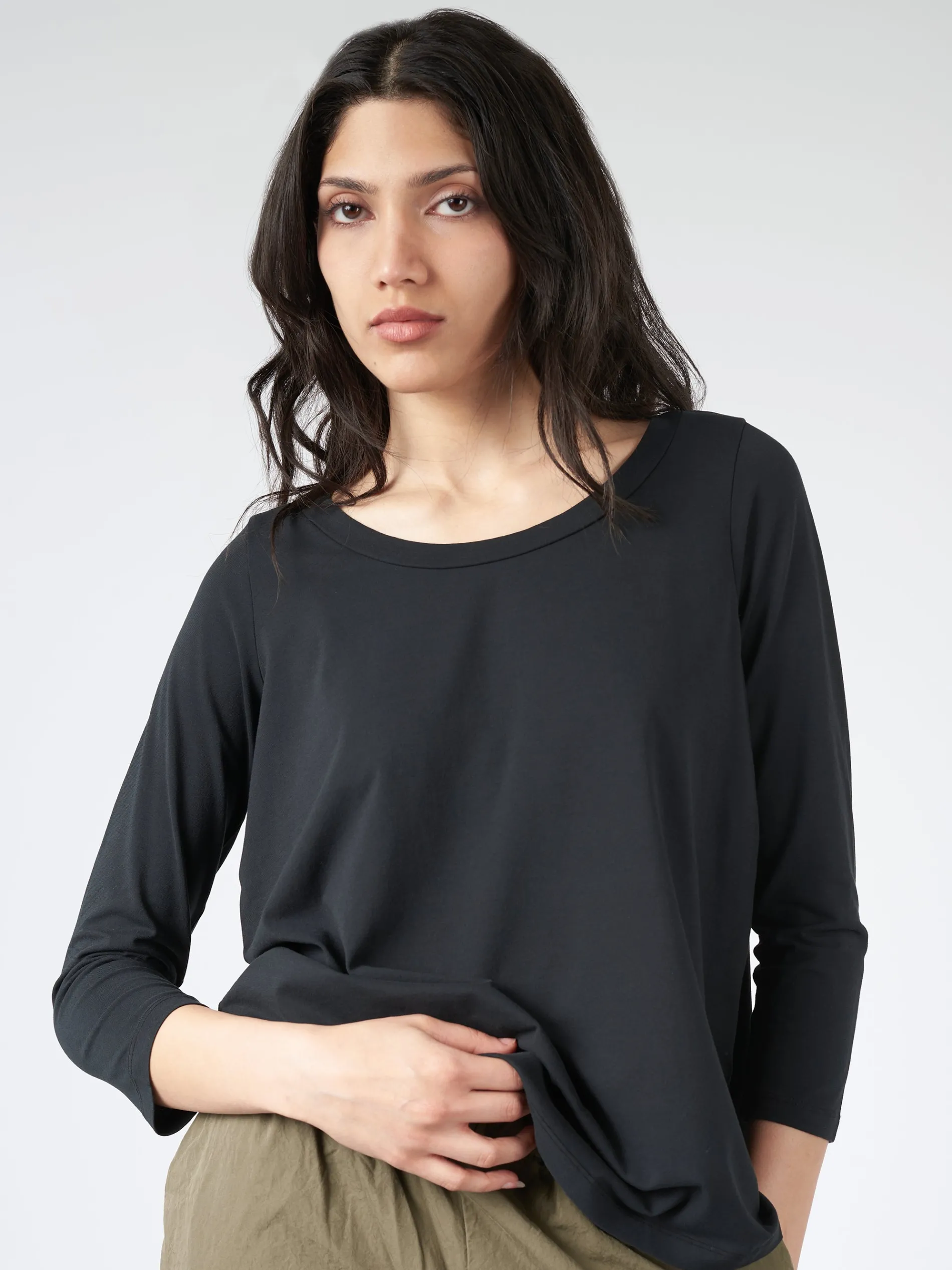 Labo.Art shirt with egg shape featuring a scoop neckline, rolled finished neck.