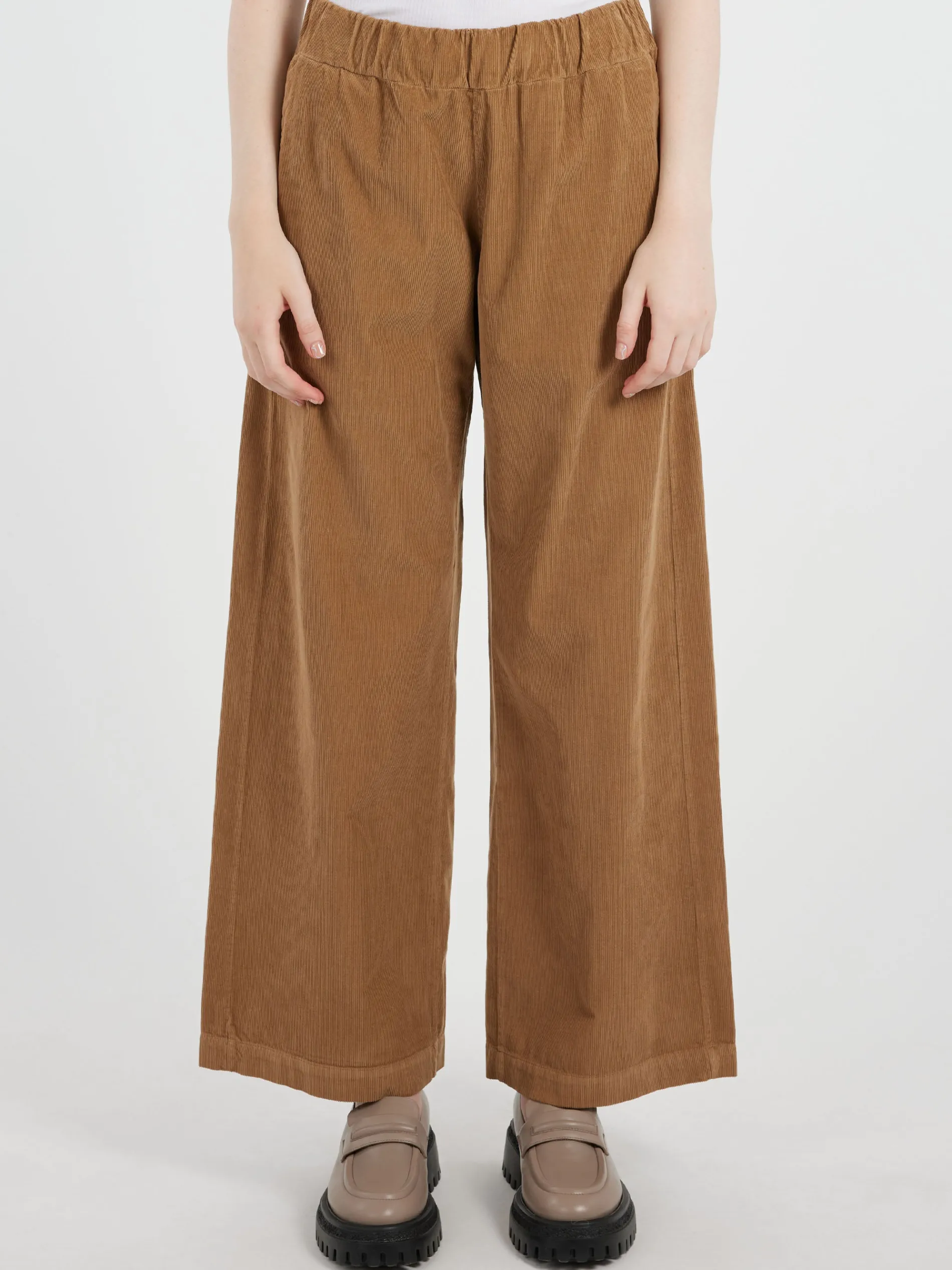 These pants feature a stretch waistband and are made from a thin waled cotton corduroy, making them both comfortable and stylish.