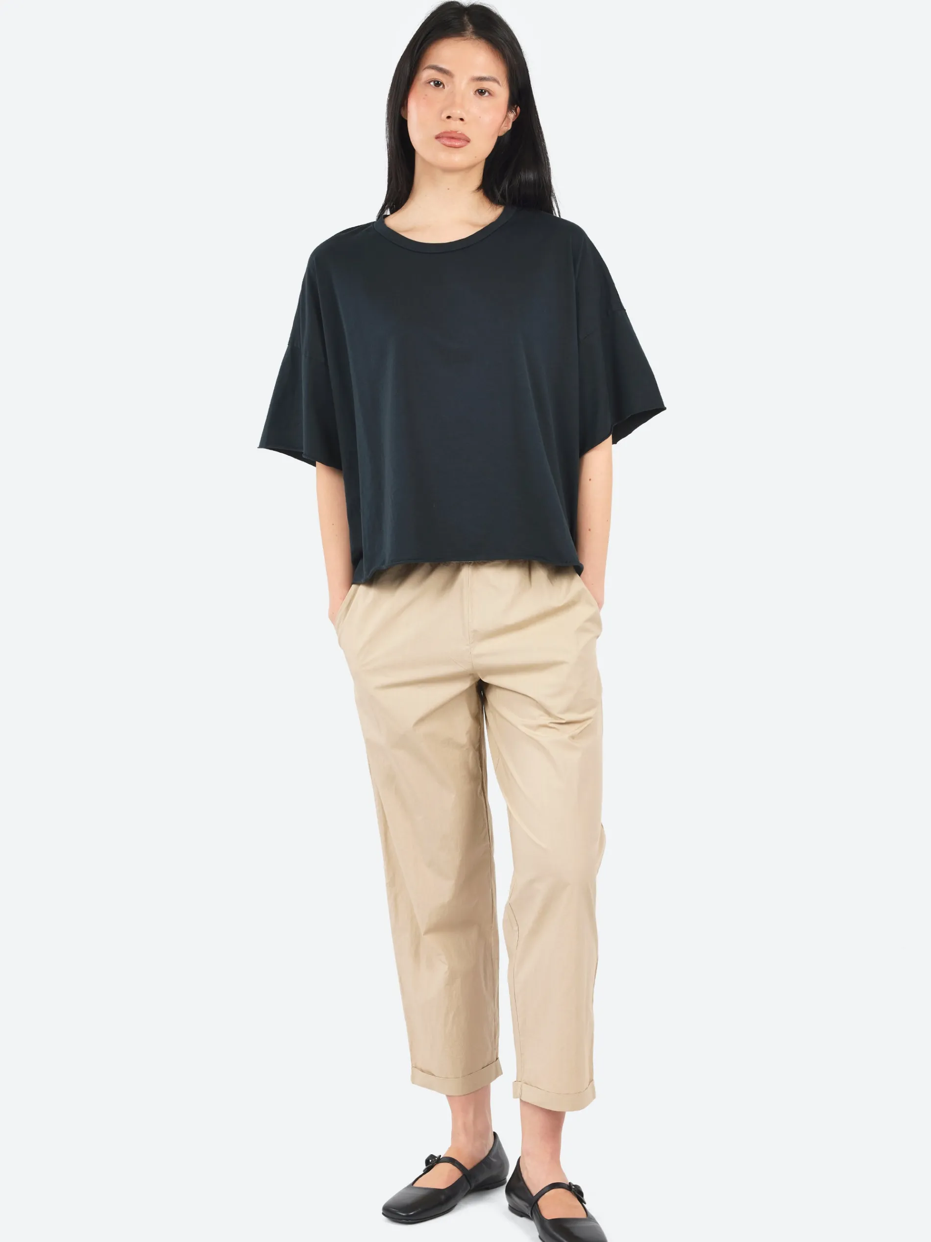 Labo.Art carrot cut pants with stretch waistband, cuffs and side pockets.