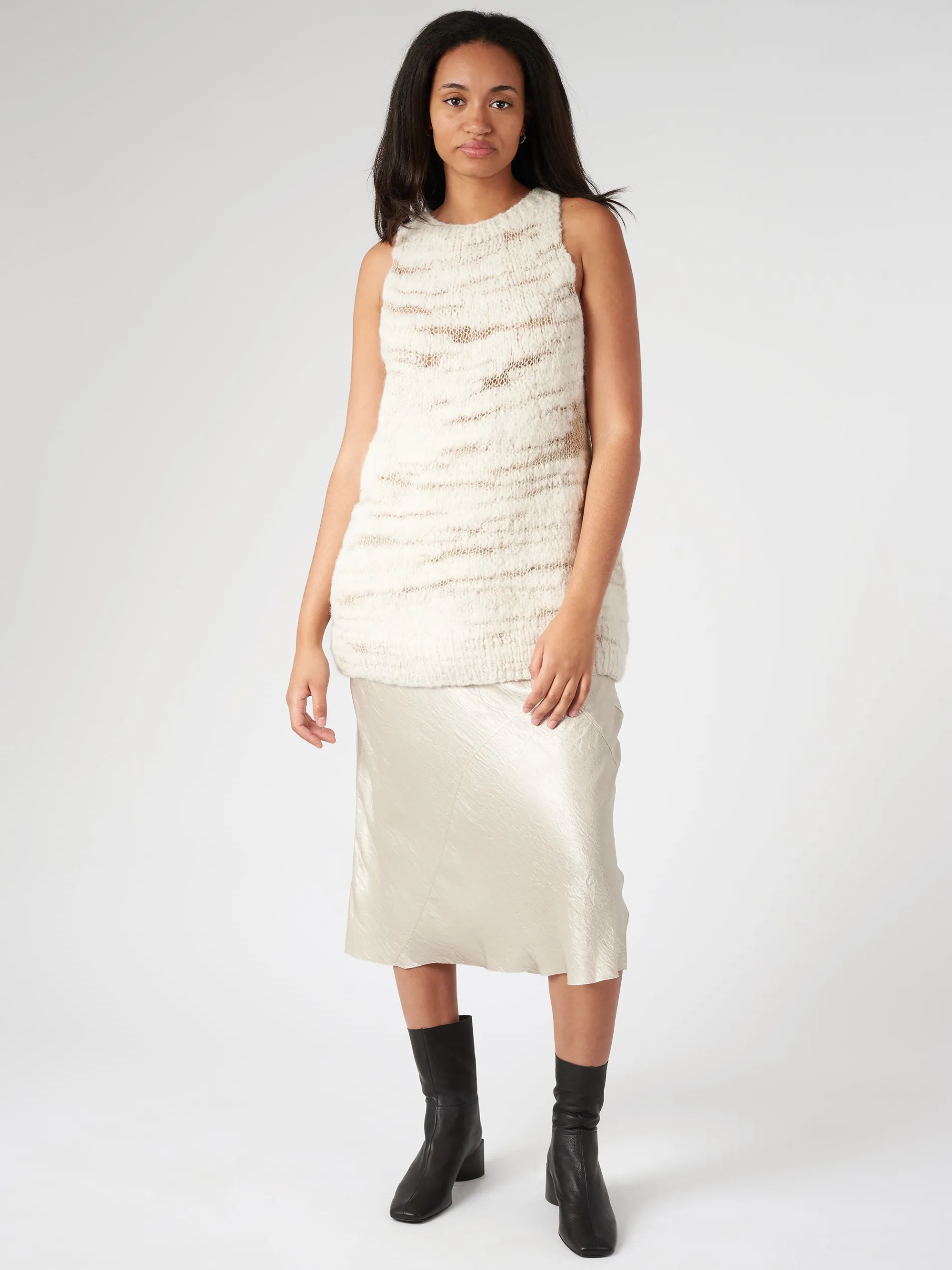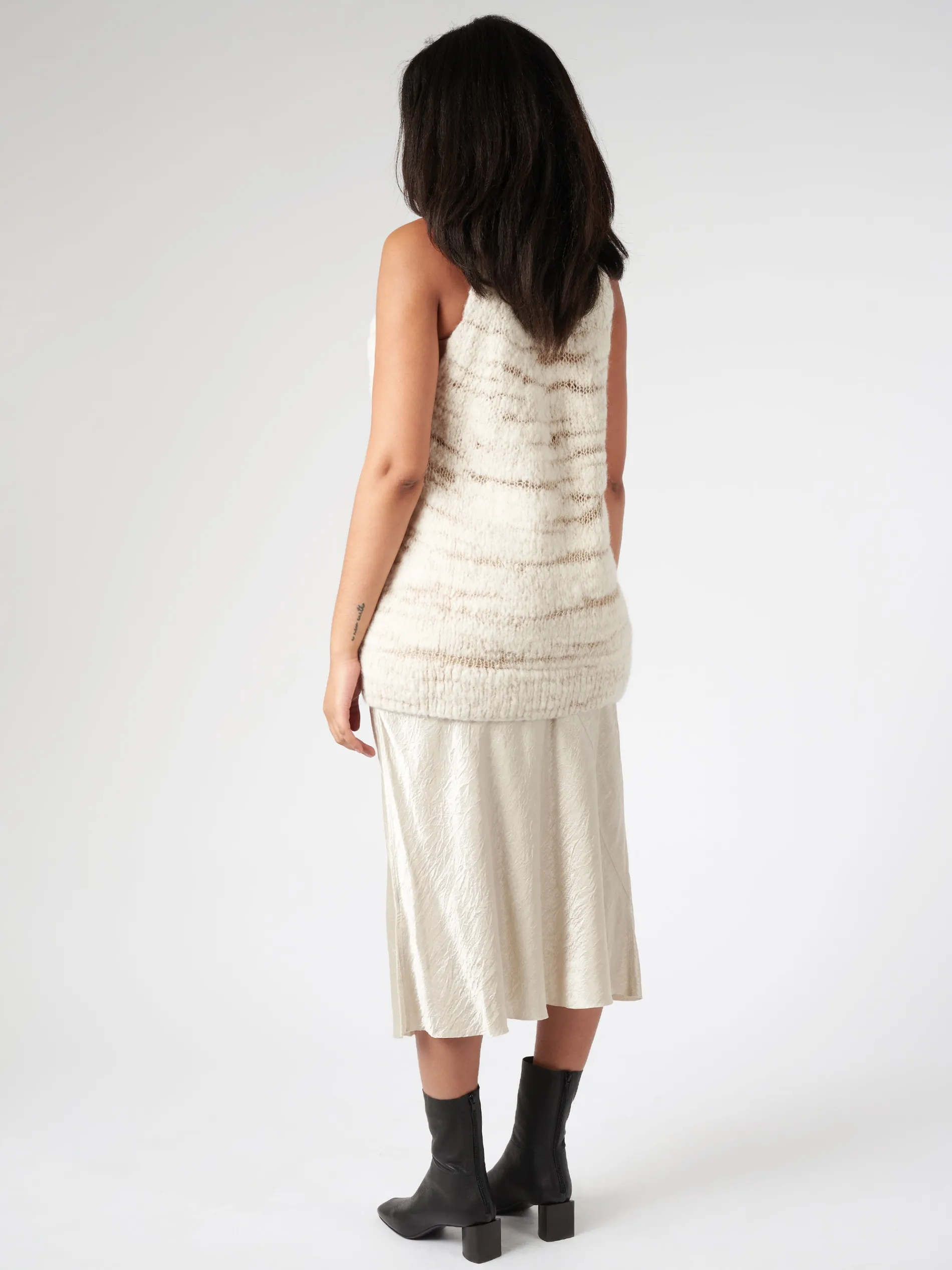 Lauren Manoogian crewneck sweater vest with an irregular texture and transparency. Contrast between fluffy and smooth tightly spun areas.