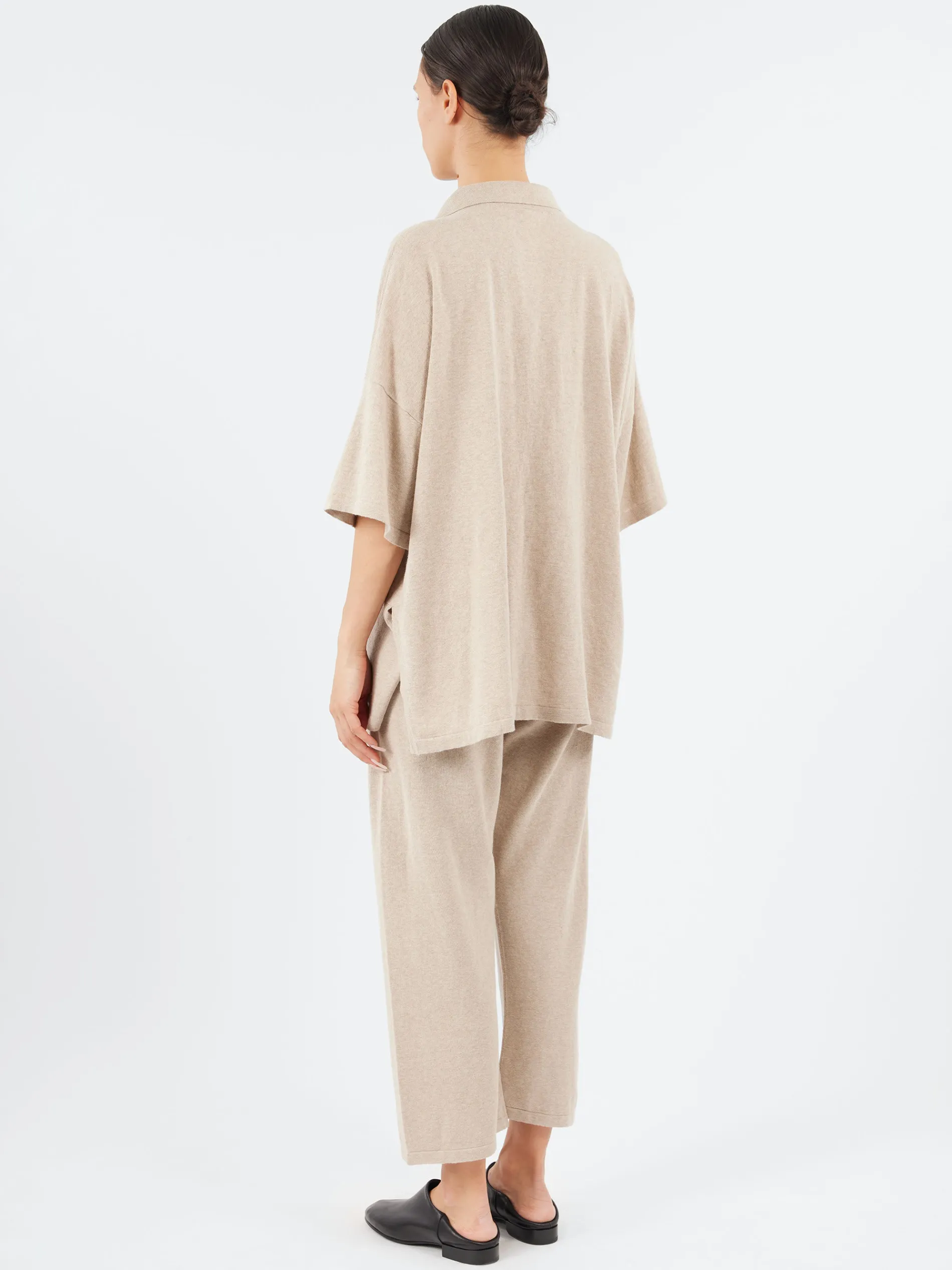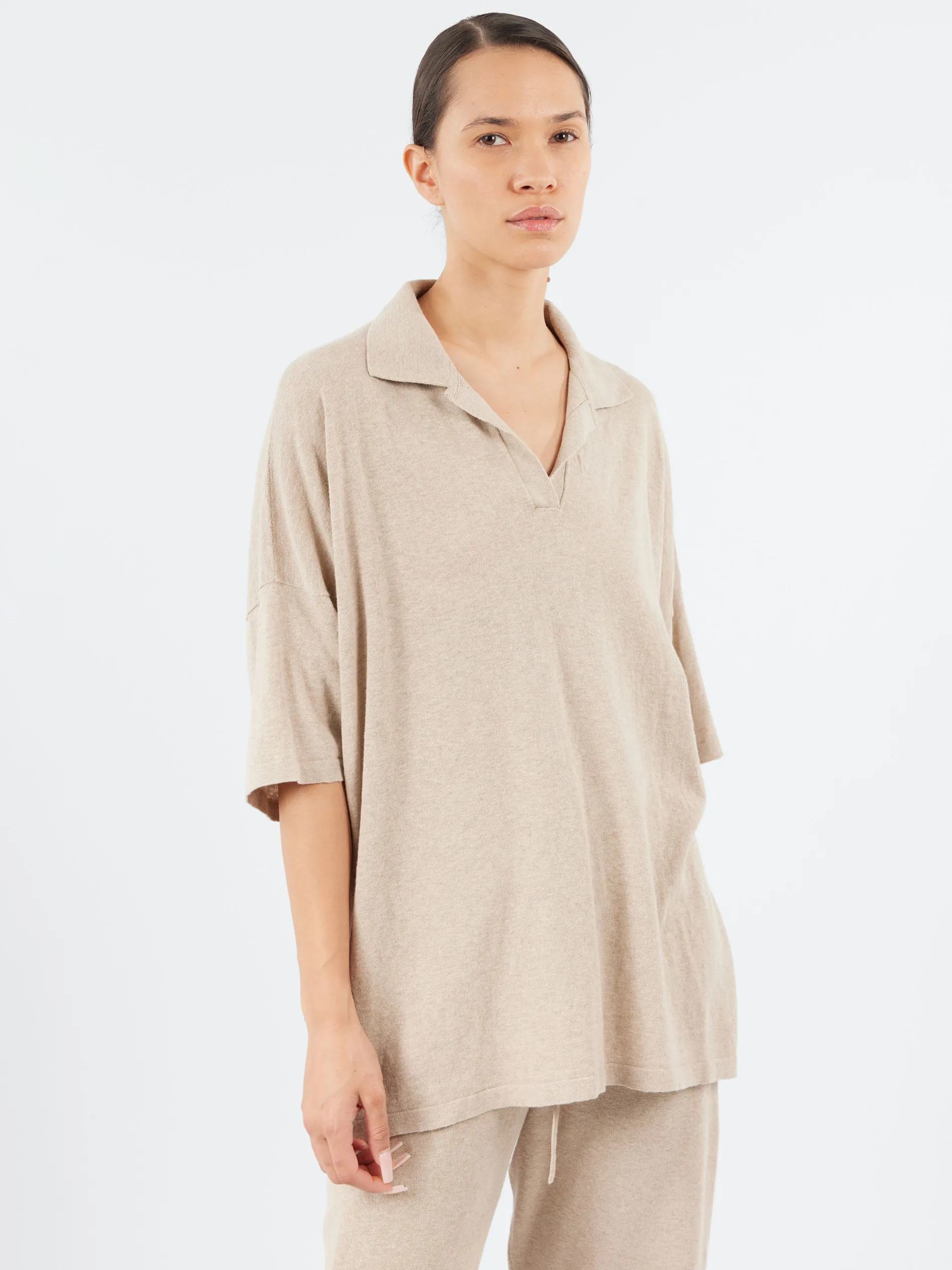 The Oversize Polo by Lauren Manoogian is a hand-loomed knit top crafted in Peru from a blend of Pima cotton and linen. Designed for a relaxed fit, it features a ribbed collar and clean tubular finishing, offering both comfort and style. This versatile piece is suitable for various occasions, combining artisan craftsmanship with minimalist sophistication.
