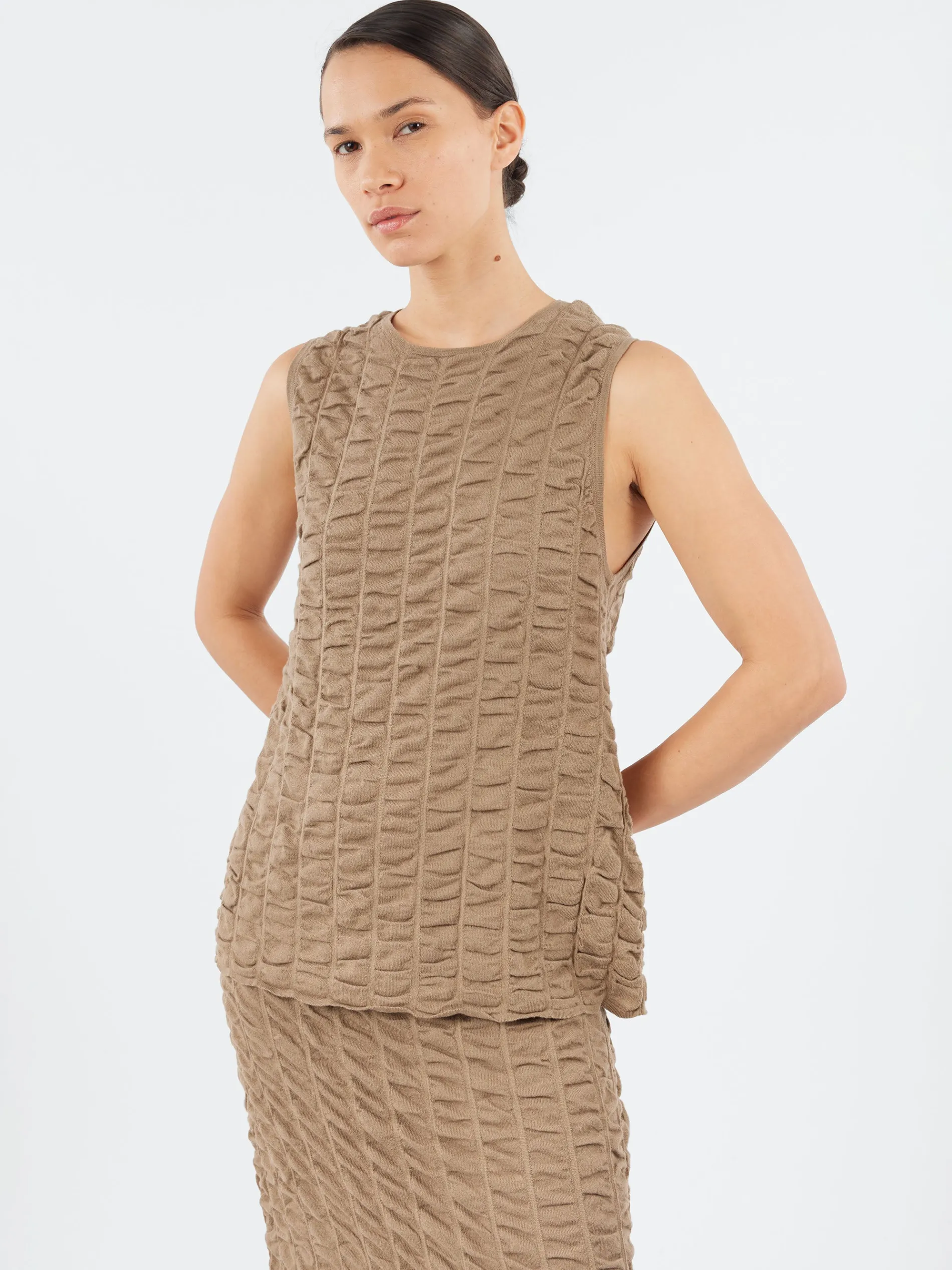 The Ruche Shell by Lauren Manoogian is a refined, hand-loomed knit top crafted in Peru from Pima cotton. This sleeveless piece features a dimensional stitch pattern offering both texture and subtle structure. Designed with a relaxed fit, it serves as a versatile layering piece or a standalone top for warmer weather.