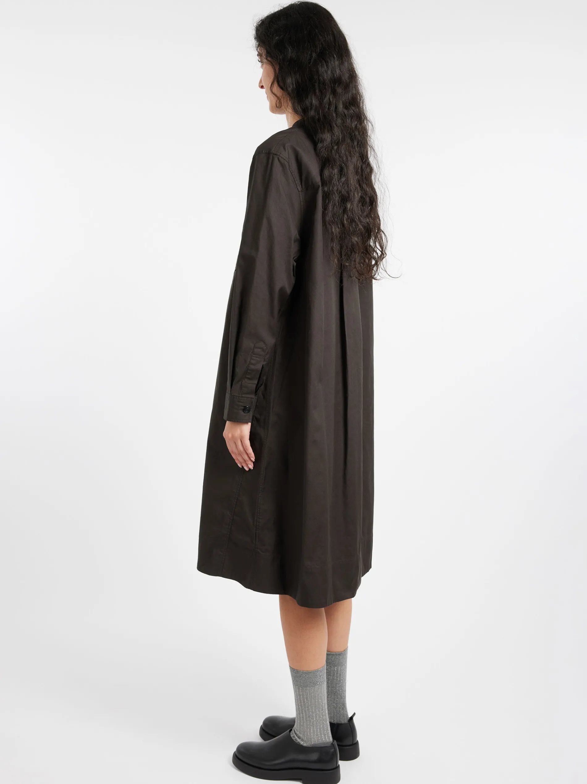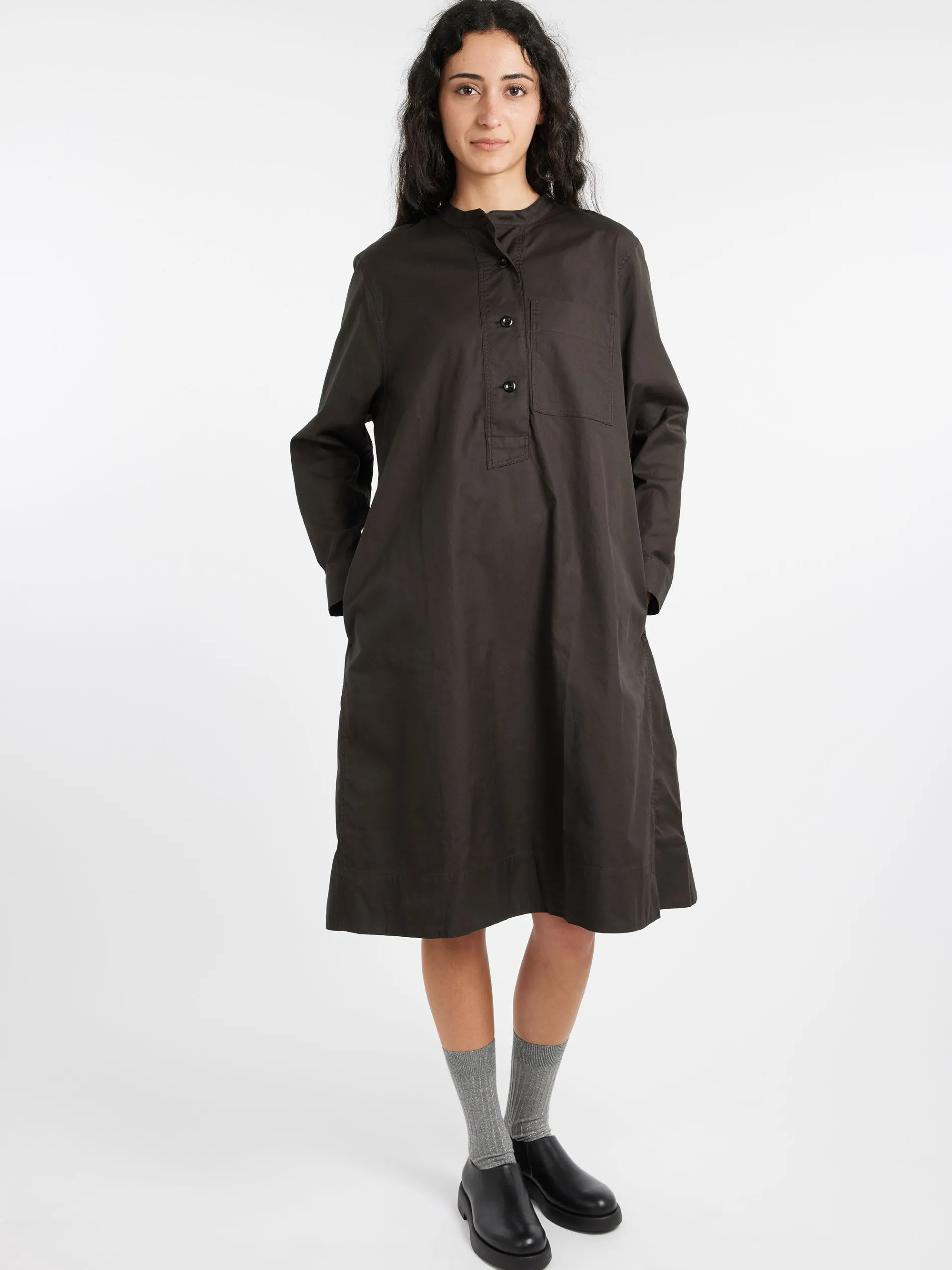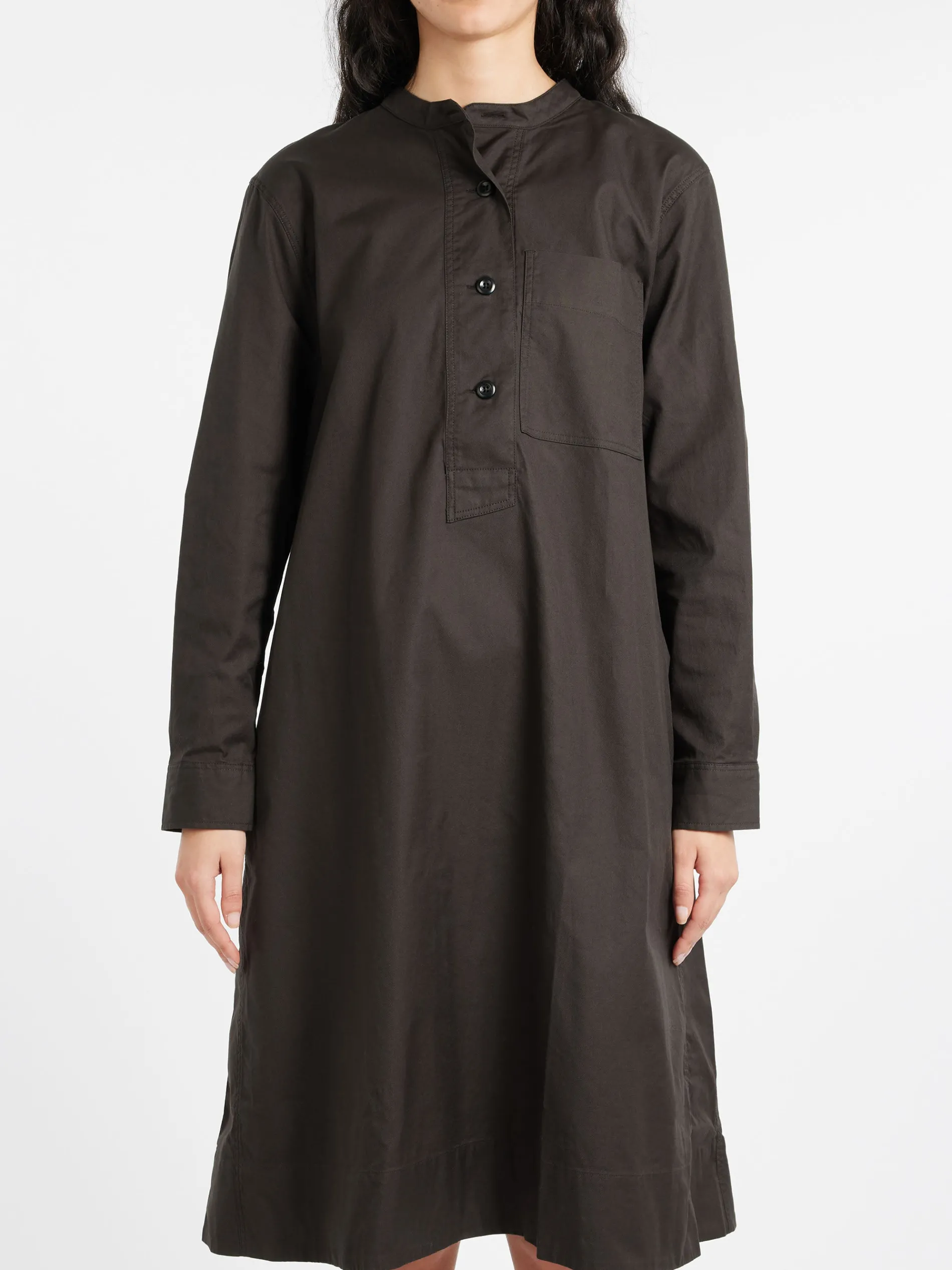 Margaret Howell collarless swing dress in a regular cut. Fabricated in Italian cotton chambray.