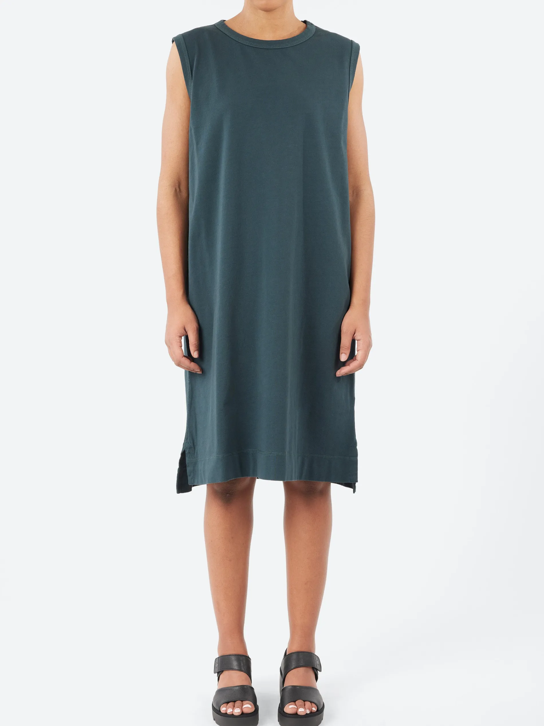 This Overhead Tank Dress reinterprets the ease and simplicity of the MHL. tank top in a longer silhouette. It has a regular, boxy cut and sits at knee length, and is fabricated in lightweight cotton jersey with a matt finish. The style features a back patch pocket and overlock stitch detailing on the side seams and hem.