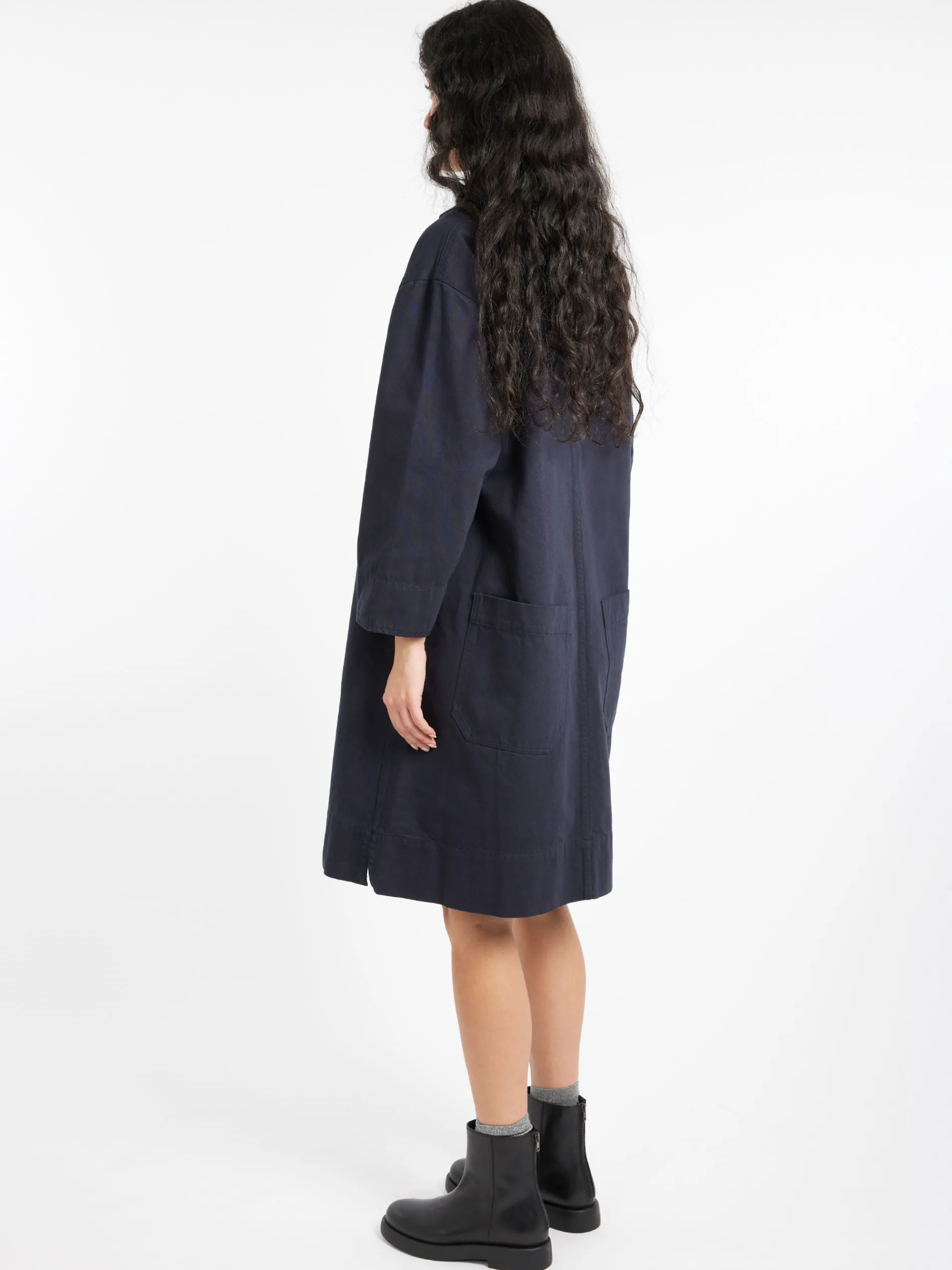 Margaret Howell cotton drill patch pocket smock dress with a relaxed cut. Fabricated in dense Italian cotton drill.