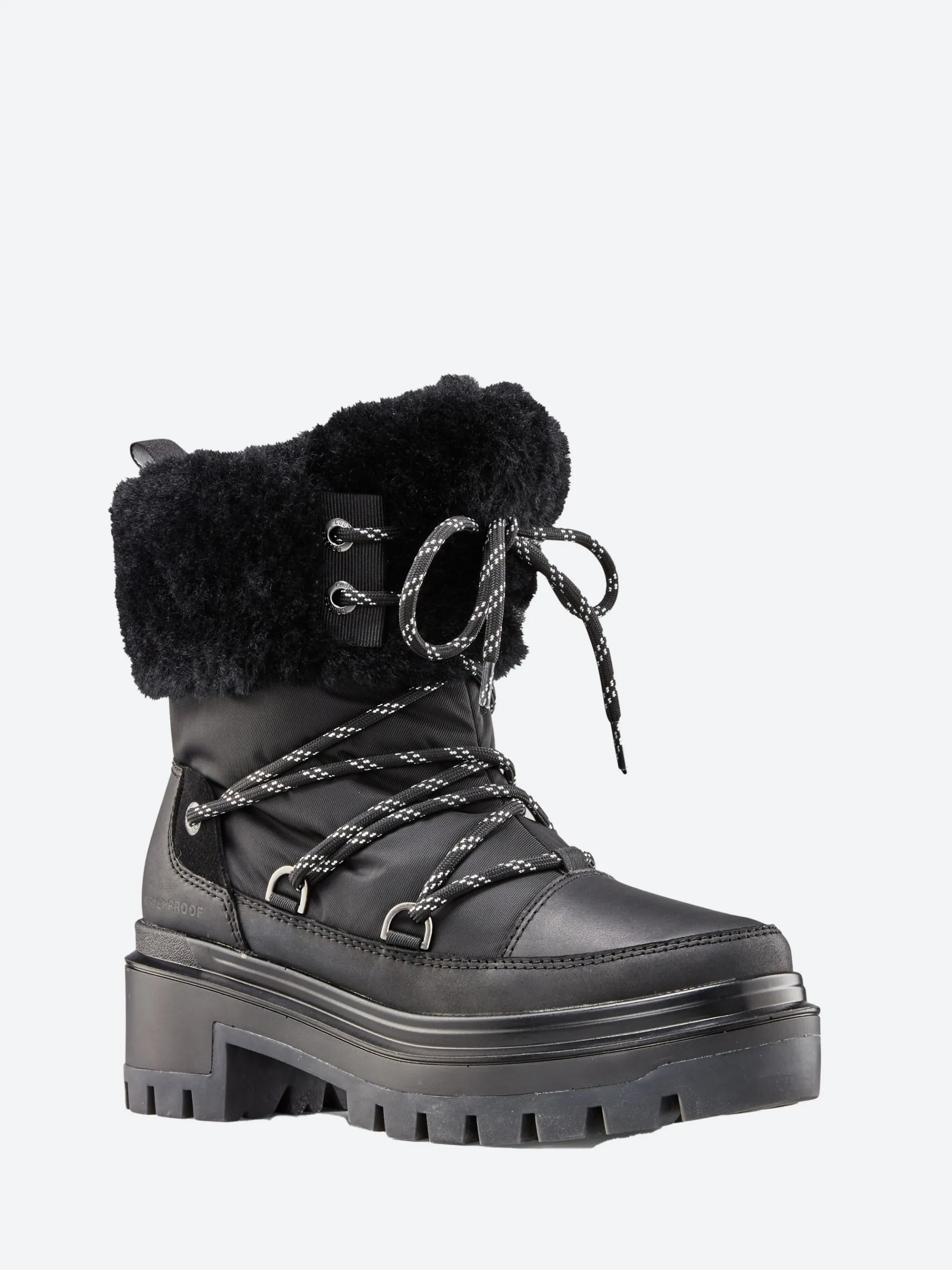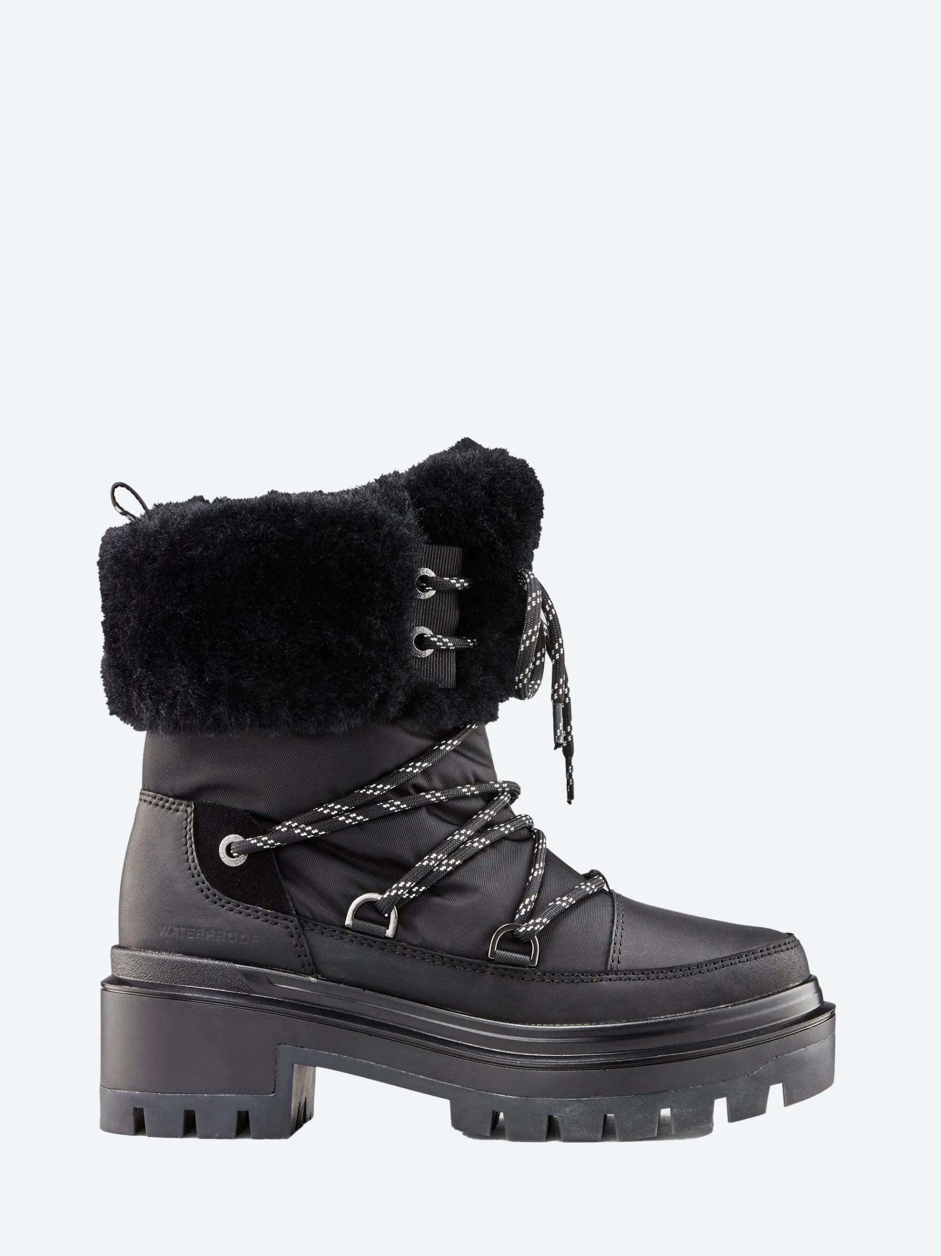 Mid height leather and nylon boot with faux shearling collar and tongue detail. Thermoplastic rubber outsole with polyurethane cushion midsole and 2 inch heel.
