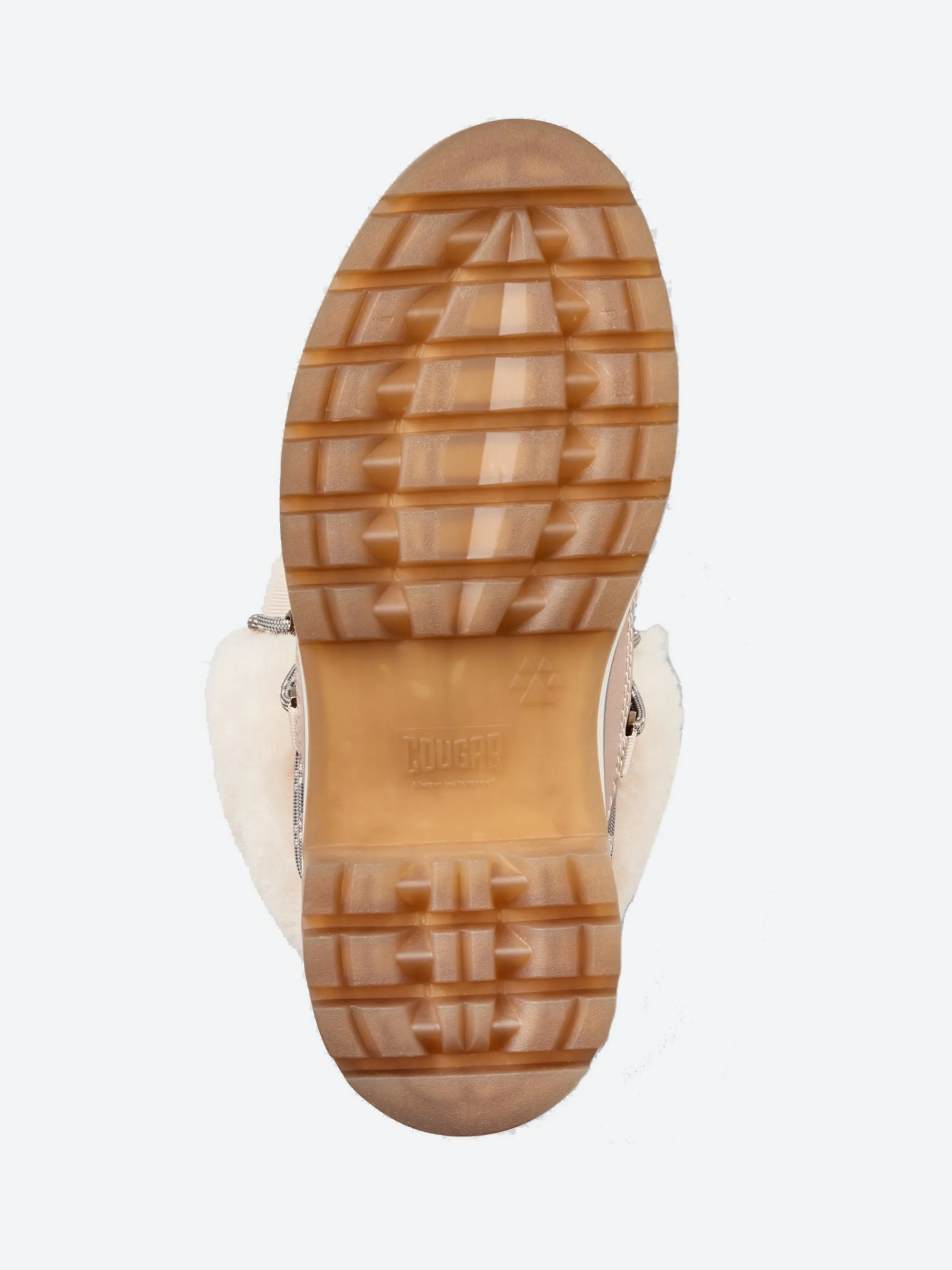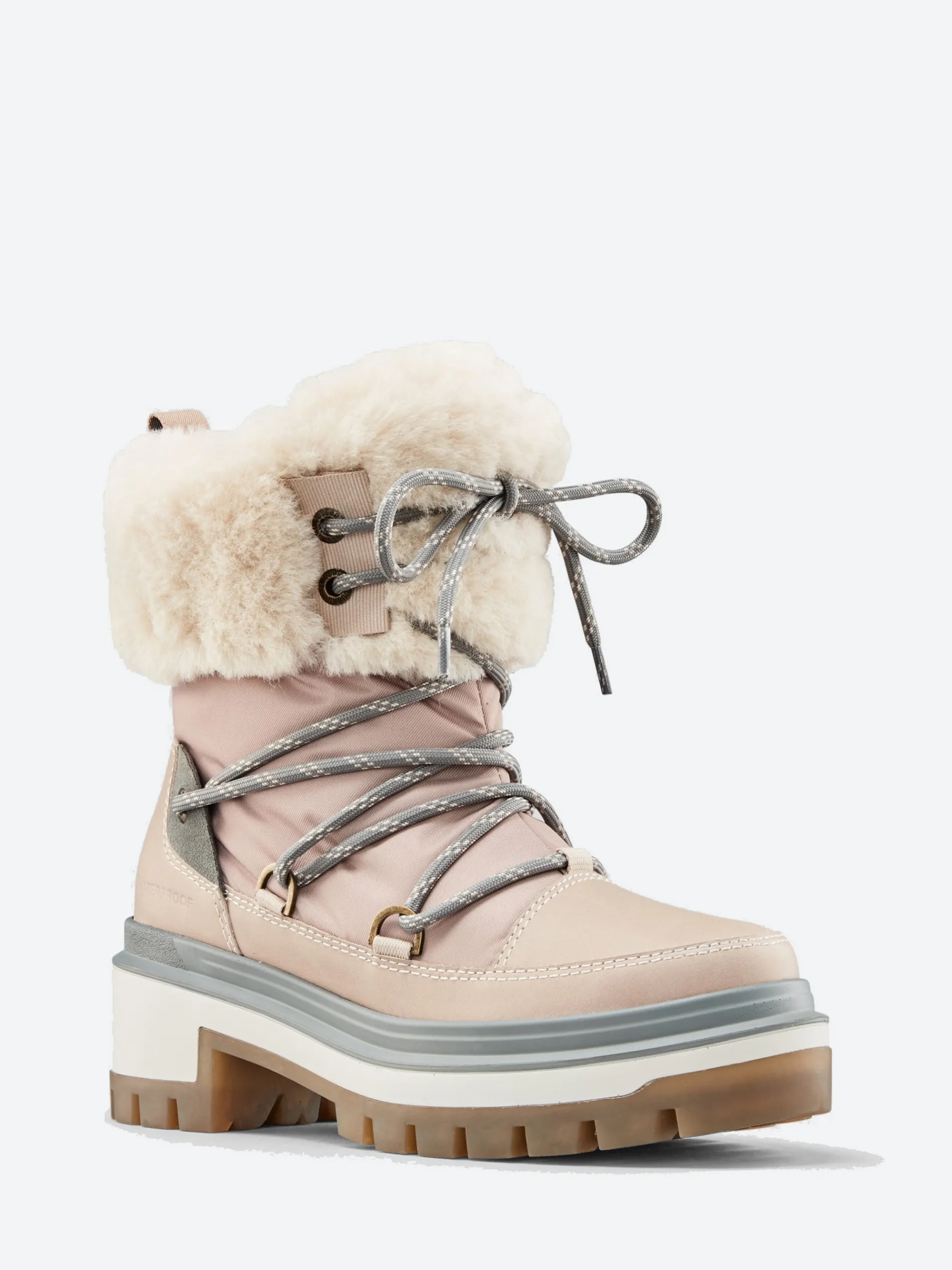 Mid height leather and nylon boot with faux shearling collar and tongue detail. Thermoplastic rubber outsole with polyurethane cushion midsole and 2 inch heel.