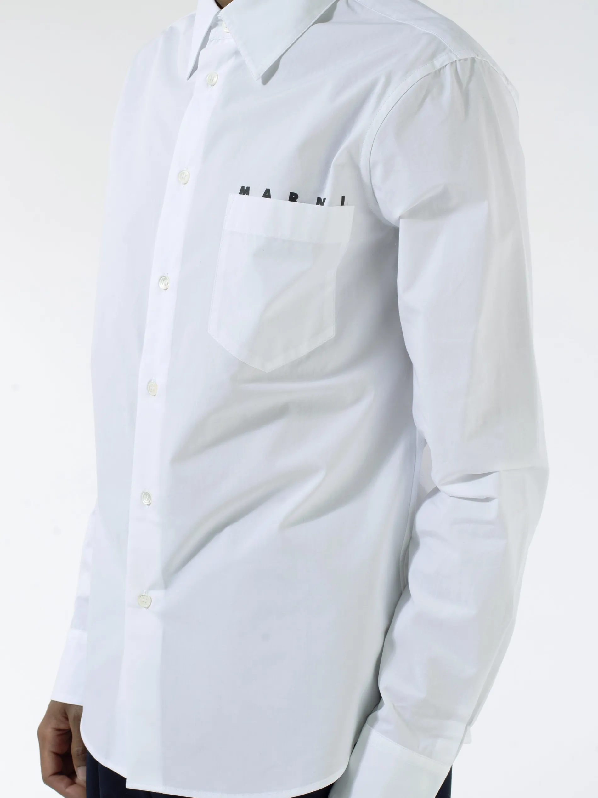 Marni button-up shirt with a printed logo at the chest. Crafted from a lightweight woven cotton.