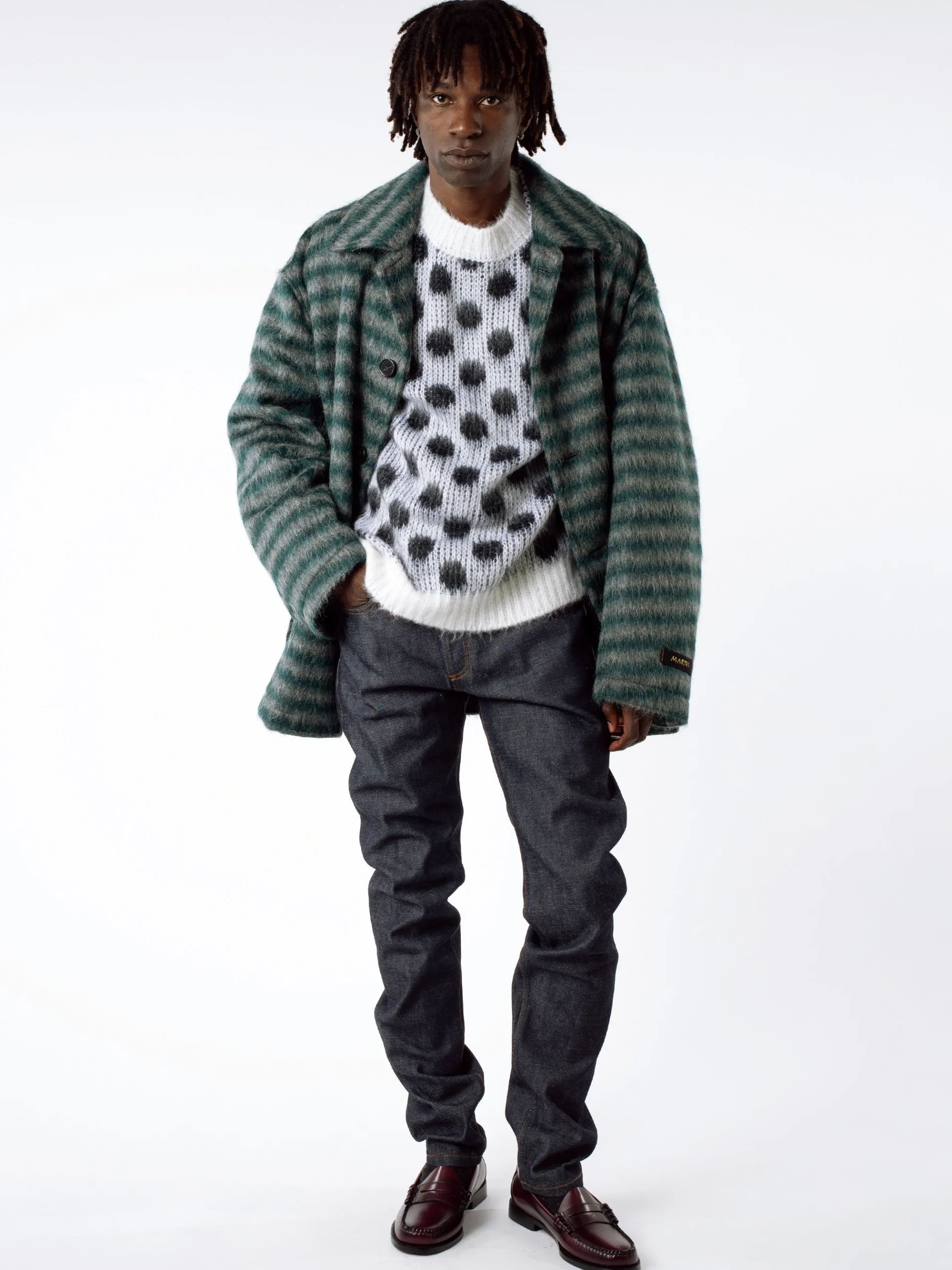 Marni single-breasted button-up trench coat in a brushed mohair with multicolour stripes.