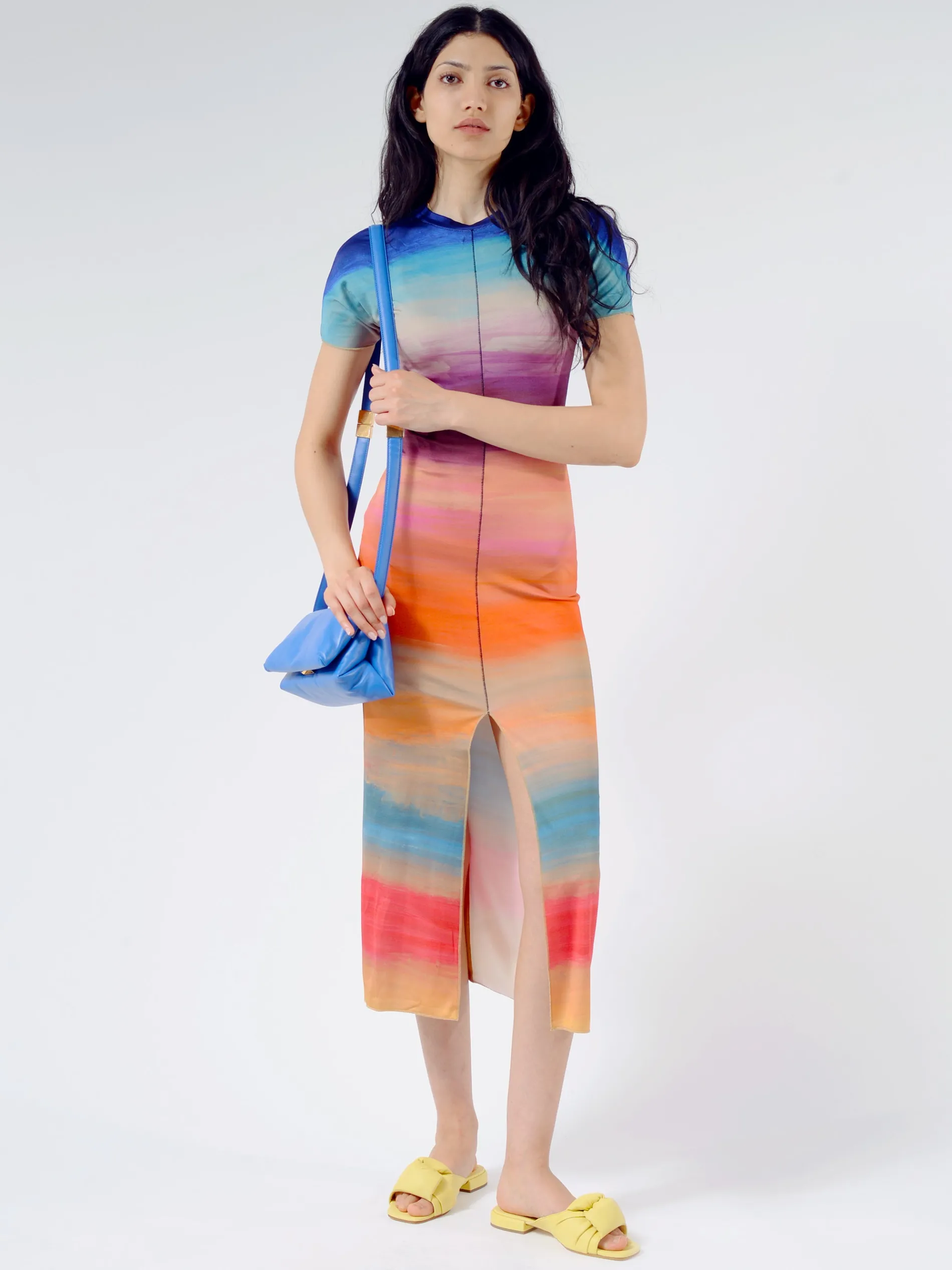 Bodycon sheath dress made of viscose jersey with Dark Side of the Moon dégradé stripe print based on artwork by Flaminia Veronesi.