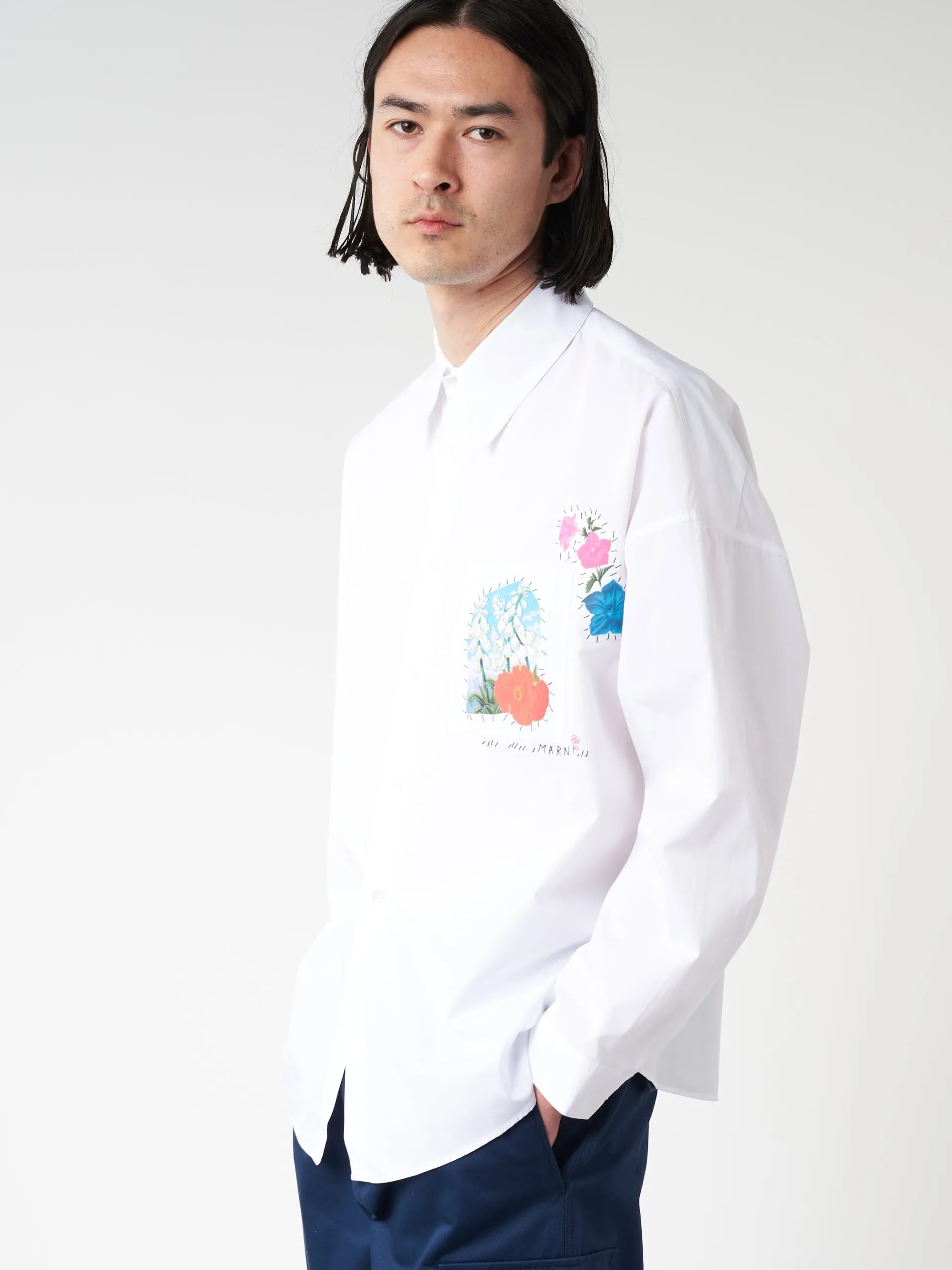 Long-sleeved shirt made from organic cotton poplin. Cut-out flower patches lifted from colourful collage prints. Hand-stitched Marni mending logo with flower detail on the chest pocket.