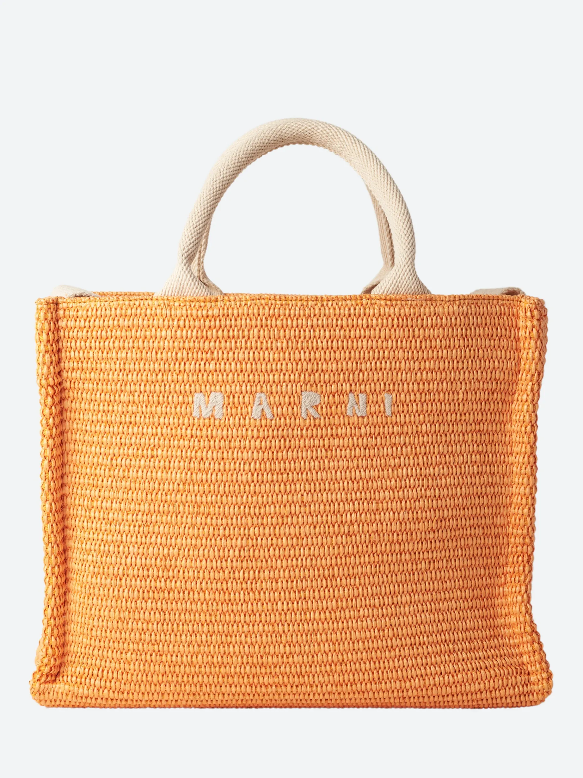 Carry your essentials in style with this raffia basket tote from Marni. Featuring two carry handles, cross body strap, and a zippered interior pocket, complete with an embroidered Marni logo on the front.