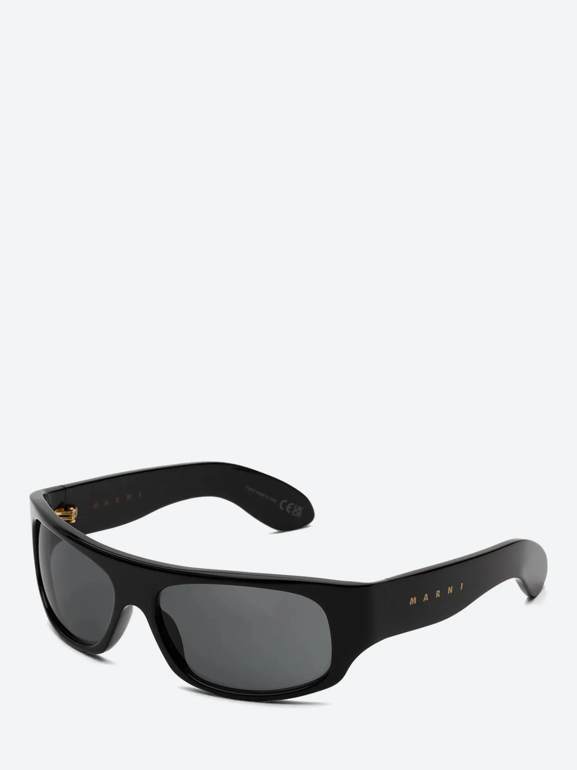 Marni sunglasses with a modern wraparound rectangular shape. Features a gold-tone Marni logo on the outer temple.