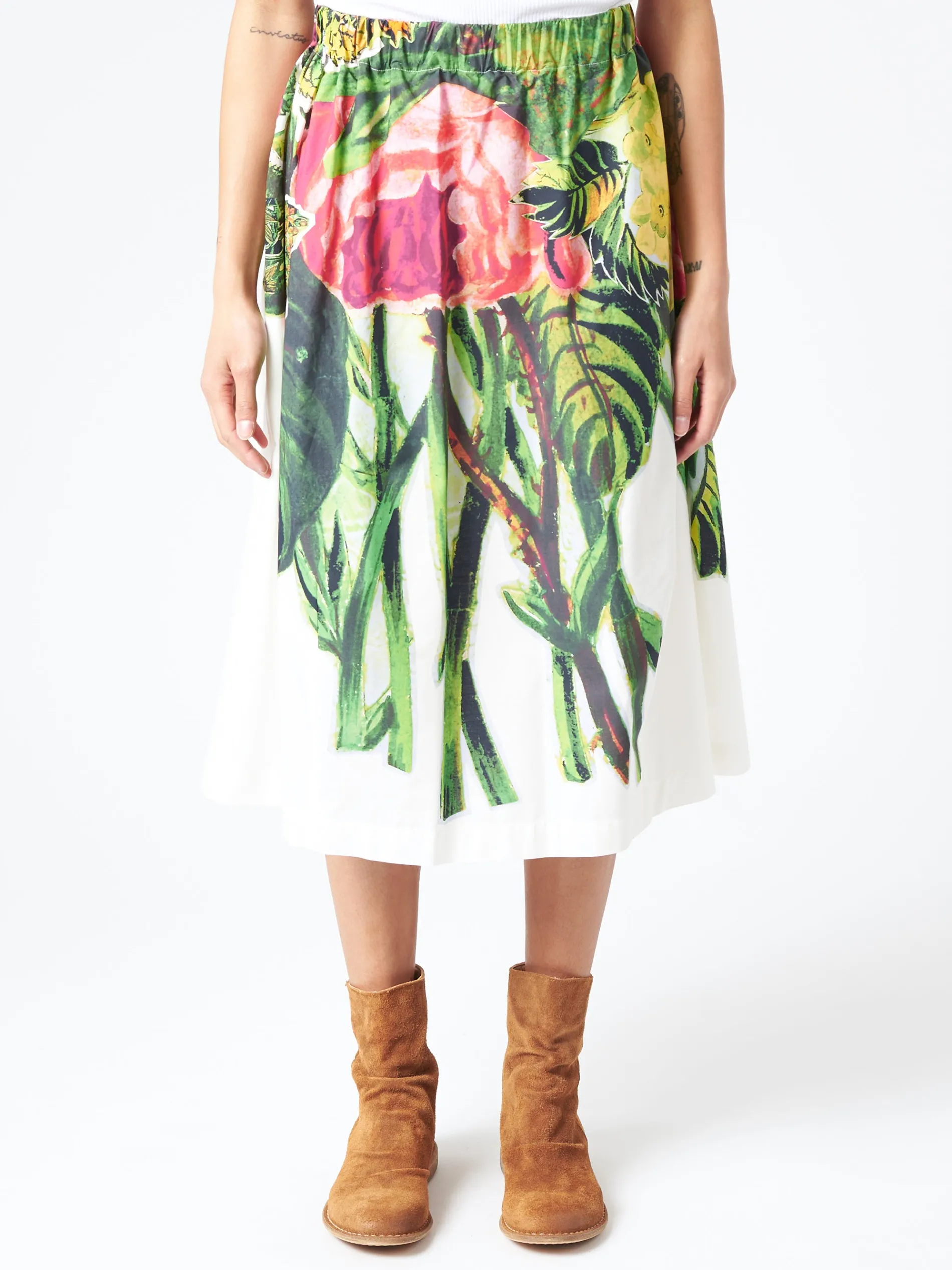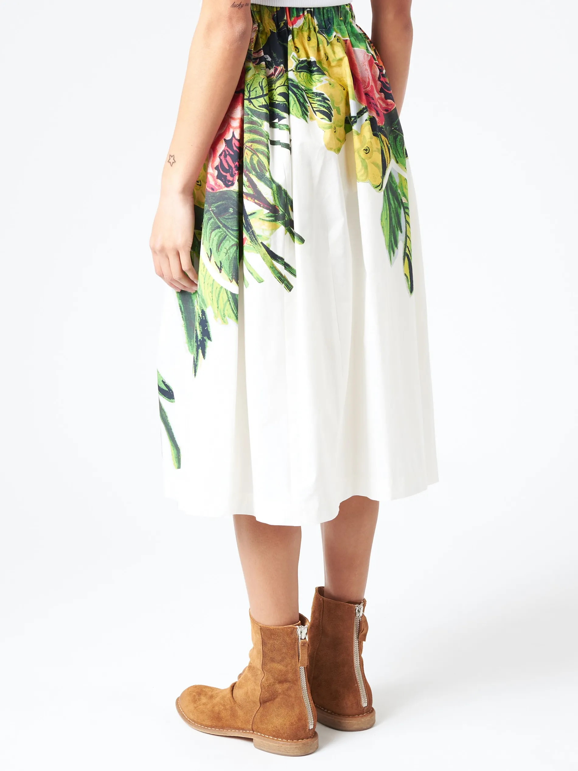 Midi-length A-line skirt made from cotton poplin, featuring a floral print of cut-outs from antique herbarium books.