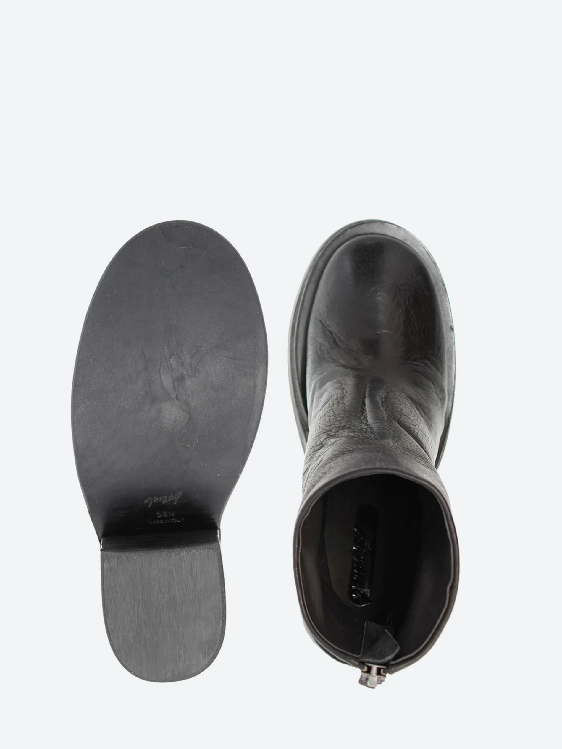 - Back zip closure with leather pull