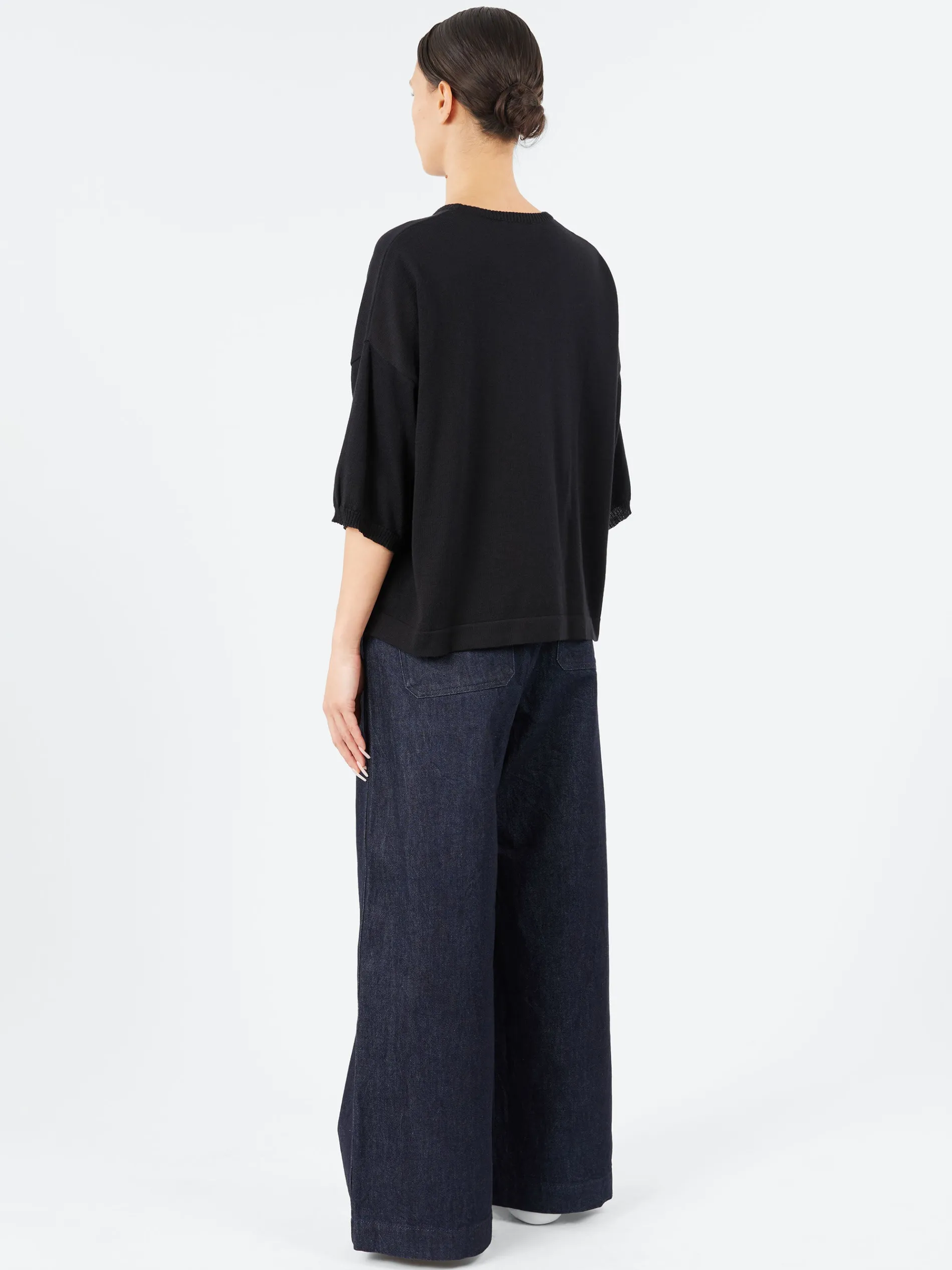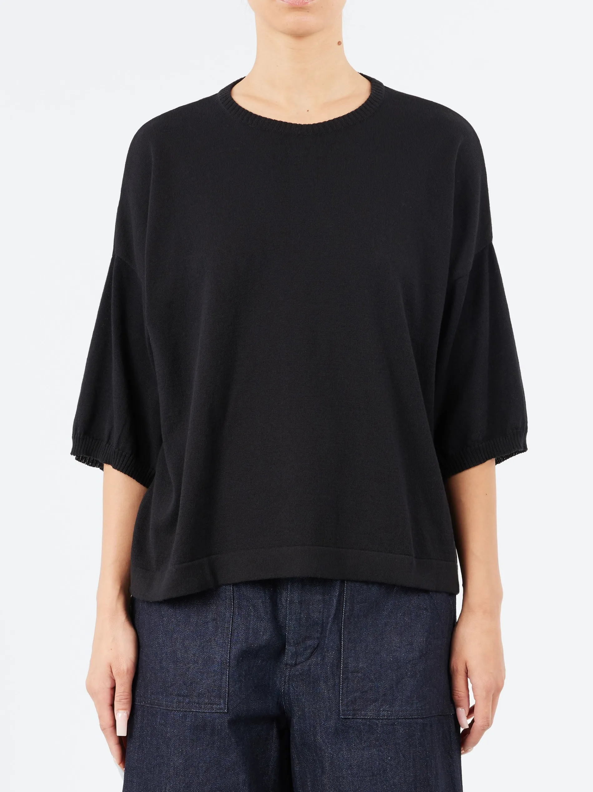 Made in Italy from 100% soft, breathable cotton, this half sleeve crewneck by Ma’ry’ya offers a modern take on casualwear. Featuring a relaxed fit with a straight hemline and minimalist design, it’s perfect for layering or wearing solo. The black hue adds effortless versatility, making it a refined yet comfortable staple for everyday styling.