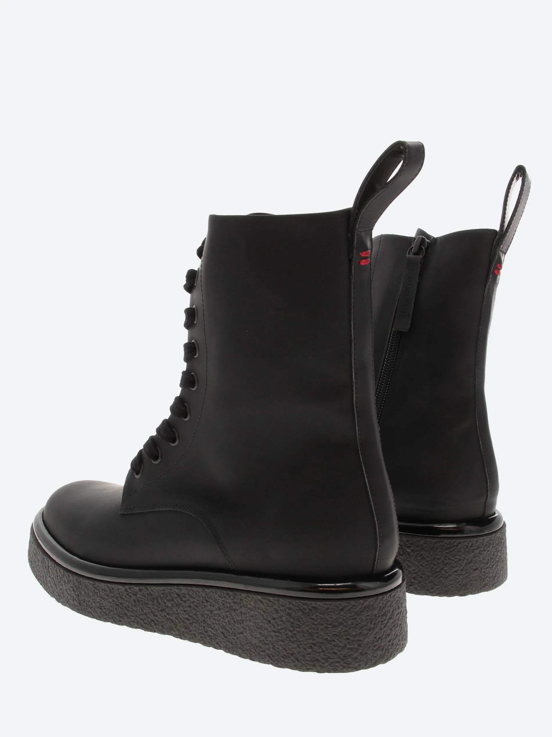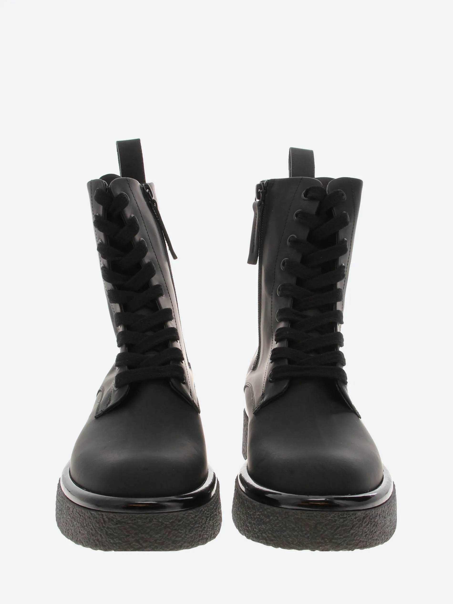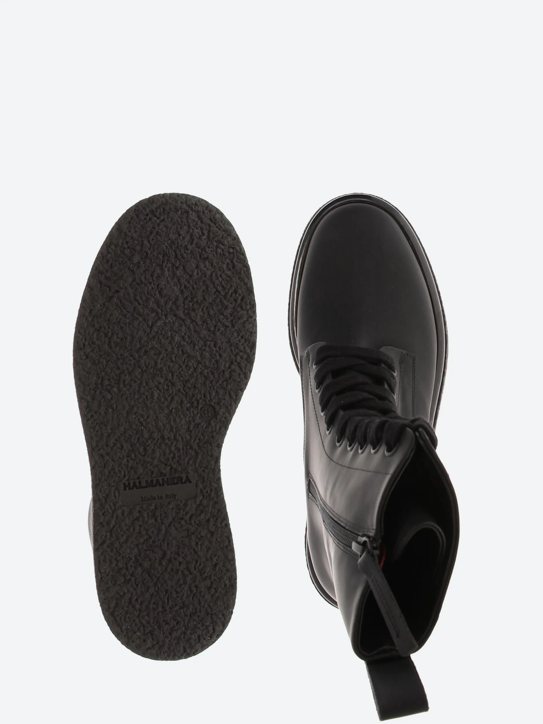 Halmanera combat styled boot in black calf leather. Sits on a personalized crepe sole with a rubber effect.