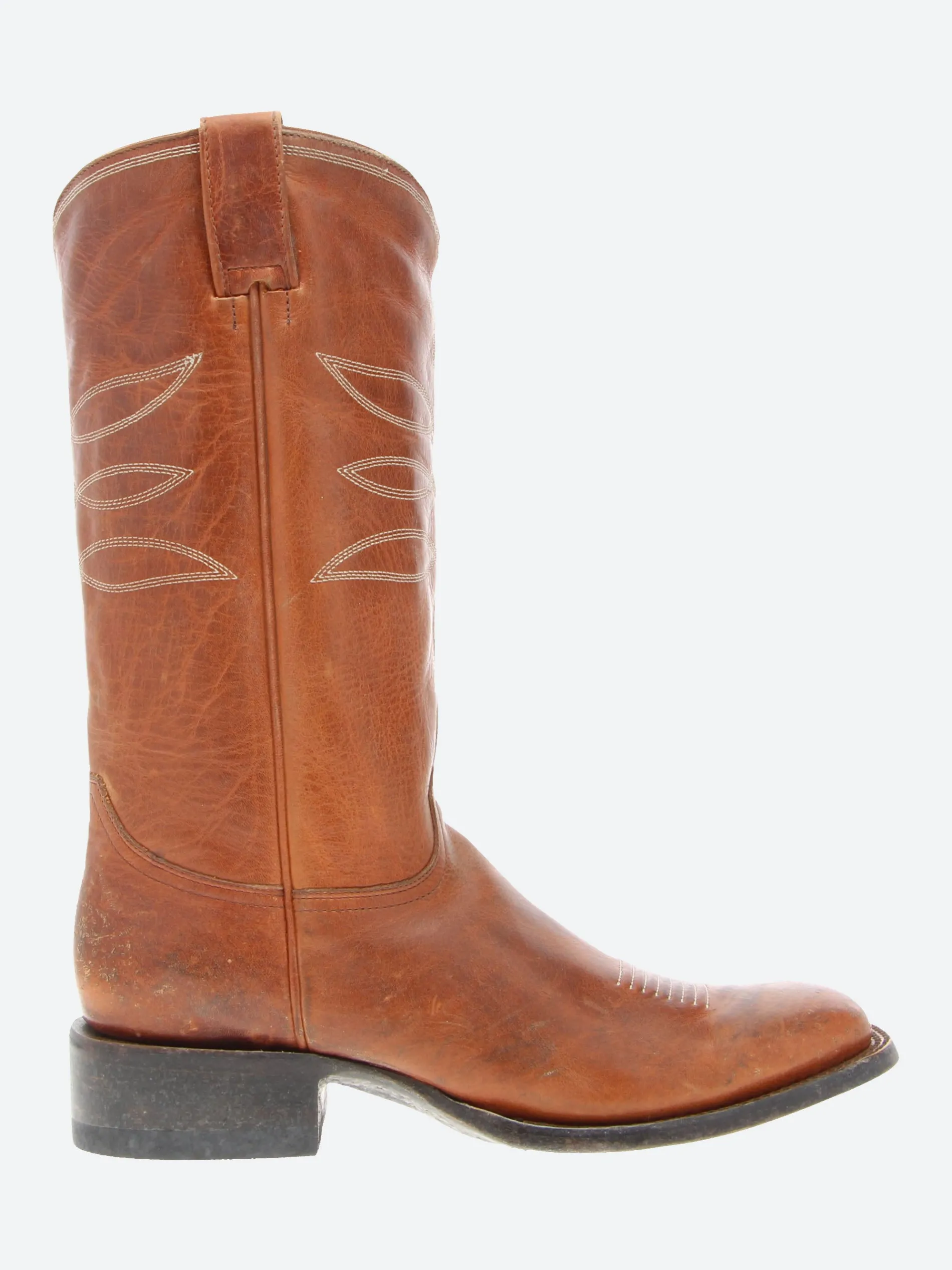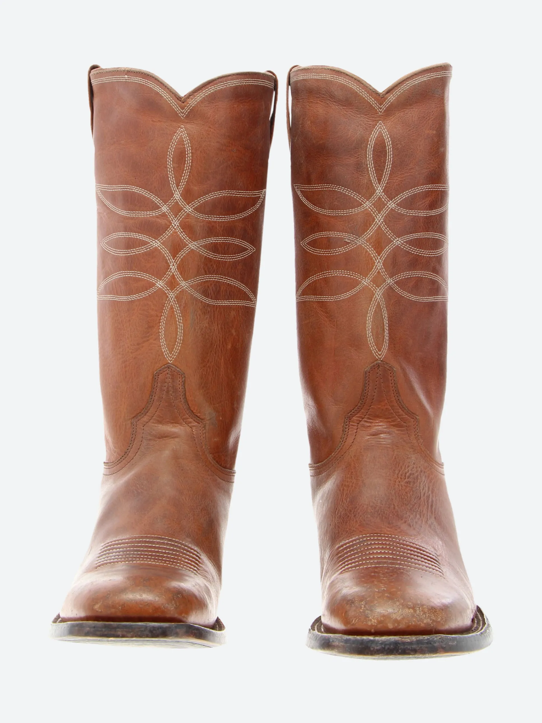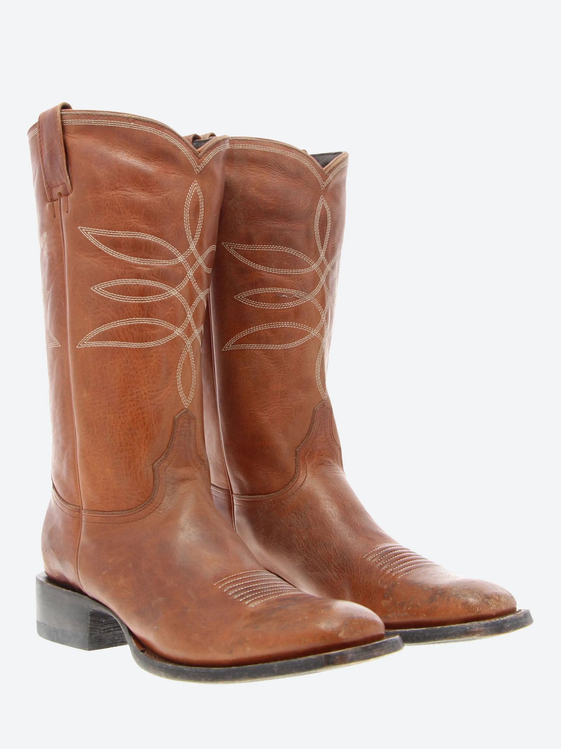 Mexicana tall boots with squared toes in aged saddle cognac brown leather.