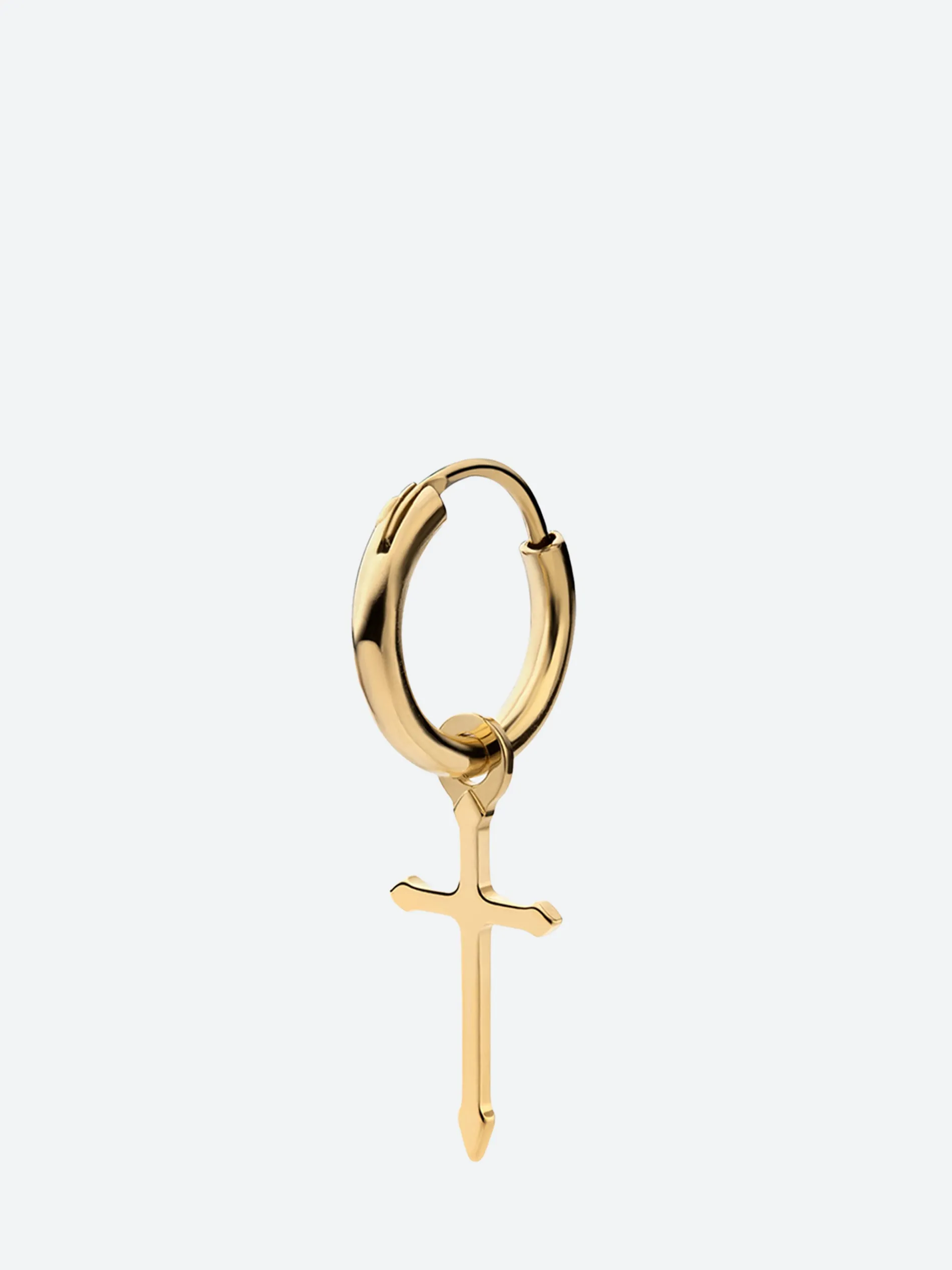 Miansai Crux Huggie features a round hoop with a single cross floating from the bottom. Crafted in gold vermeil, this singular earring adds a touch of cool to a modernized classic.