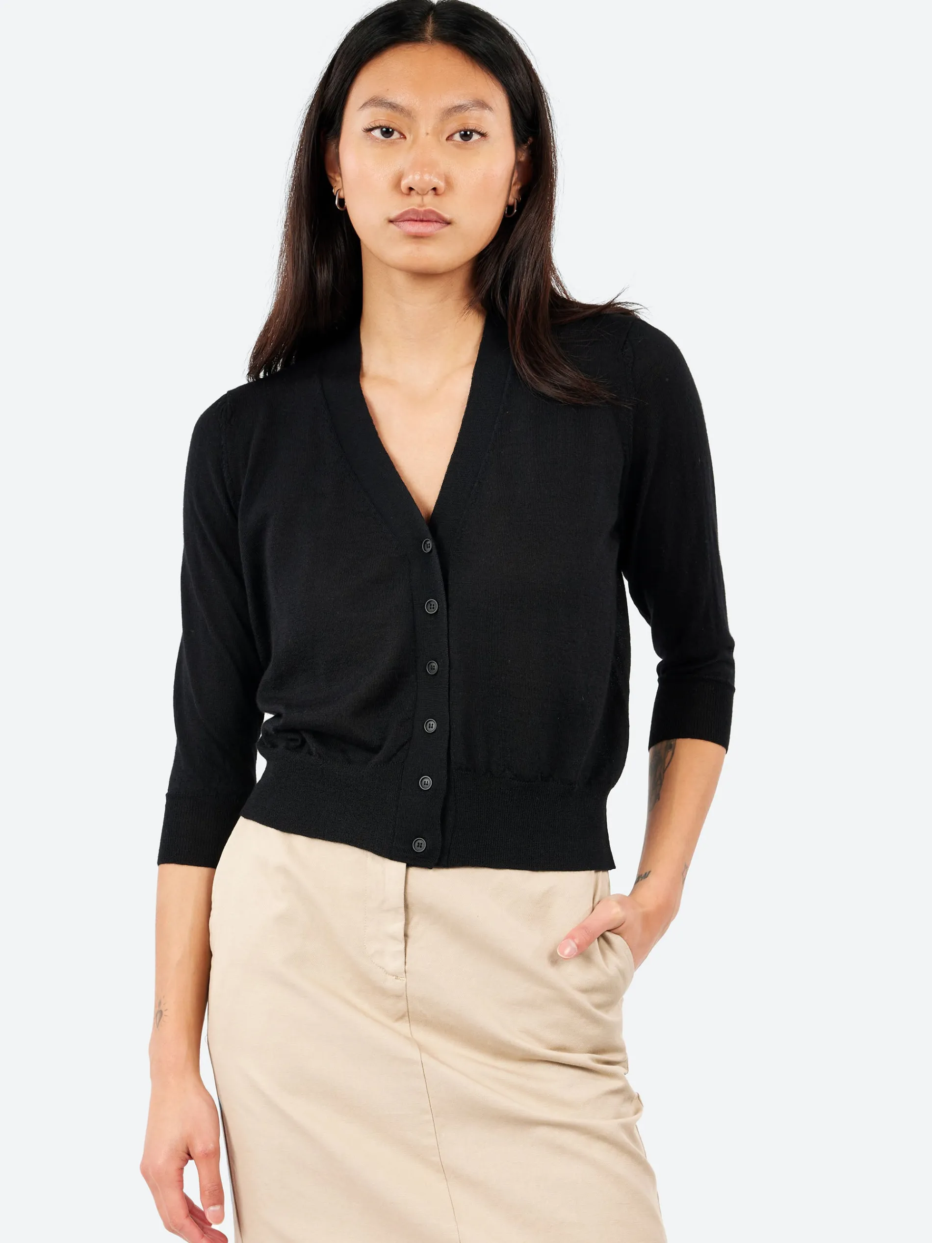 This cardigan, crafted from premium cashmere, strikes the perfect balance between lightweight comfort and refined sophistication. Its hue adds a versatile elegance, making it easy to pair with any outfit.