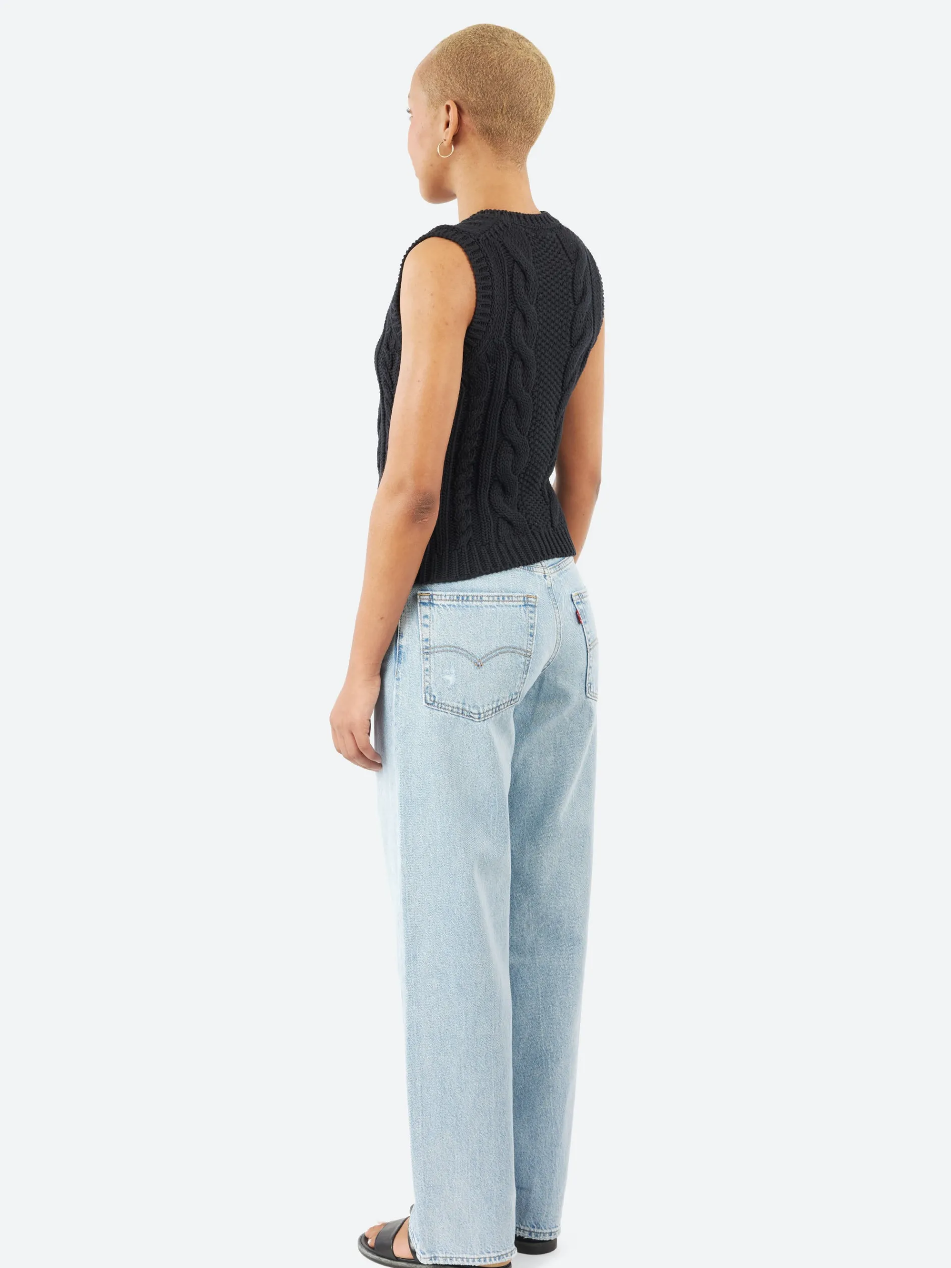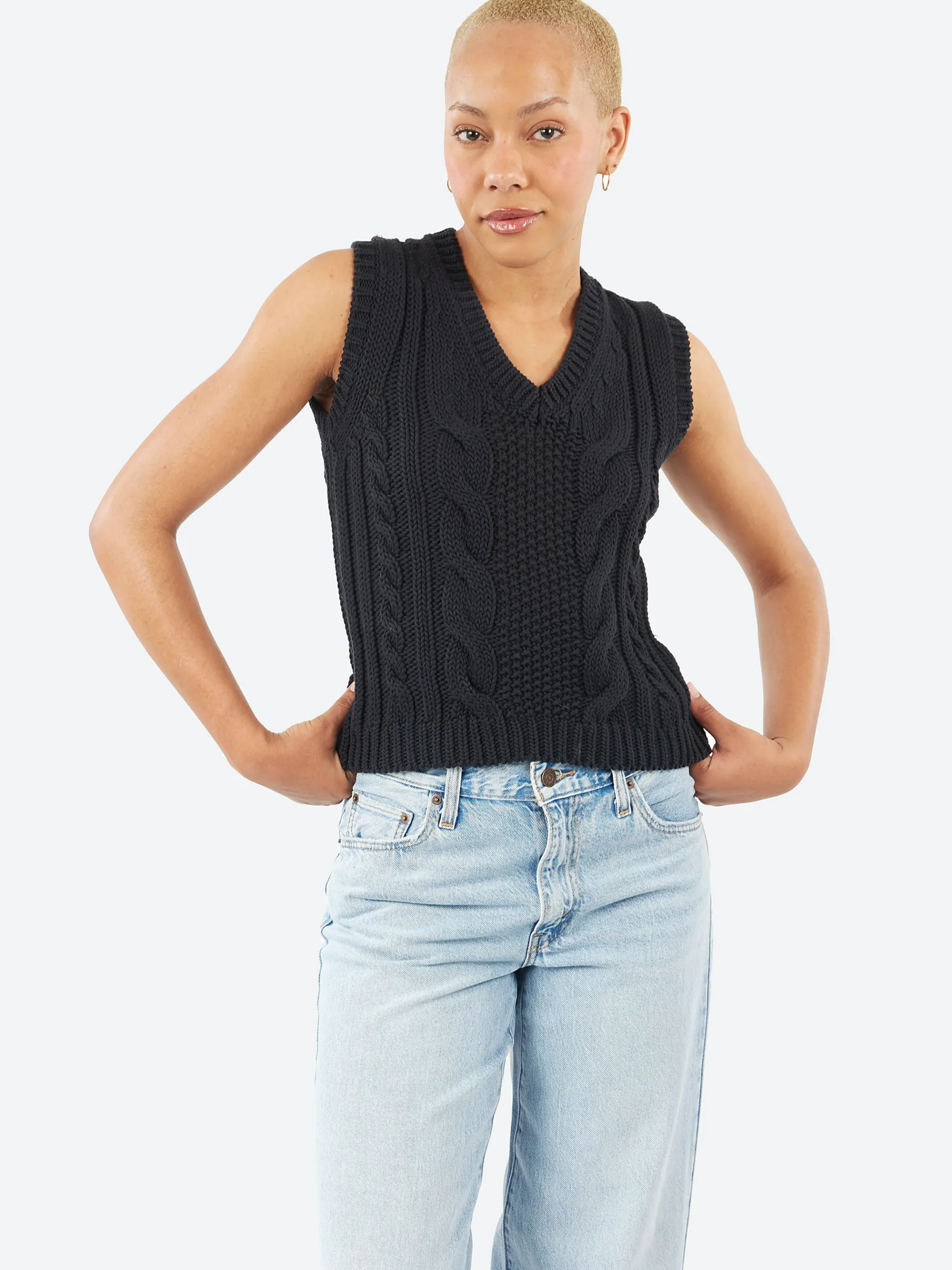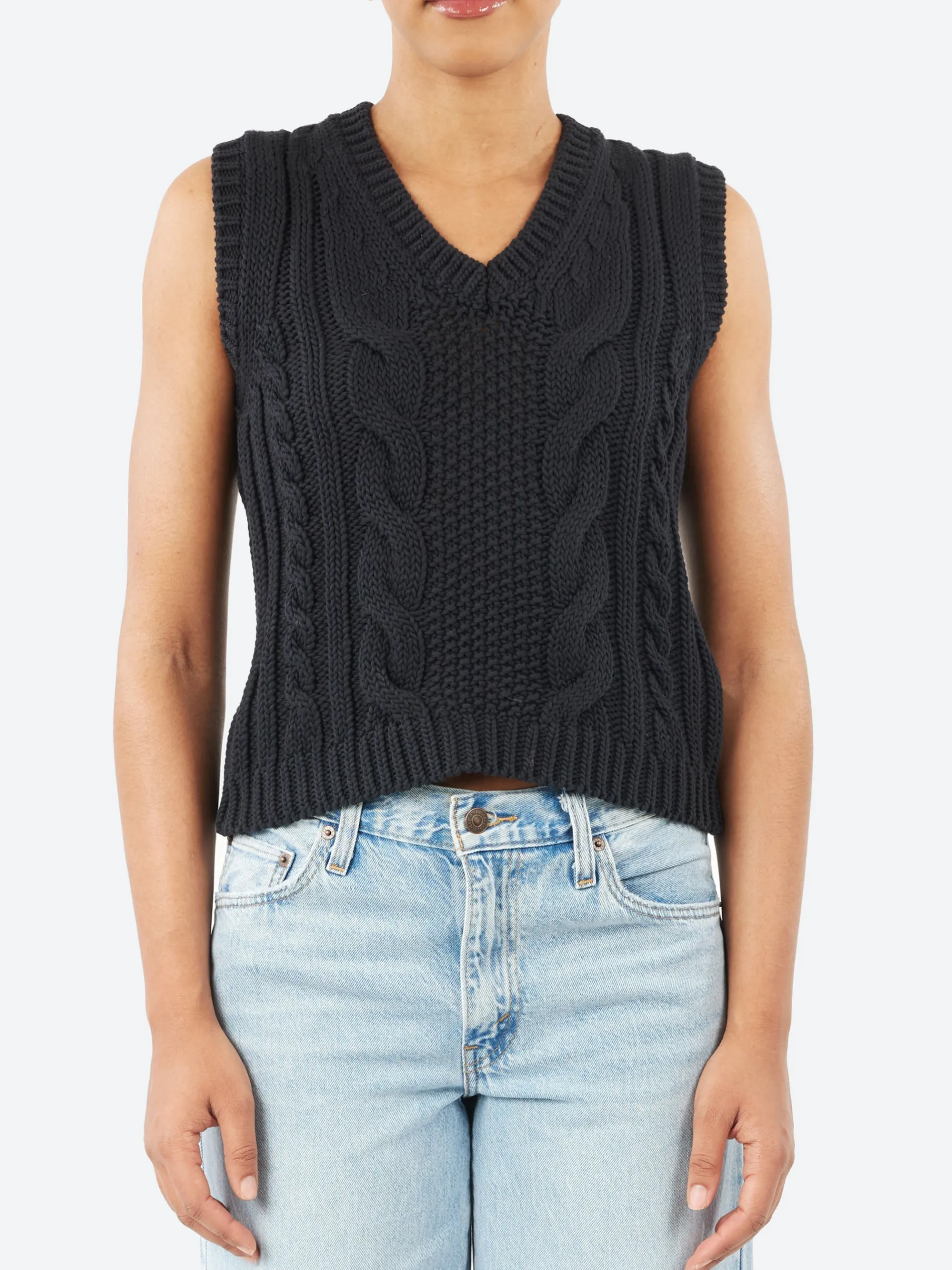 MJ Watson’s Cable Knit Vest is made from soft cotton and features a classic V-neck design. This sleeveless pullover offers a timeless, textured cable knit pattern, making it a versatile and stylish layering piece for any wardrobe.