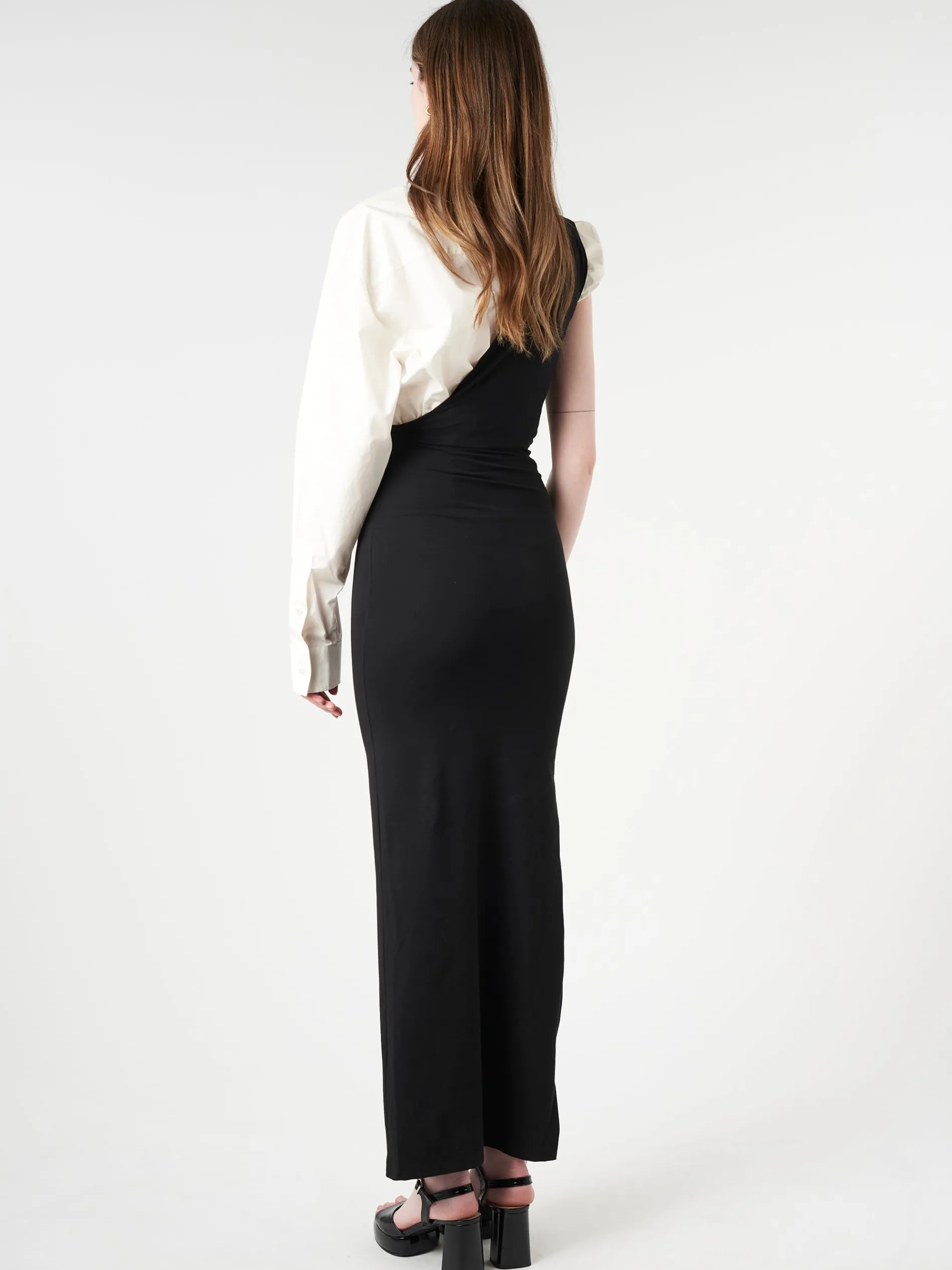 Shaped to a maxi length, MM6’s deconstructed, paneled dress is cut from cotton poplin and elastane. The brand’s discreet yet distinct signature, a horizontal line of white stitches, is found on the back.
