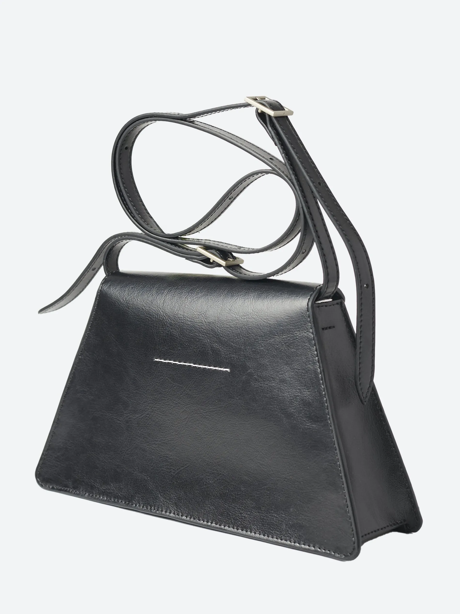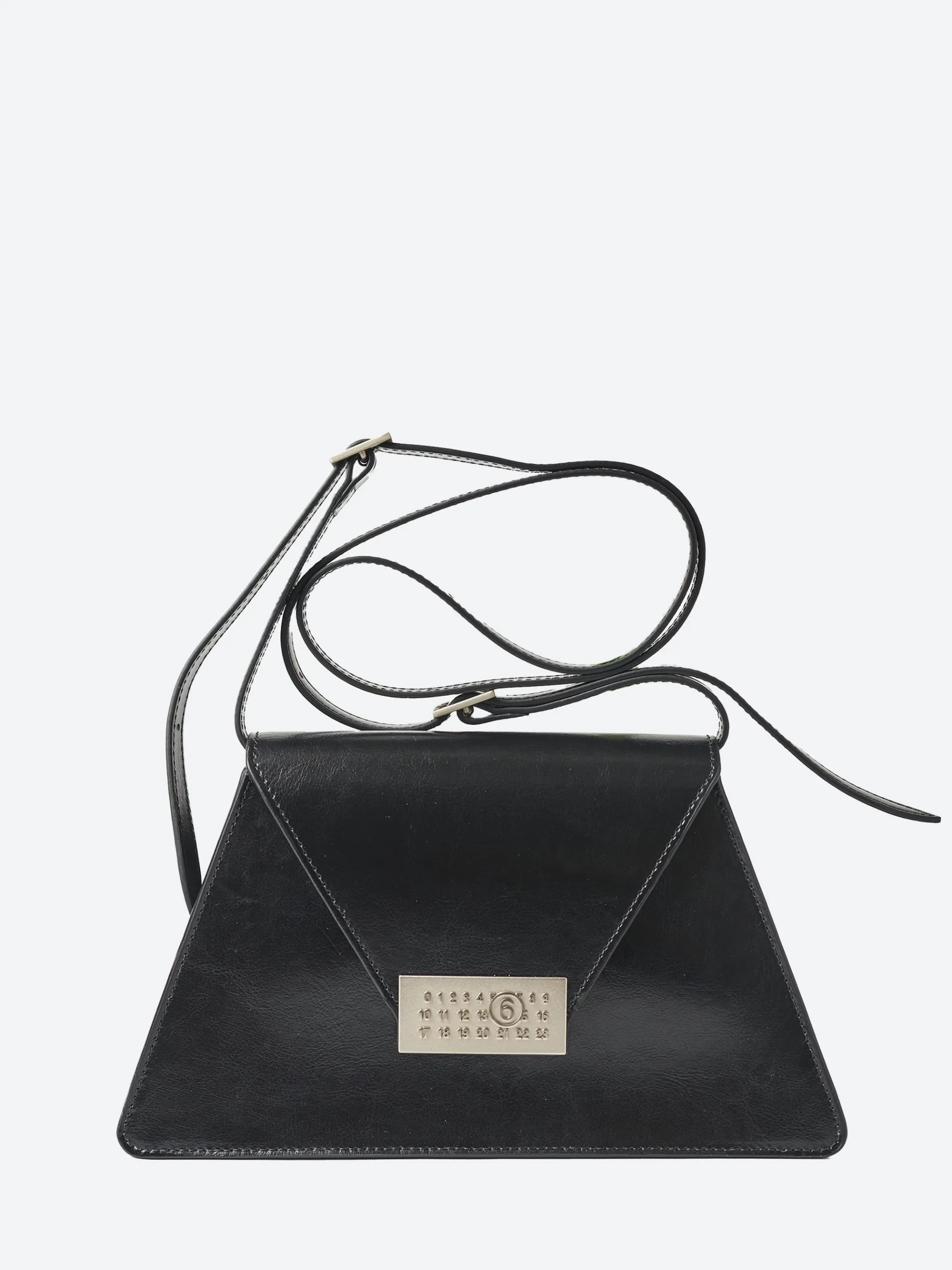 MM6 Numeric medium crossbody bag in black leather. The distinctive triangular flap design is inspired by the Japanese art of paper folding, origami, with the brand’s signature numeric design on the buckle. This dual-wear bag can be worn crossbody or carried by hand as a clutch with its adjustable shoulder strap.