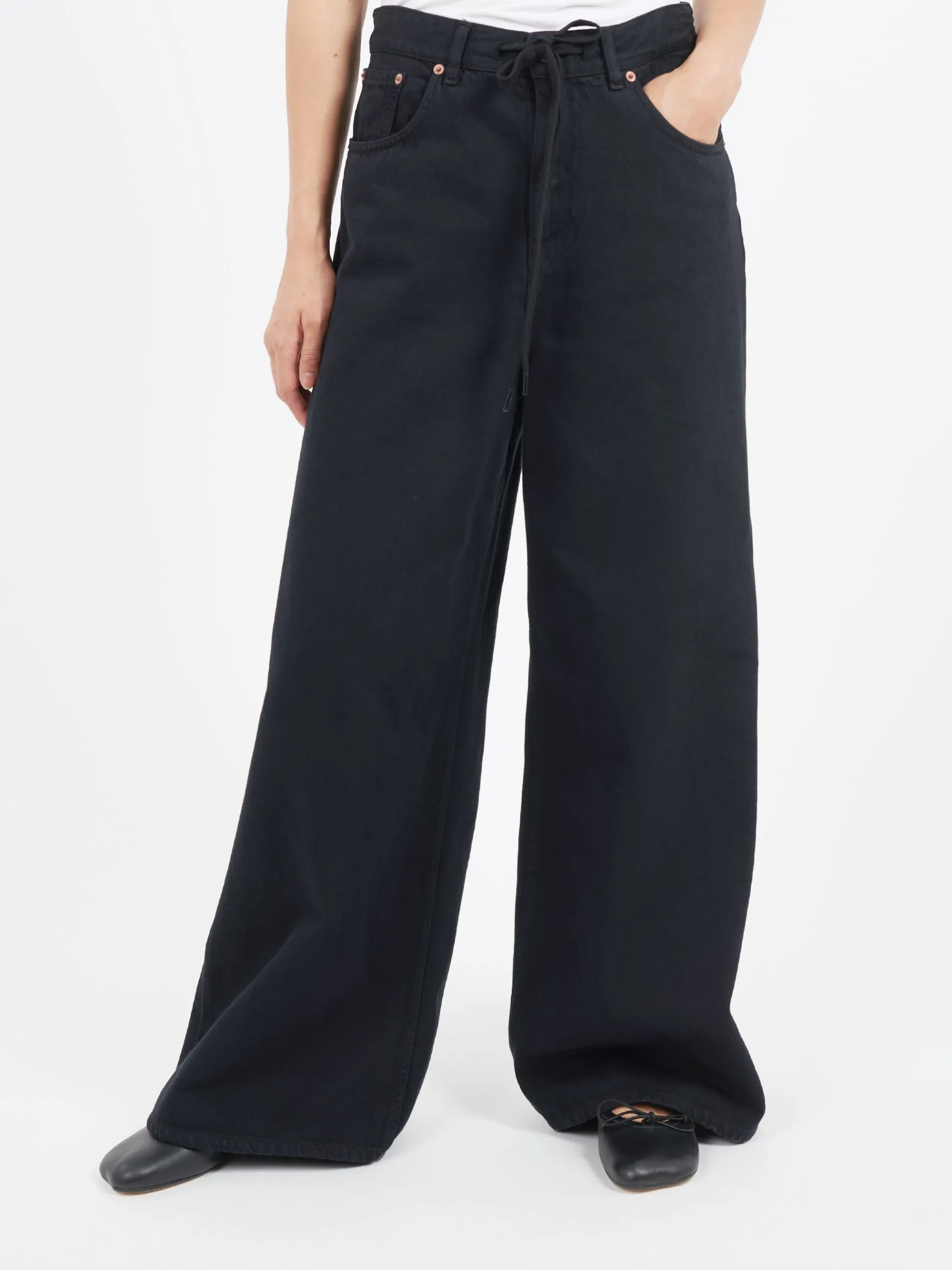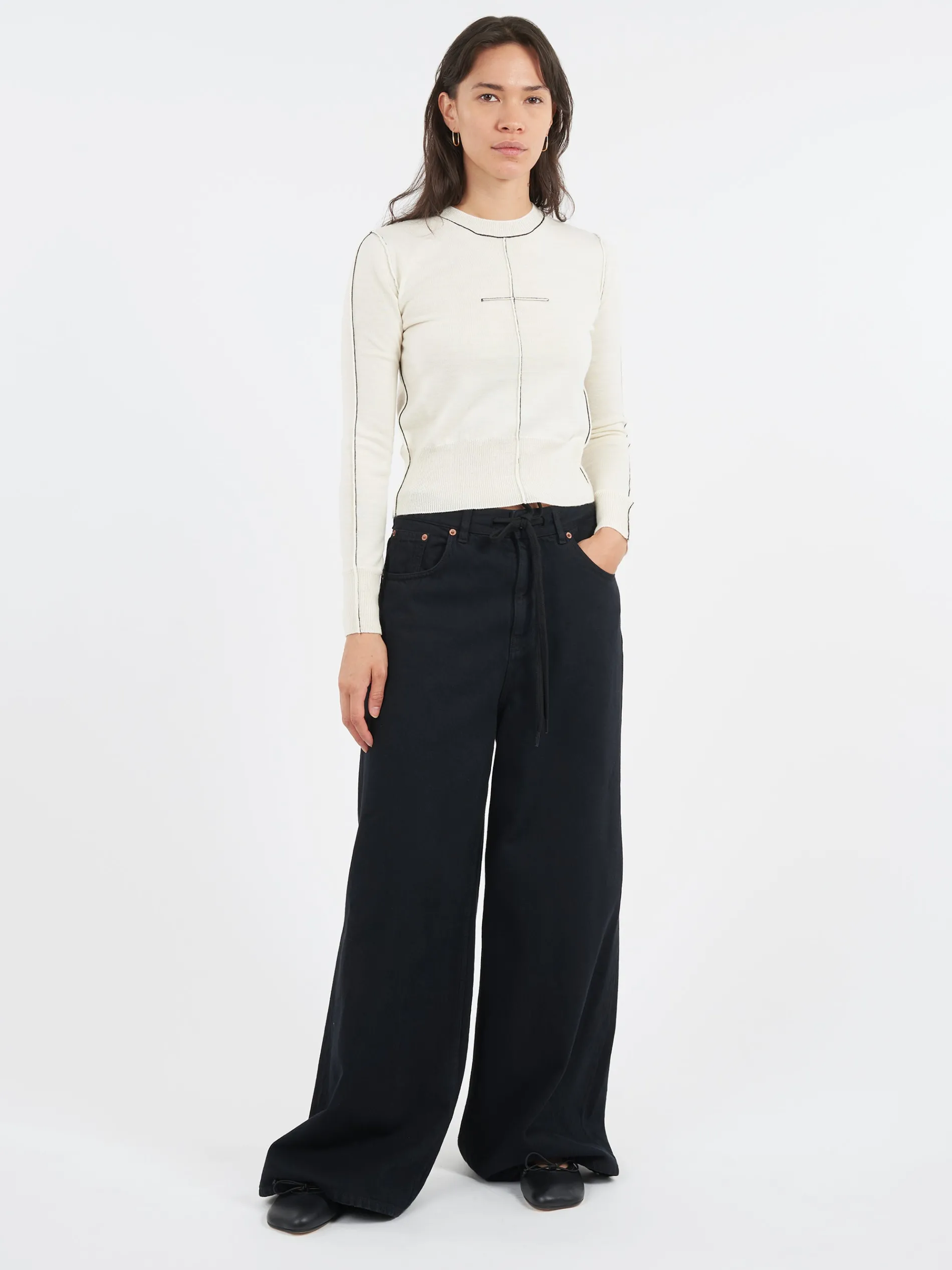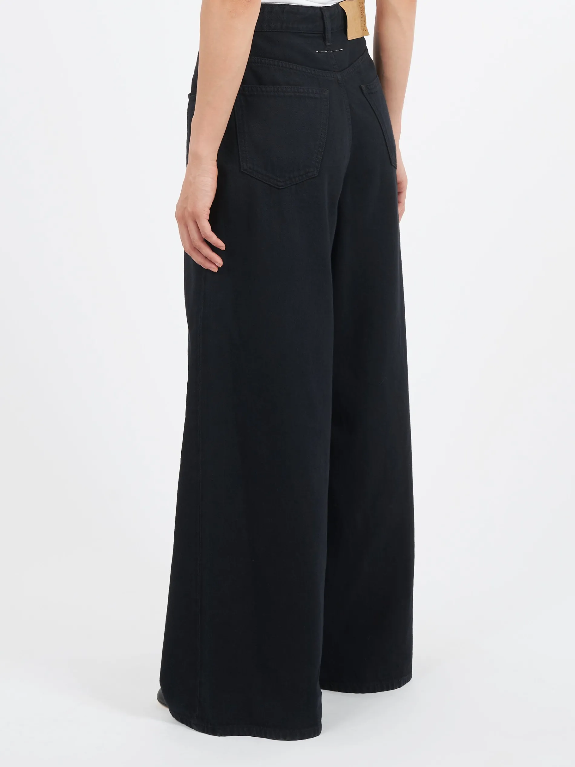 MM6’s low-rise trousers are crafted from cotton denim with a loose fit and wide leg. The style is Made in Italy and characterized by button and drawstring closure and belt loops. The brand’s discreet yet distinct signature, a horizontal line of white stitches, is found on the back of the garment, along with the numeric signature jacron label.