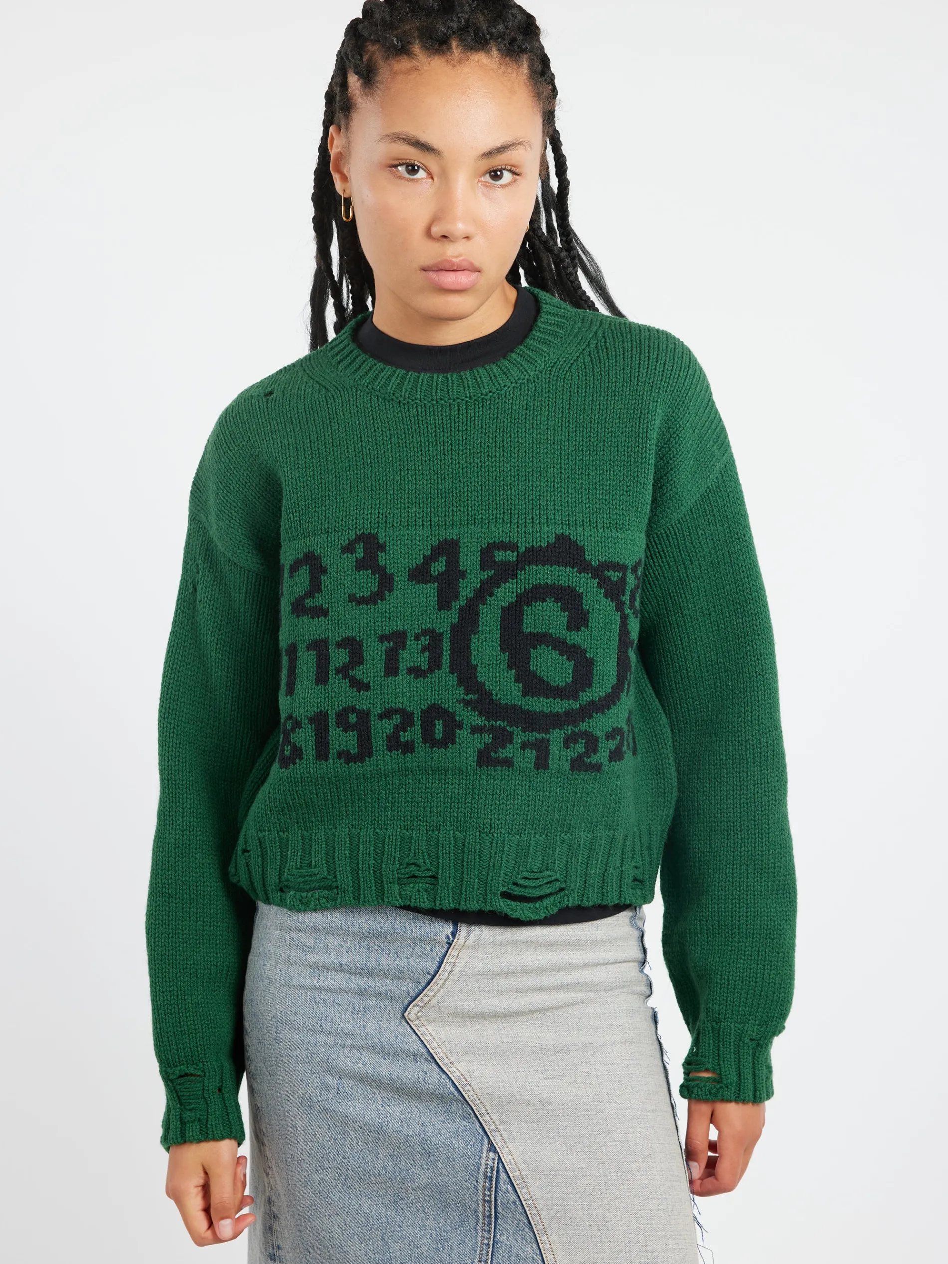 A crewneck jumper showcasing an abstract aesthetic with distressed details and ribbed trims. Adorned with MM6’s numeric signature on the front, it comprises a blend of punk inspiration and deconstructive elements. The Maison’s subtle white stitch line at the back completes its avant-garde appeal.