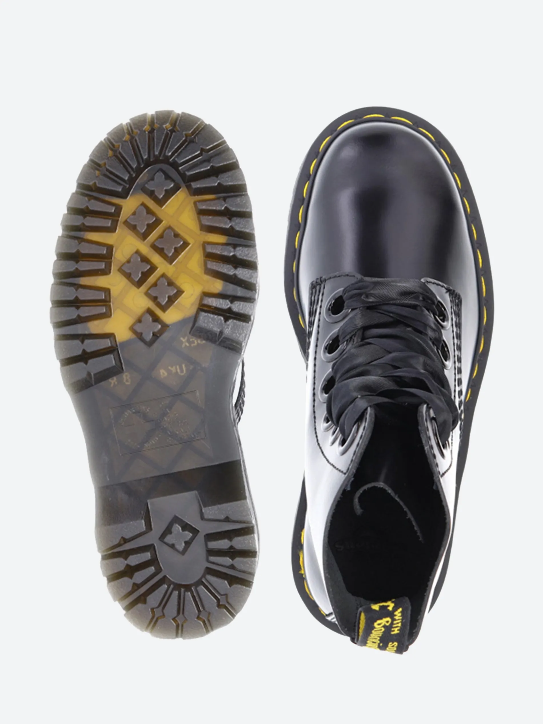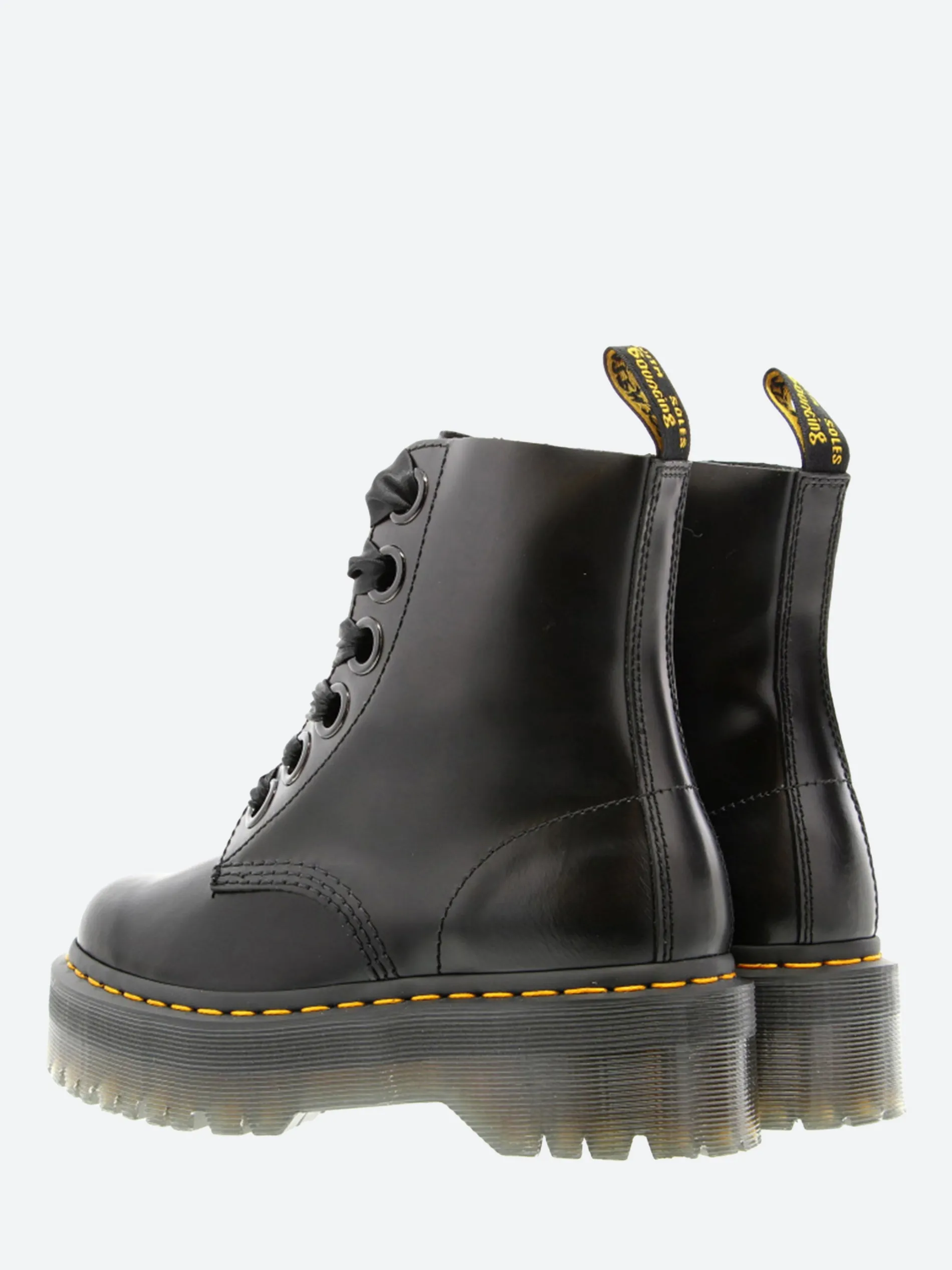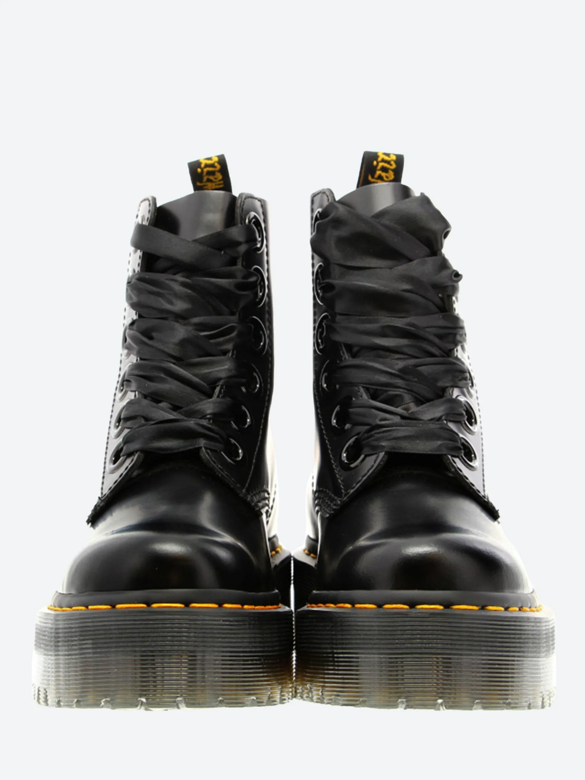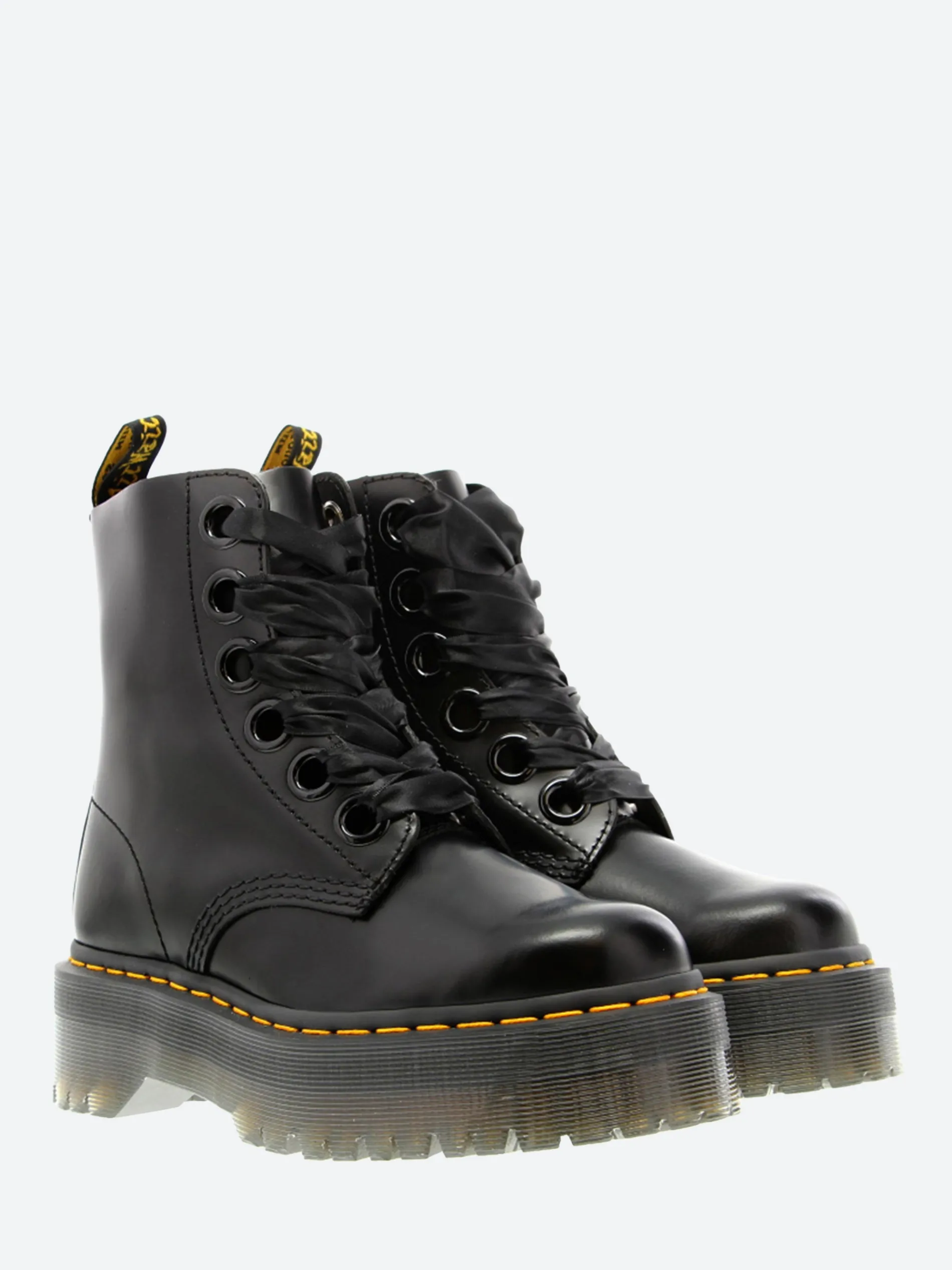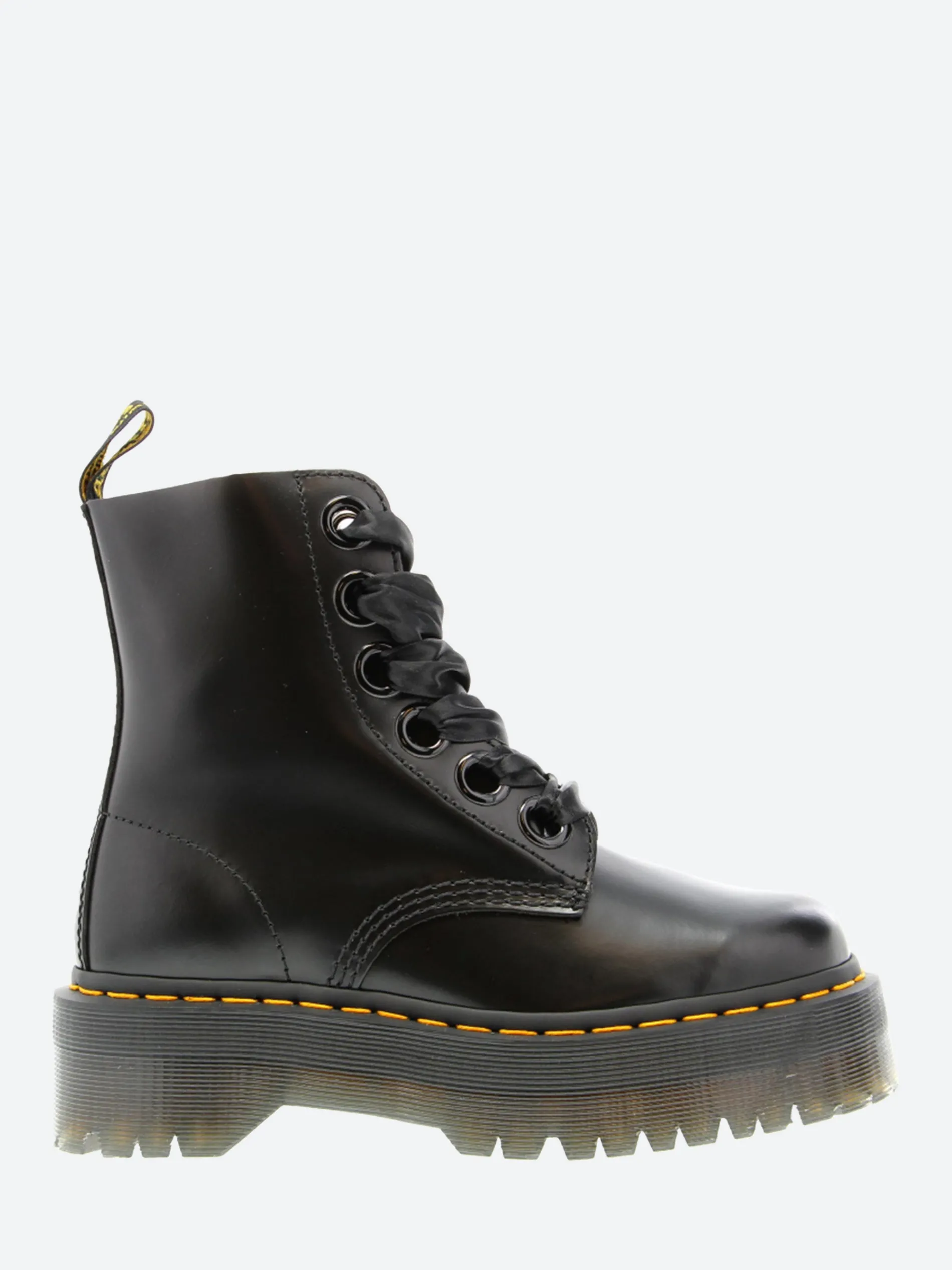 Dr. Martens Molly boot with a towering double-height commando sole and crafted from supple, satin-gloss leather. Finished with oversized eyelets with ribbon laces.