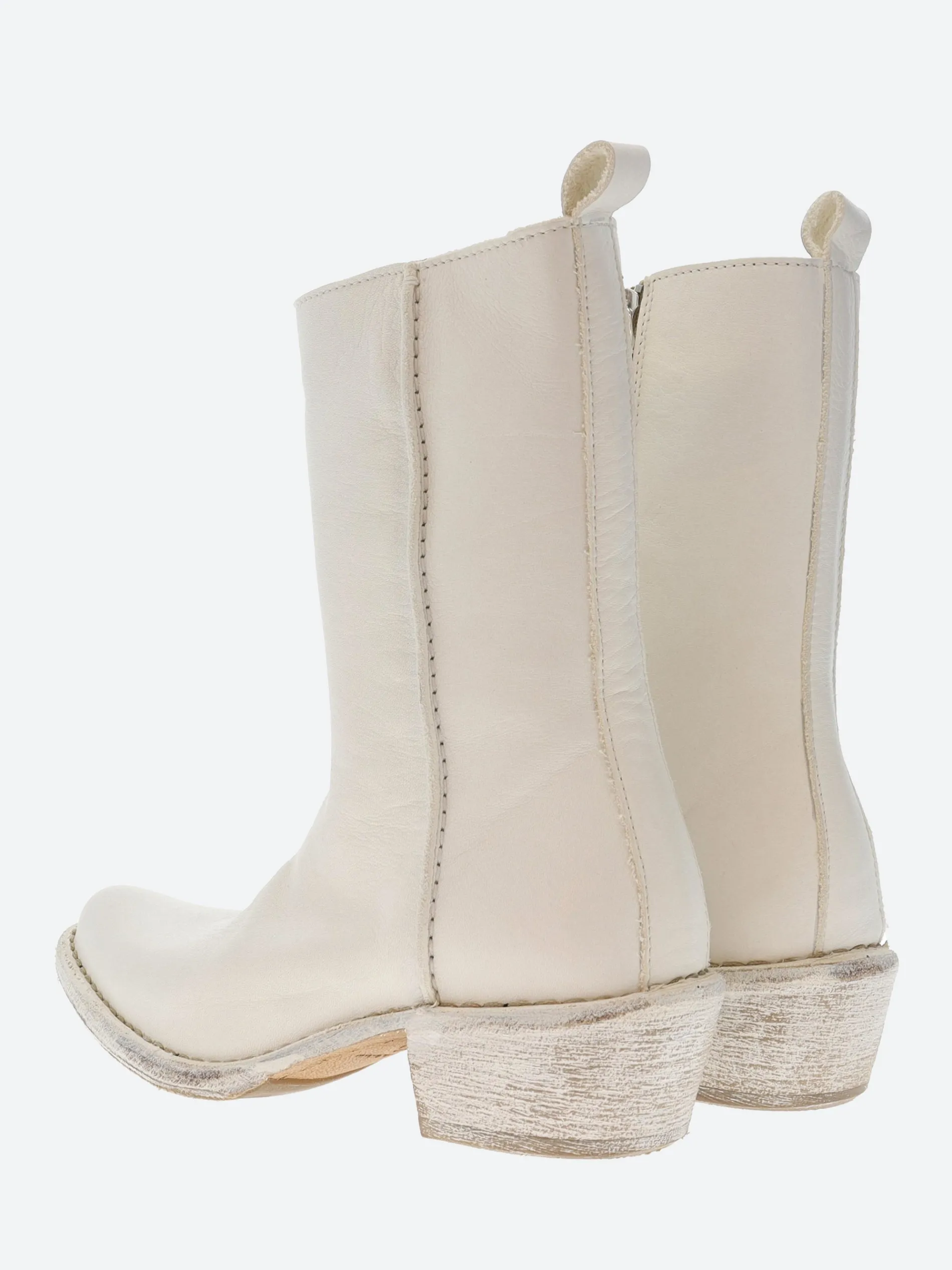 A timeless western-inspired leather boot with exposed inner zip closure, set on a stacked heel.