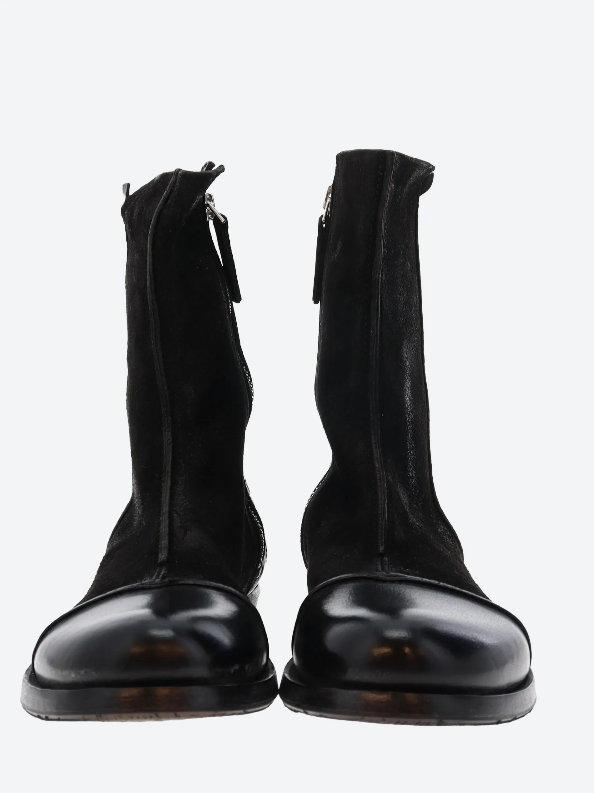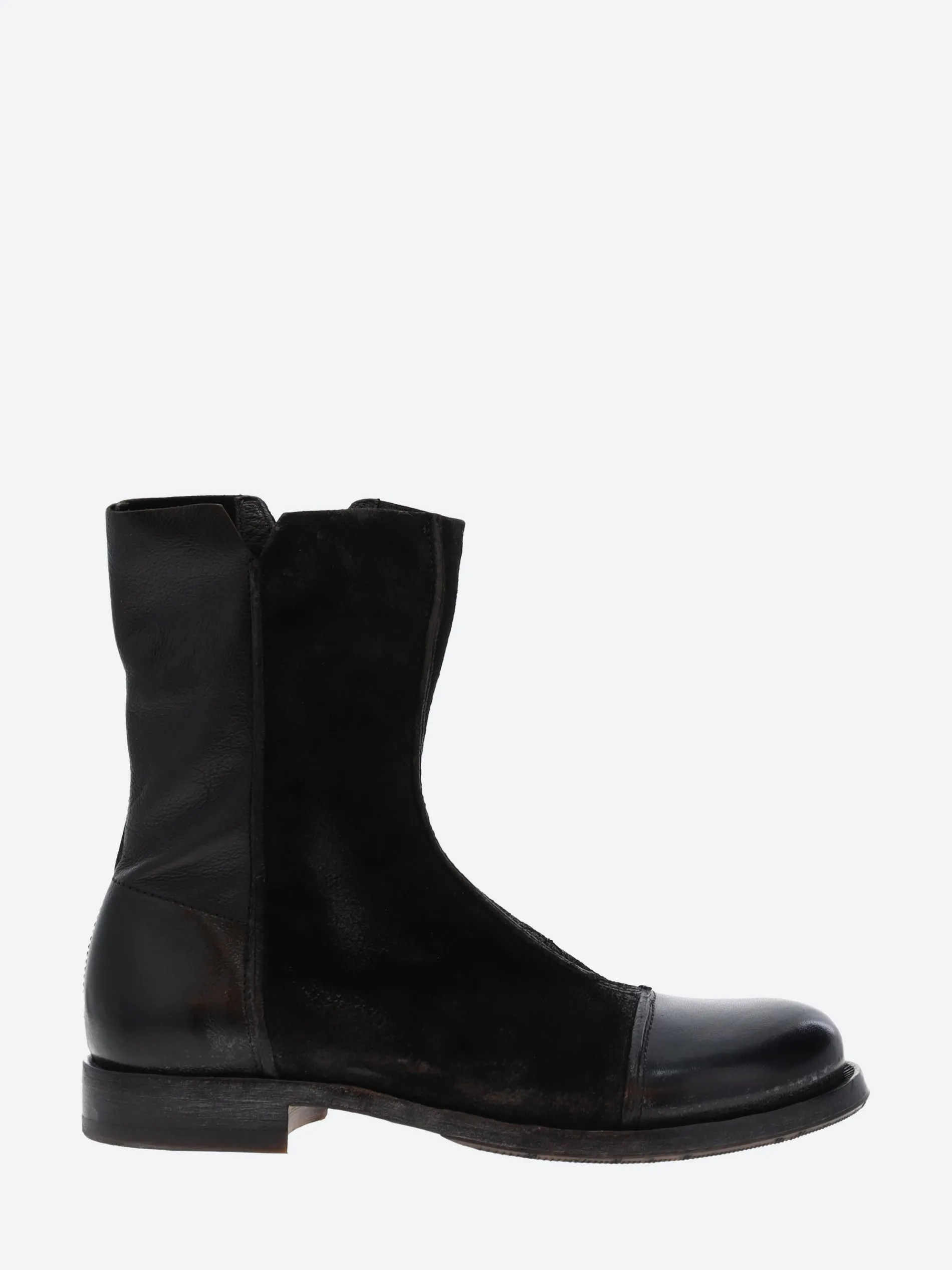 A timeless pull-on leather boot with exposed inner zip closure, set on a slight heel.