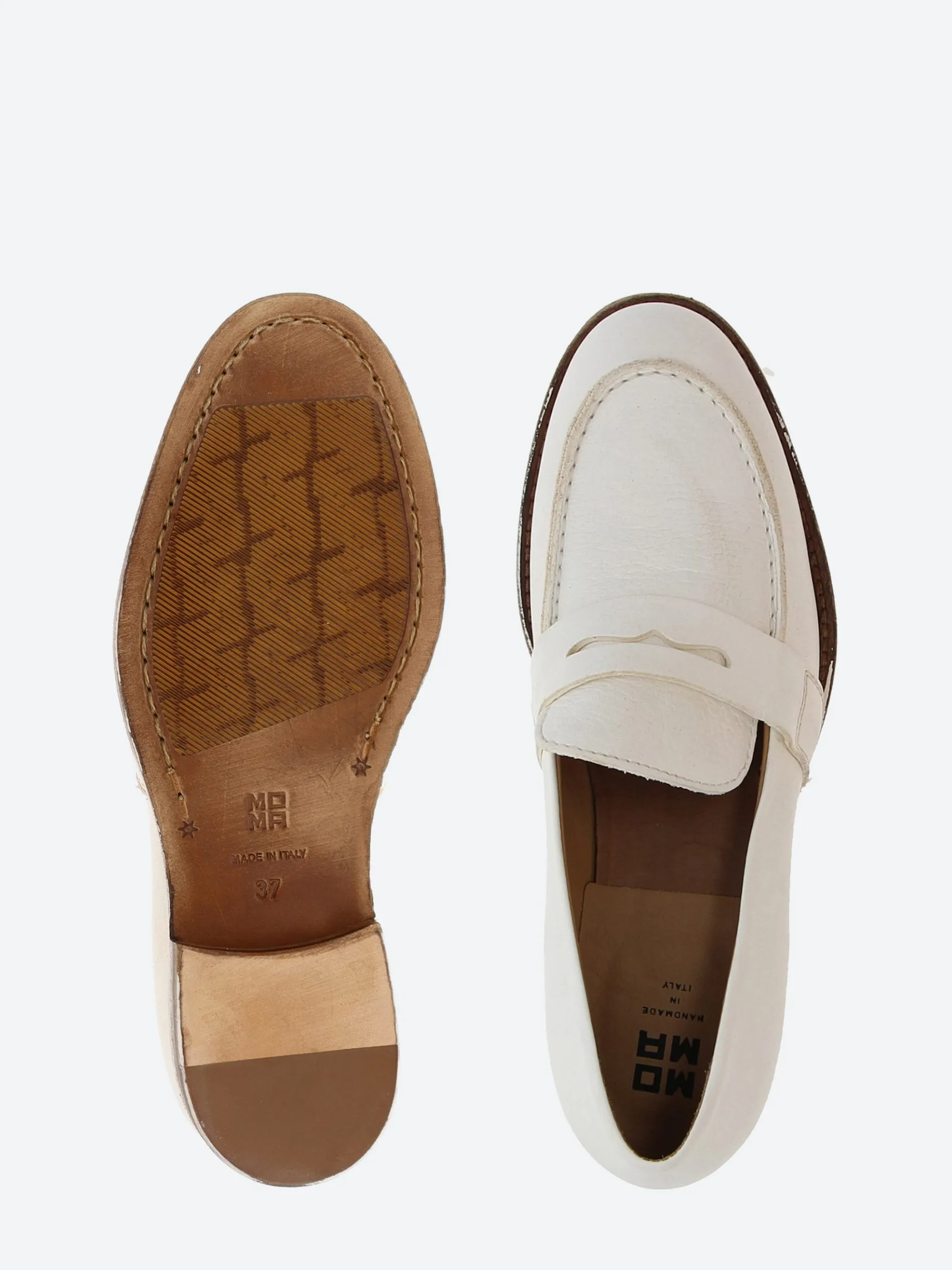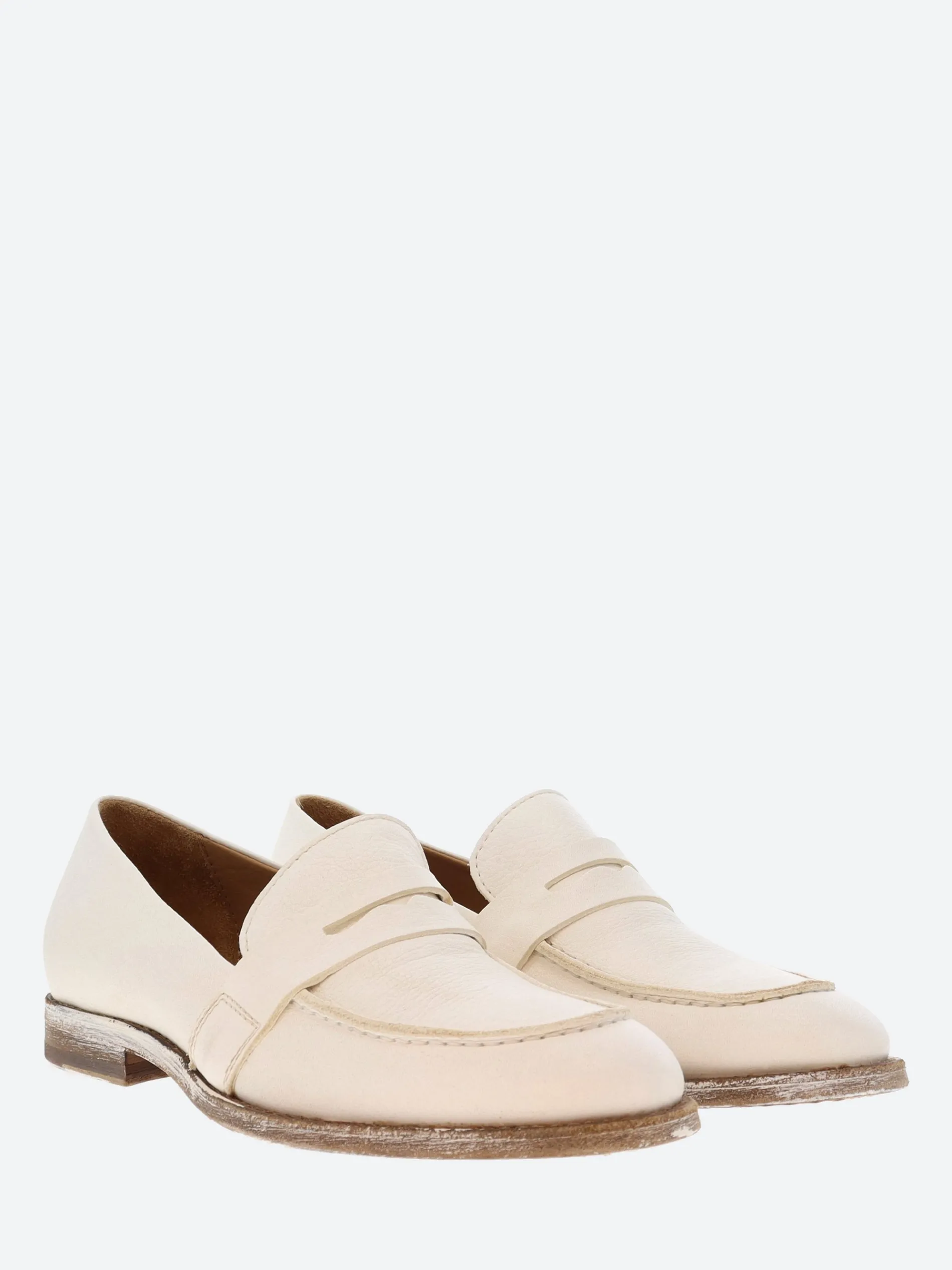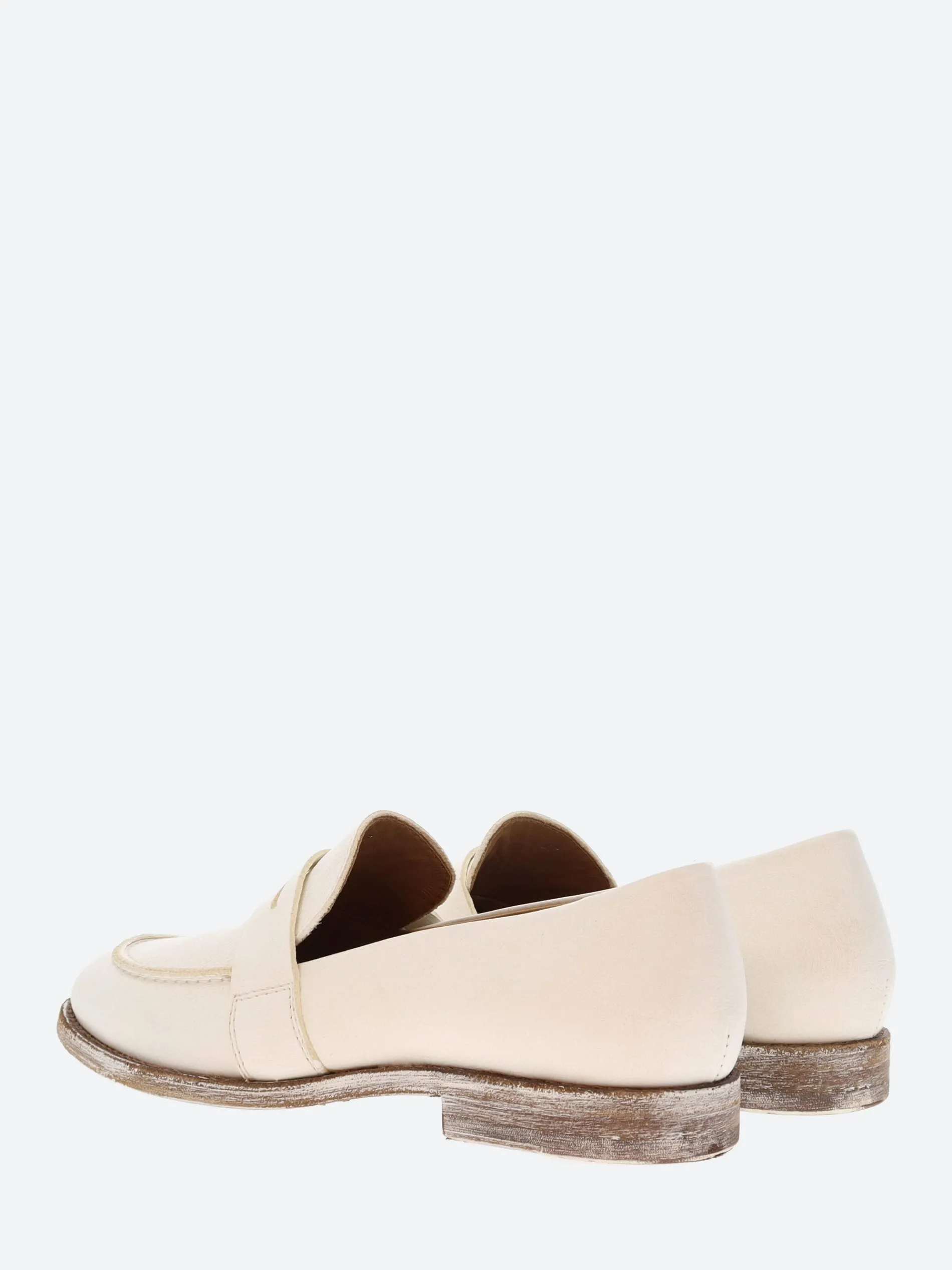 A classic penny loafer set on a slight, paint-scuffed heel.