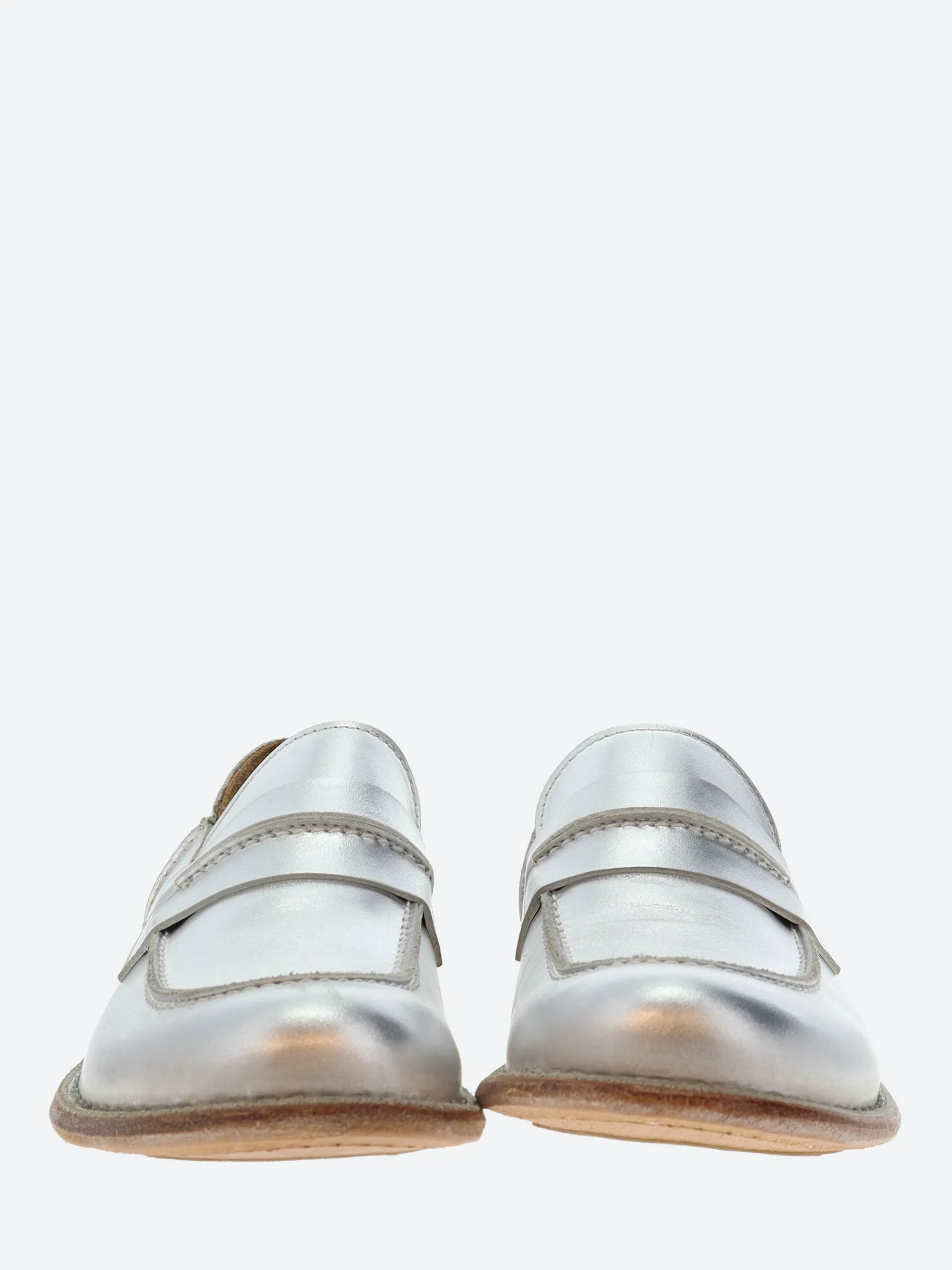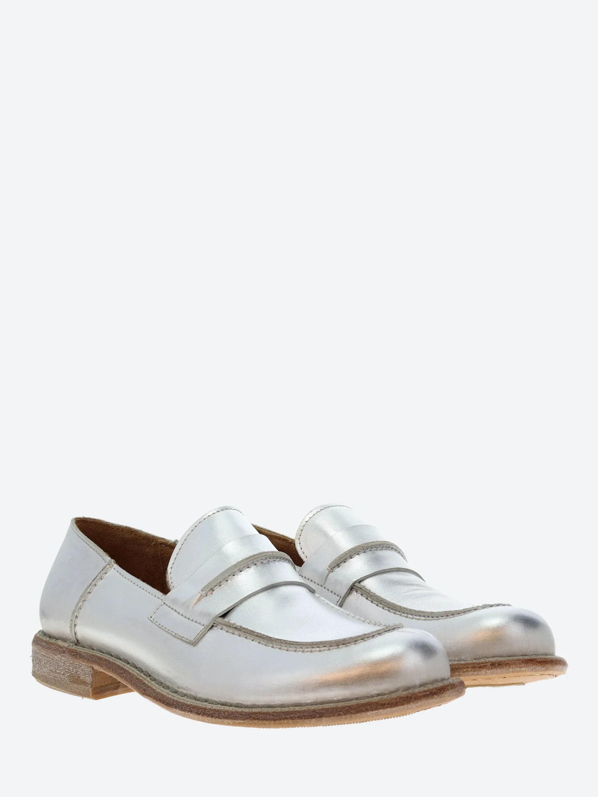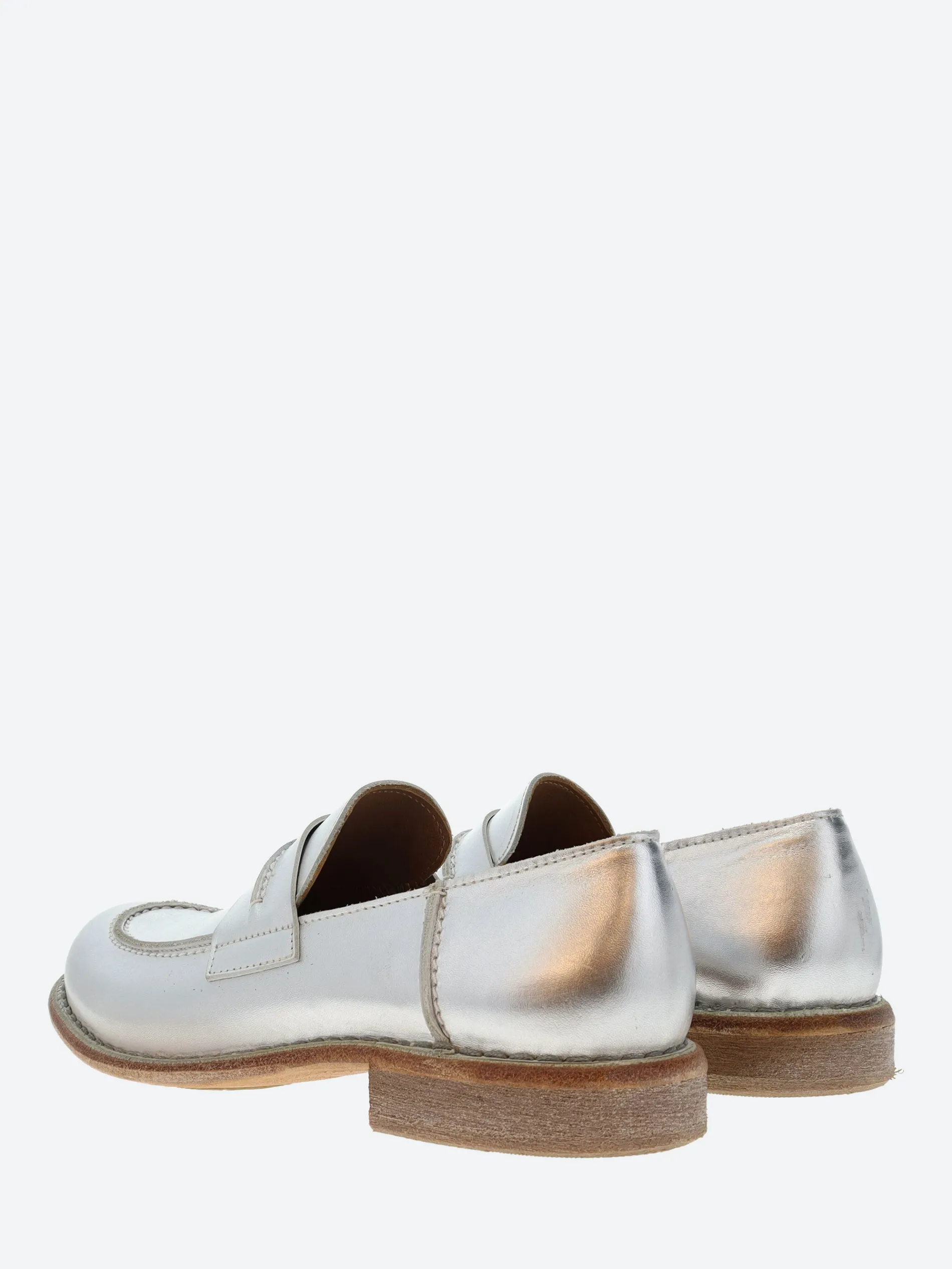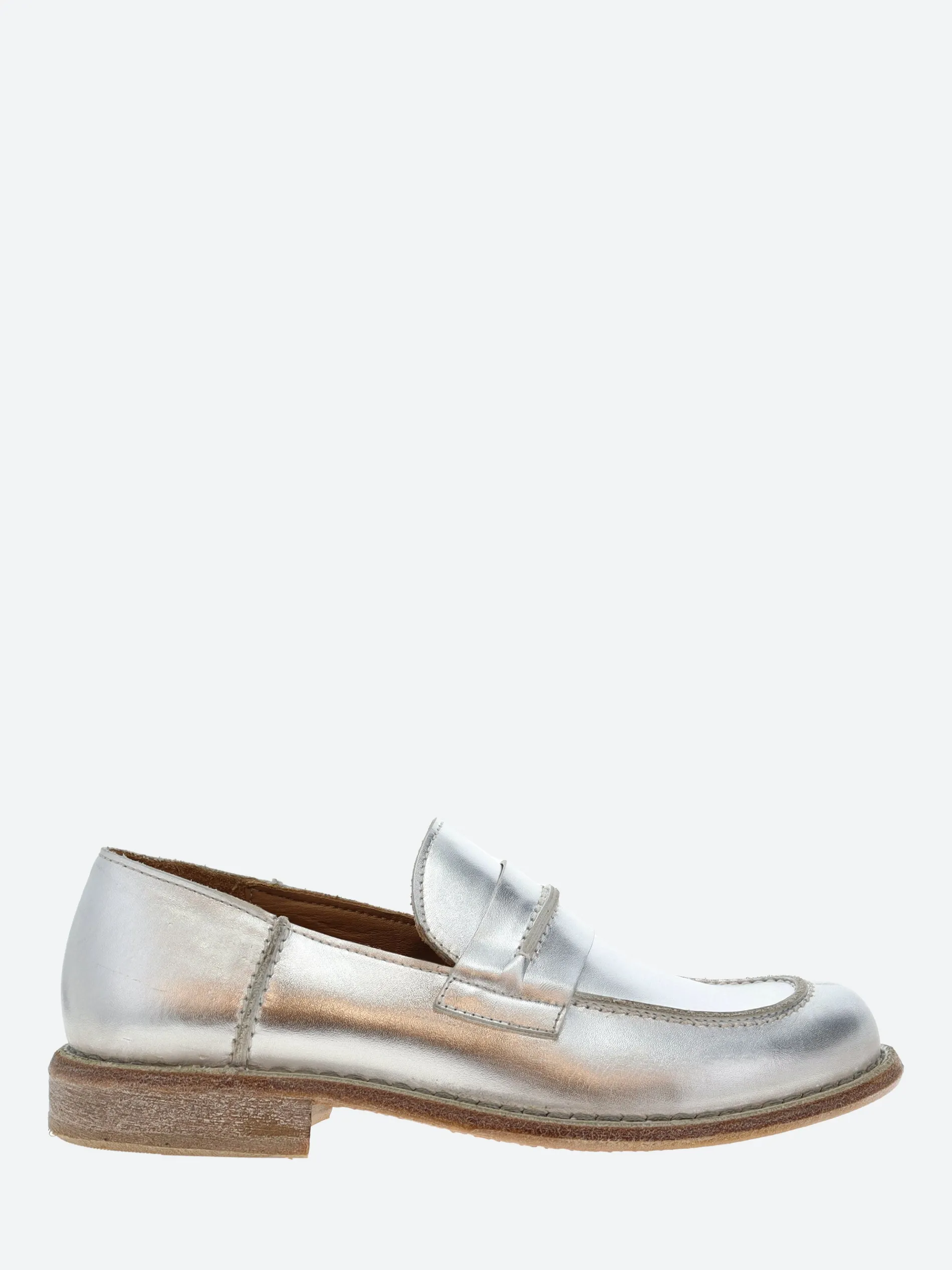 A classic penny loafer with a metallic finish, set on a slight heel.