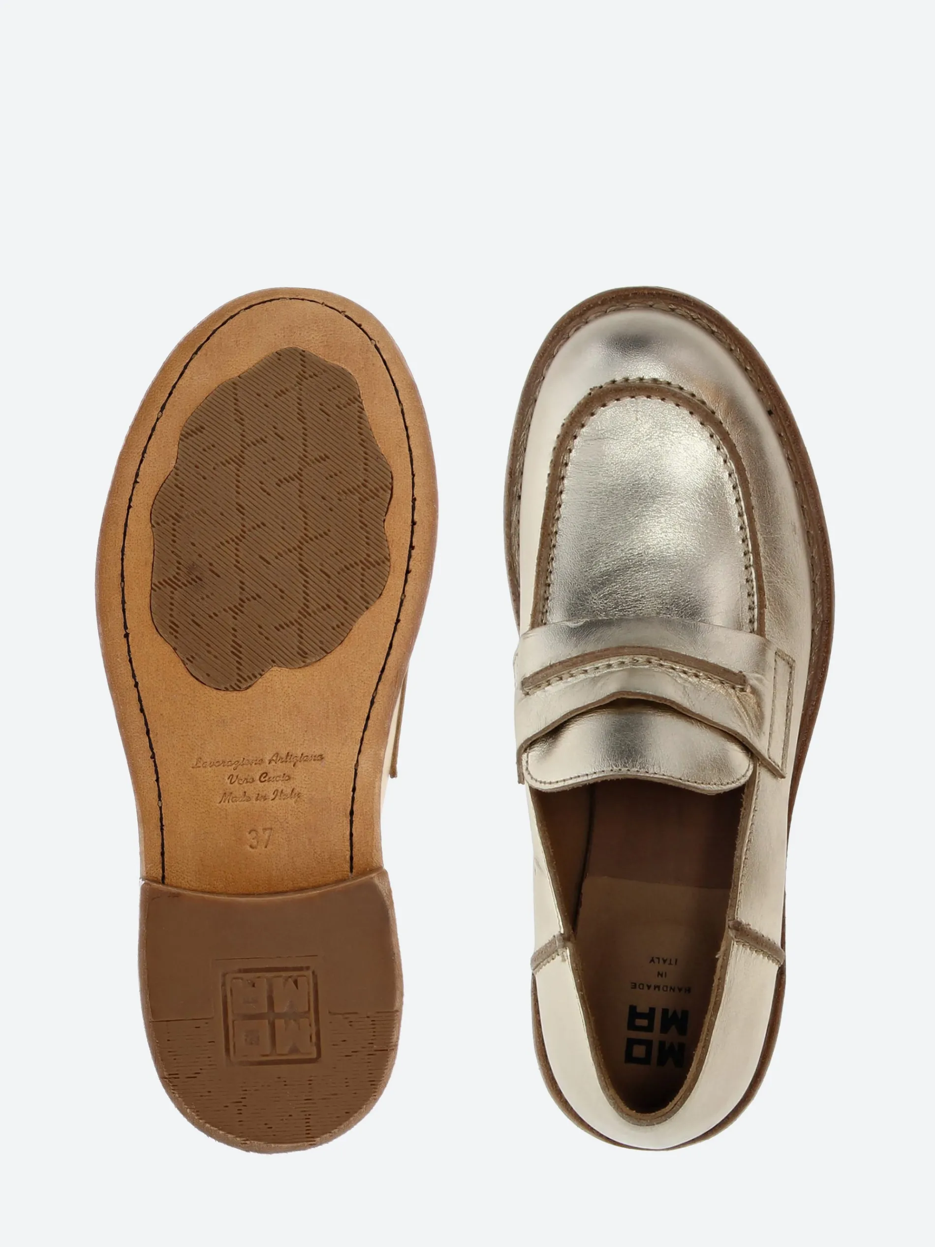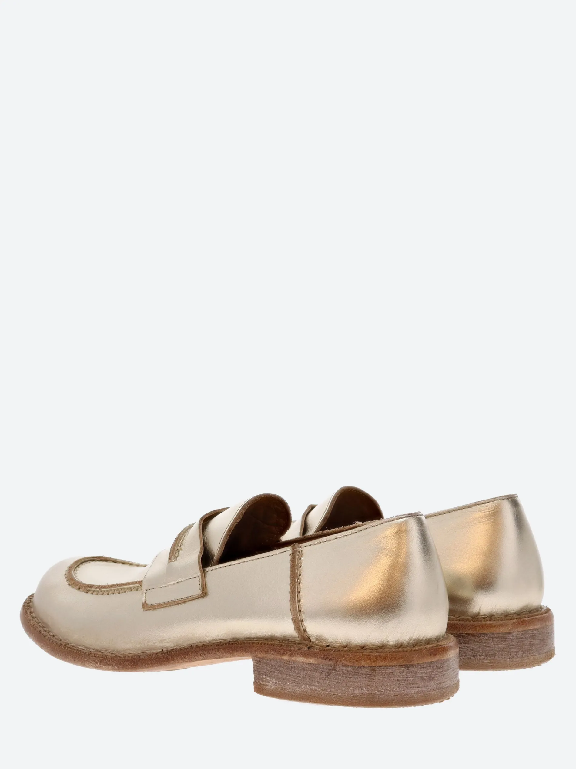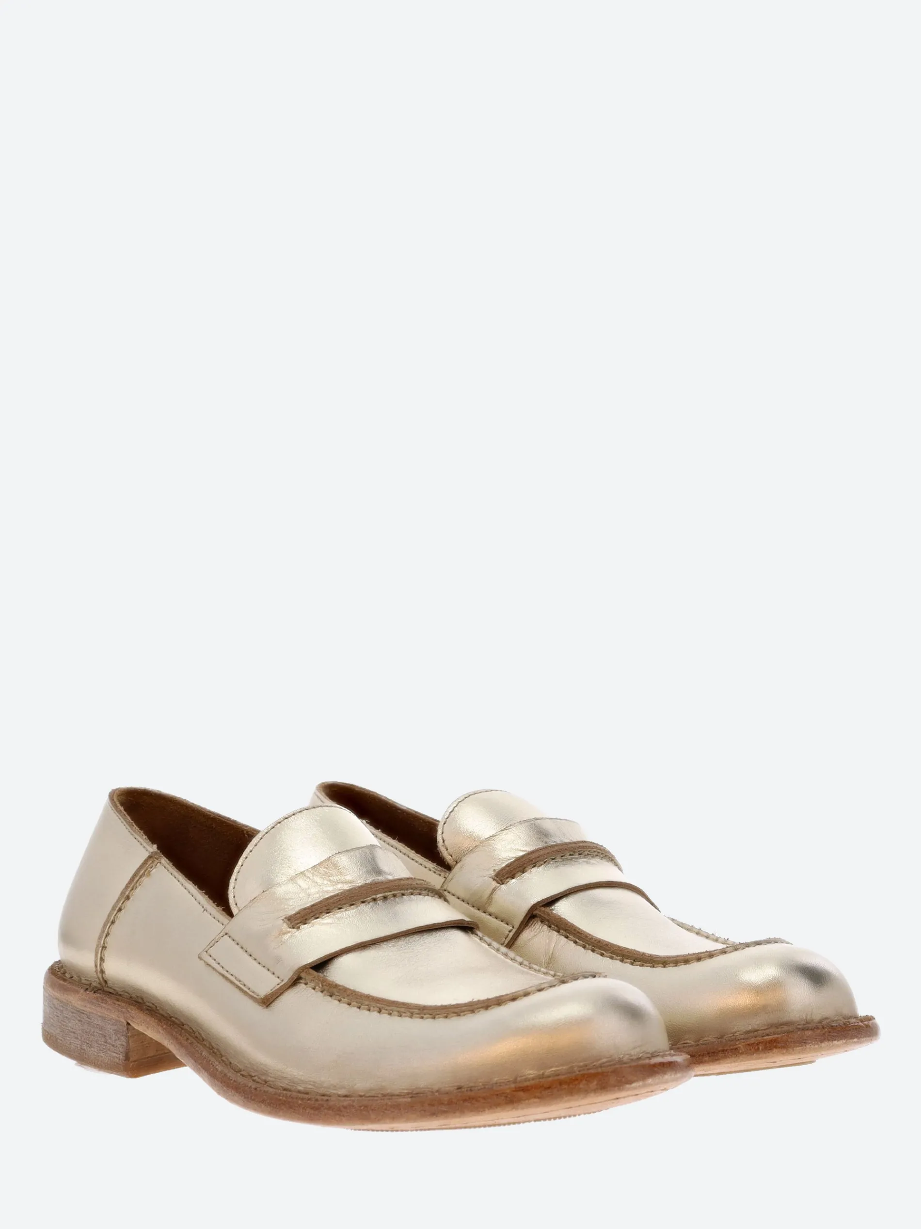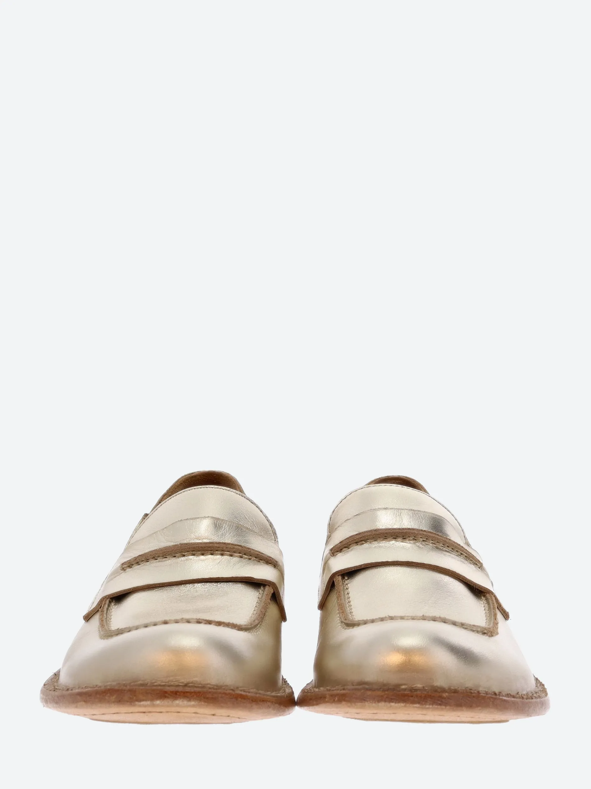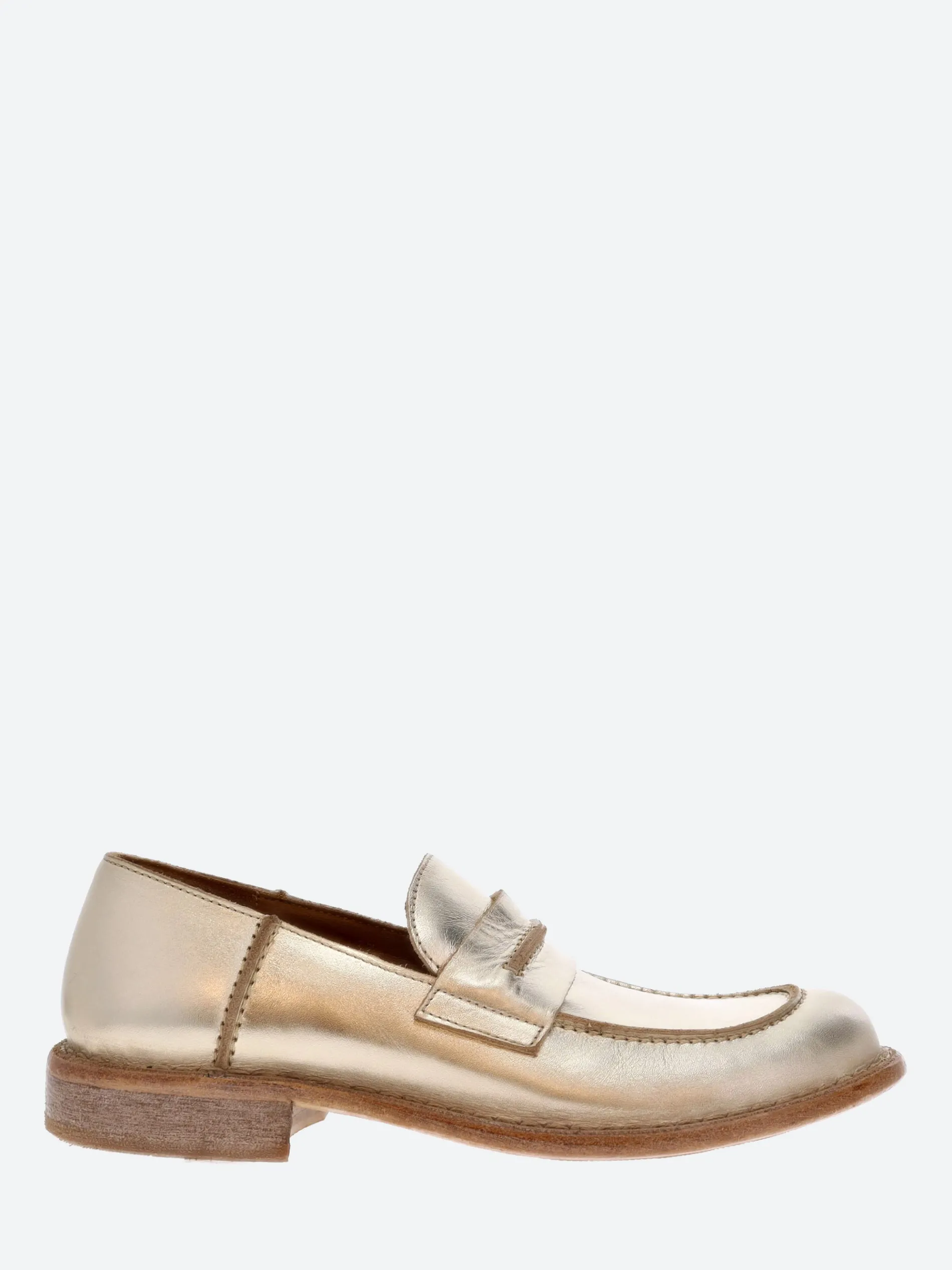 A classic penny loafer with a metallic finish, set on a slight heel.