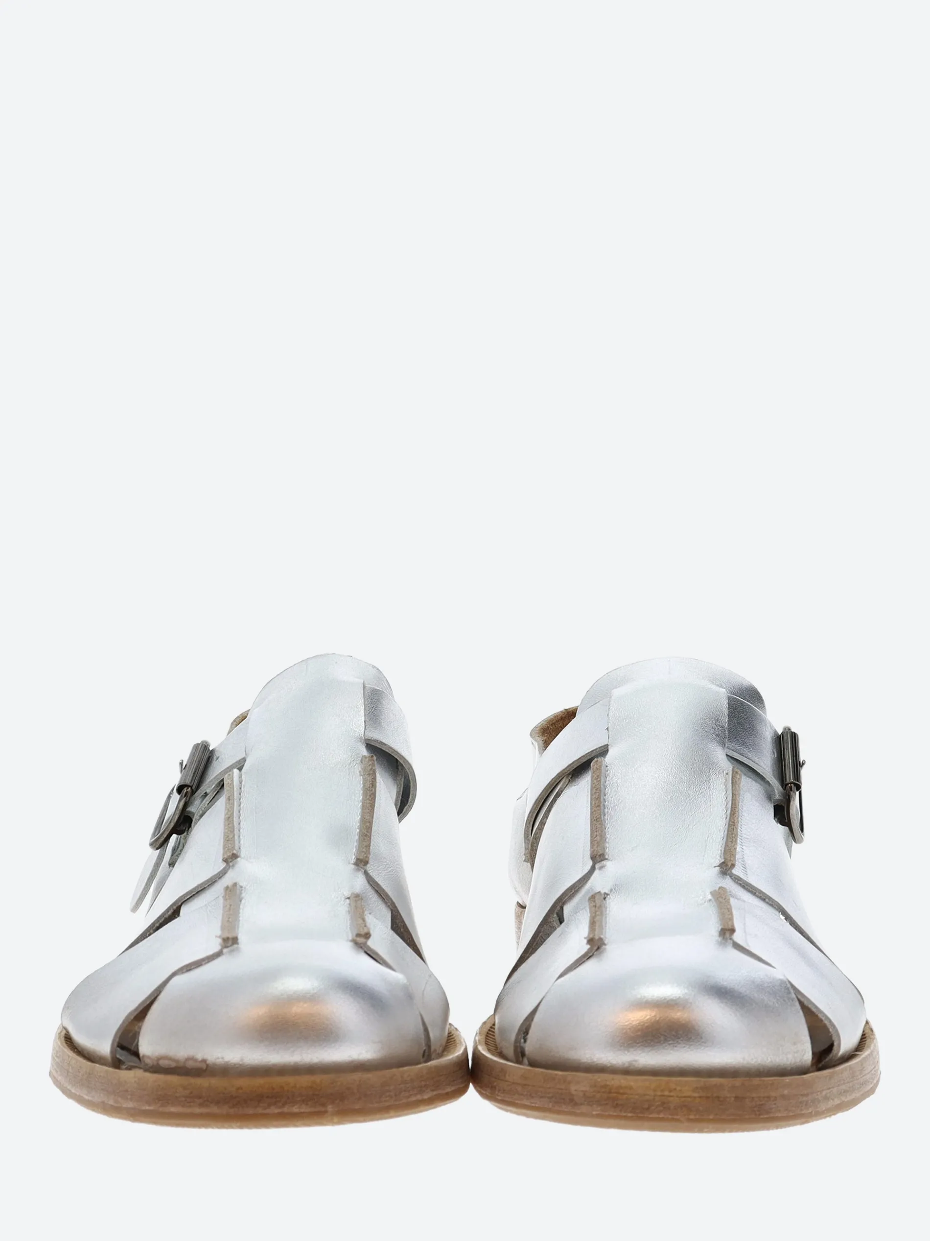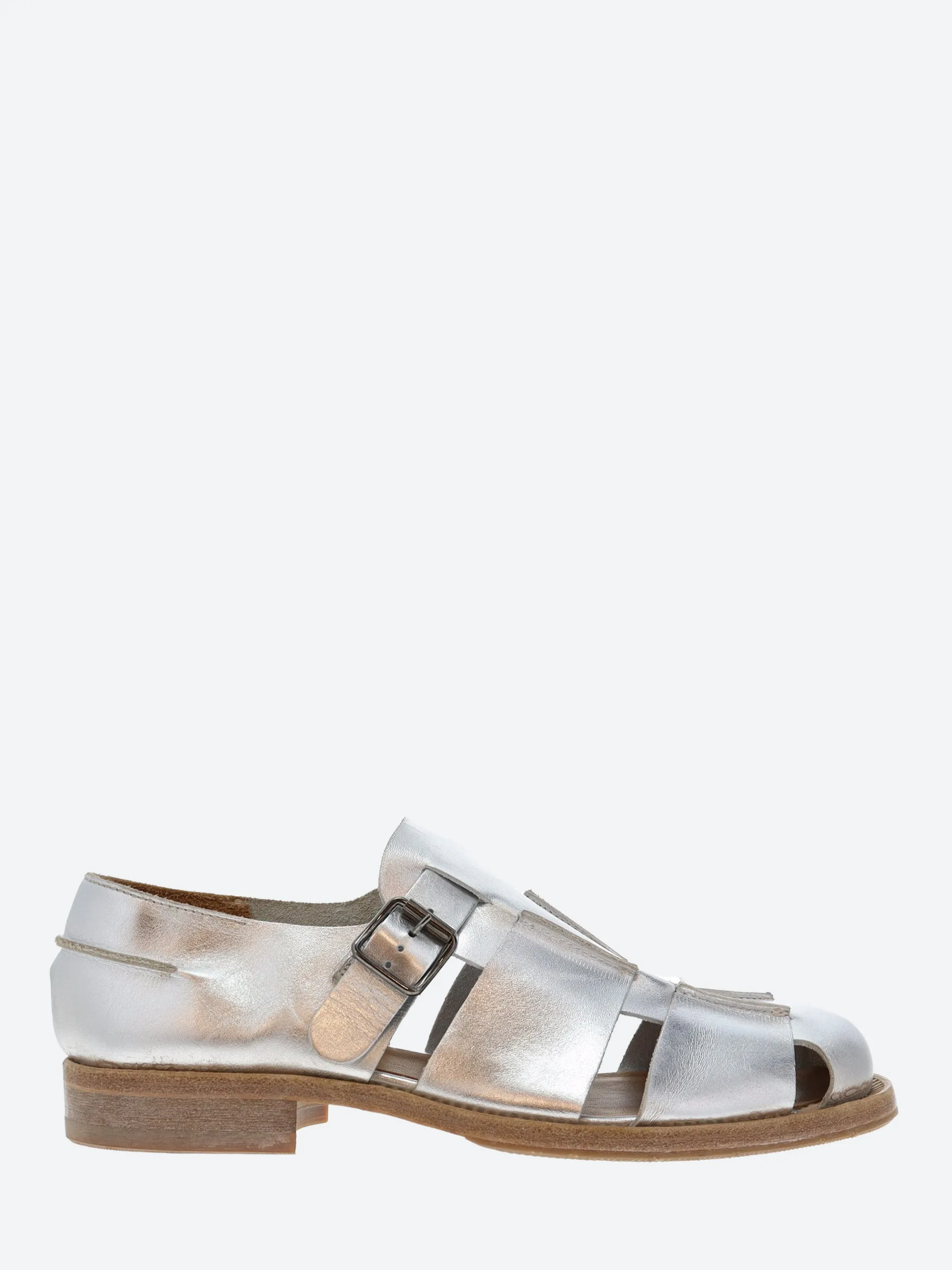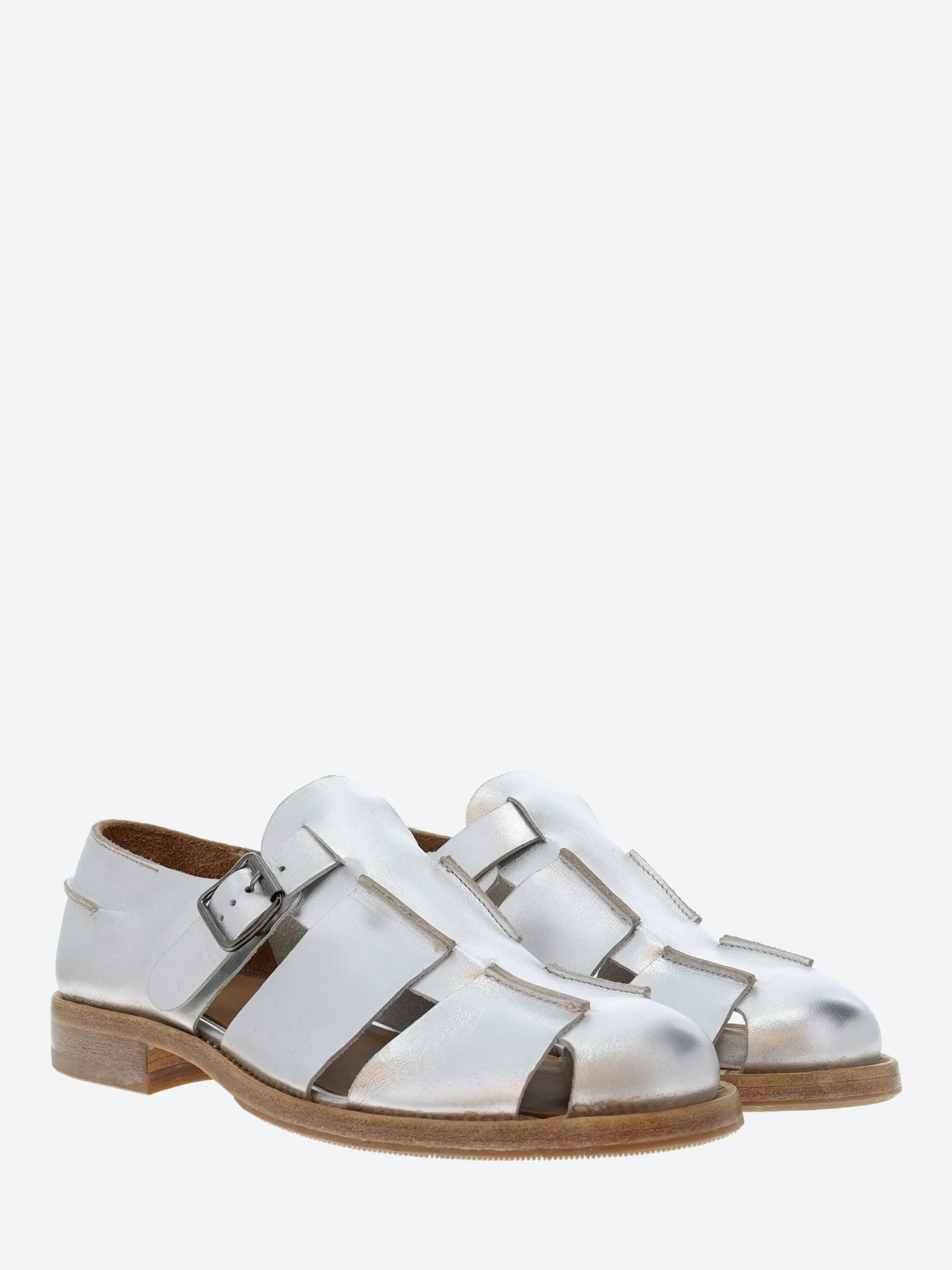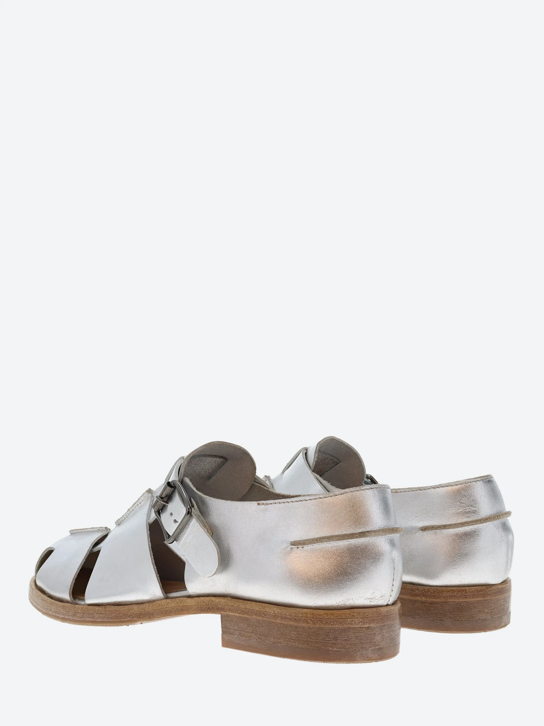 Women’s sandal in vintage effect leather. Made with a round toe, and a leather sole with non-slip rubber insert.