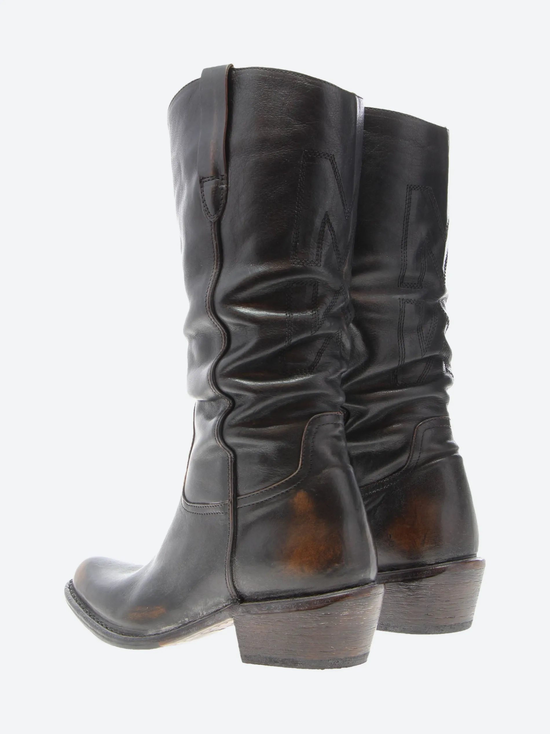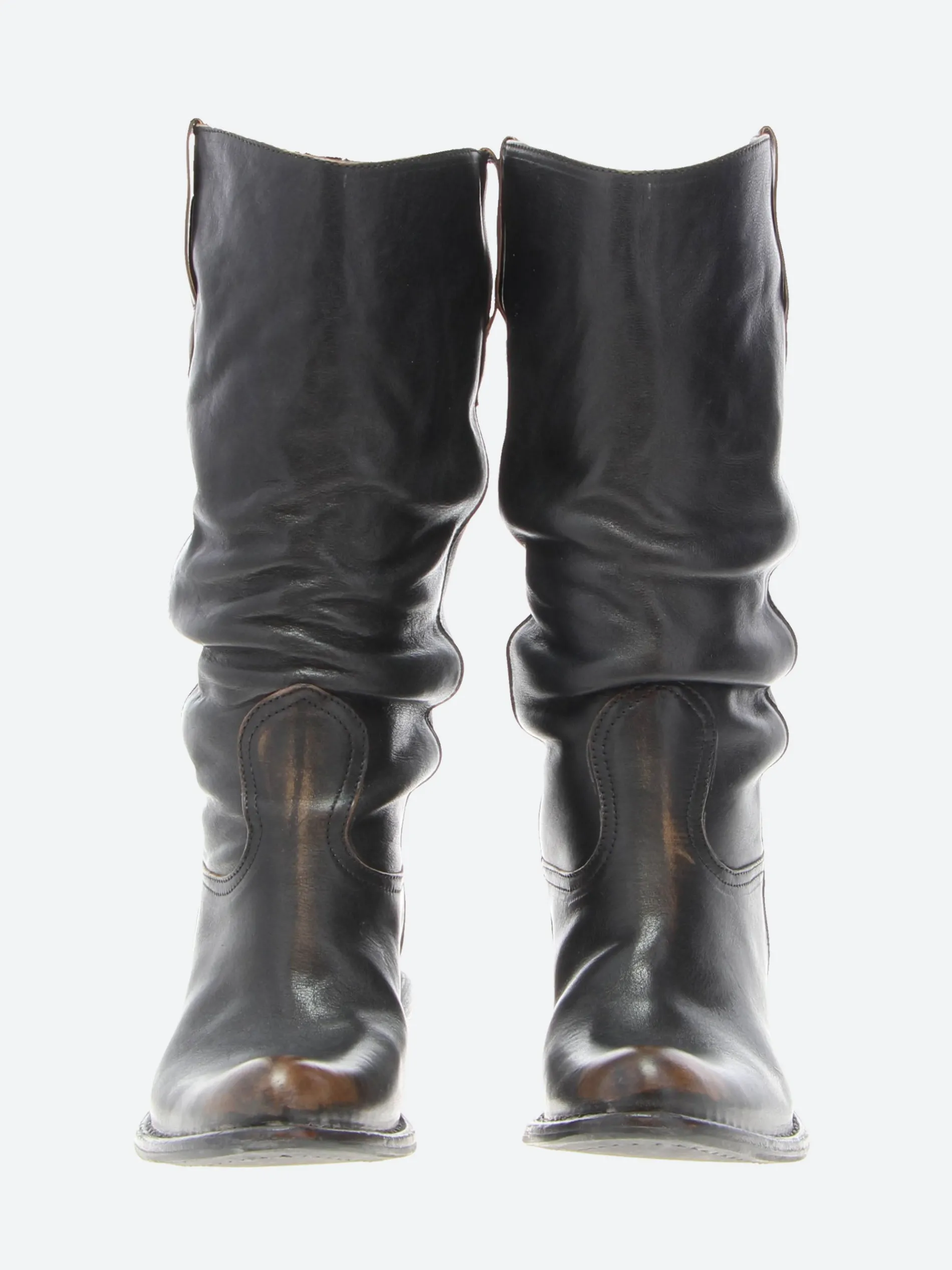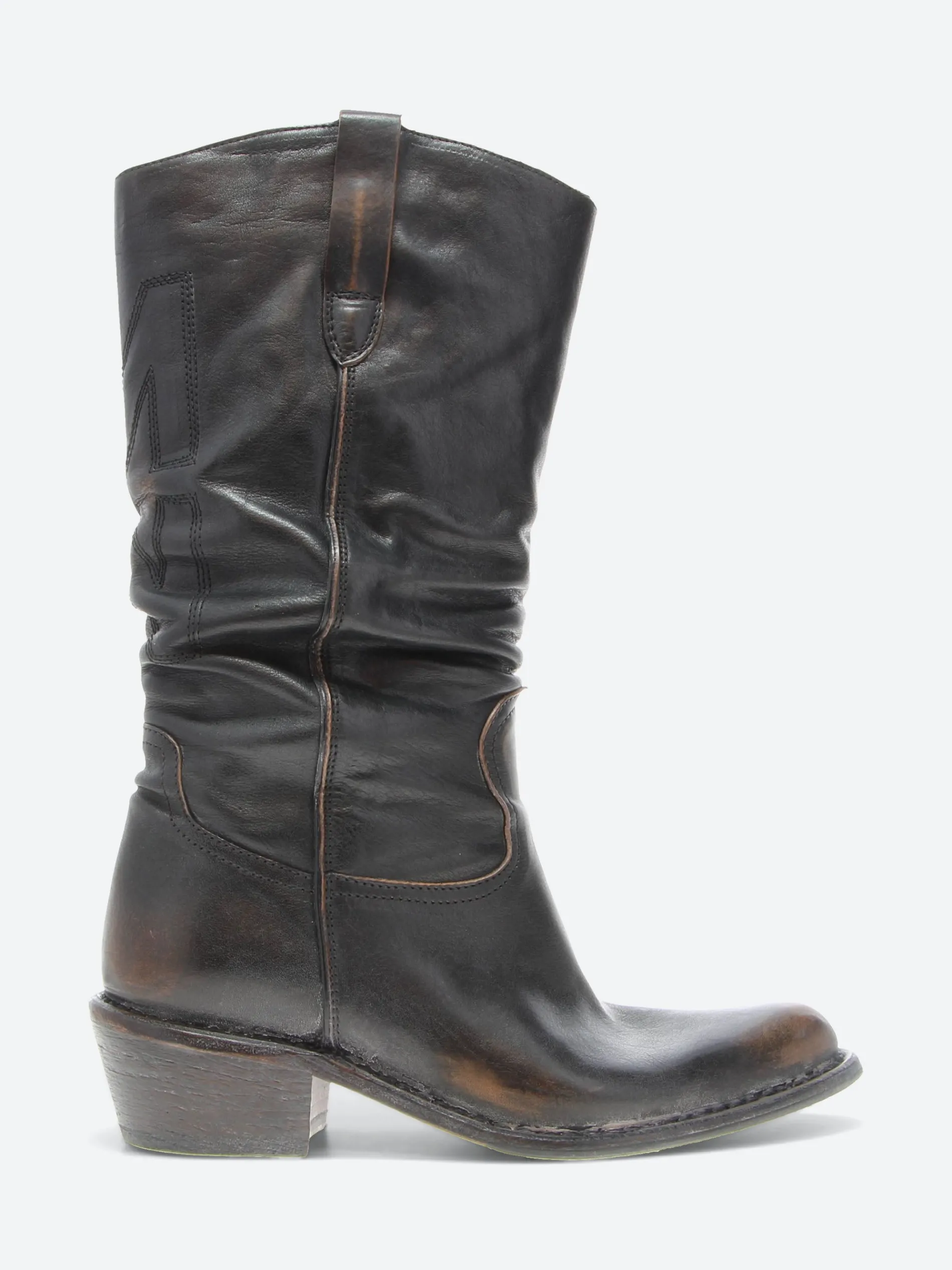 Vintage-inspired leather boots by MOMA featuring an almond toe and leather sole with non-slip rubber insert.