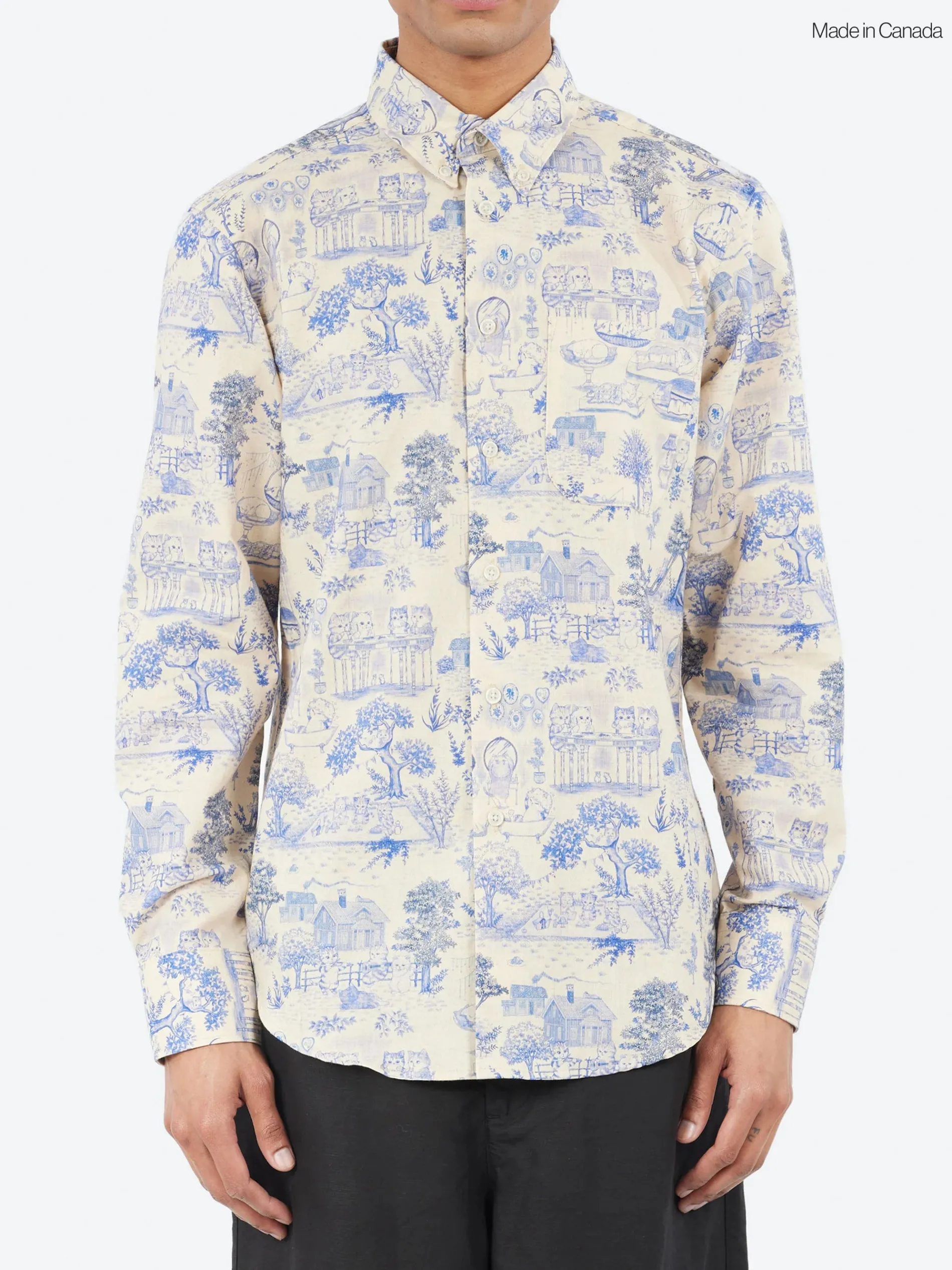 The Easy Shirt is a relaxed-fit long sleeve shirt with back pleating and a classic button-down collar. The Linen Cats is a lightweight Japanese fabric made from 85% cotton and 15% linen, featuring the ‘toile de Jouy” style print of cats in a garden.
