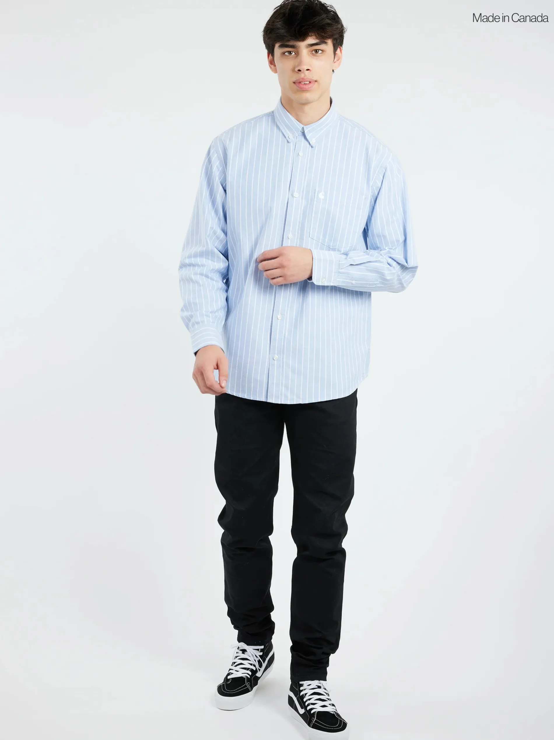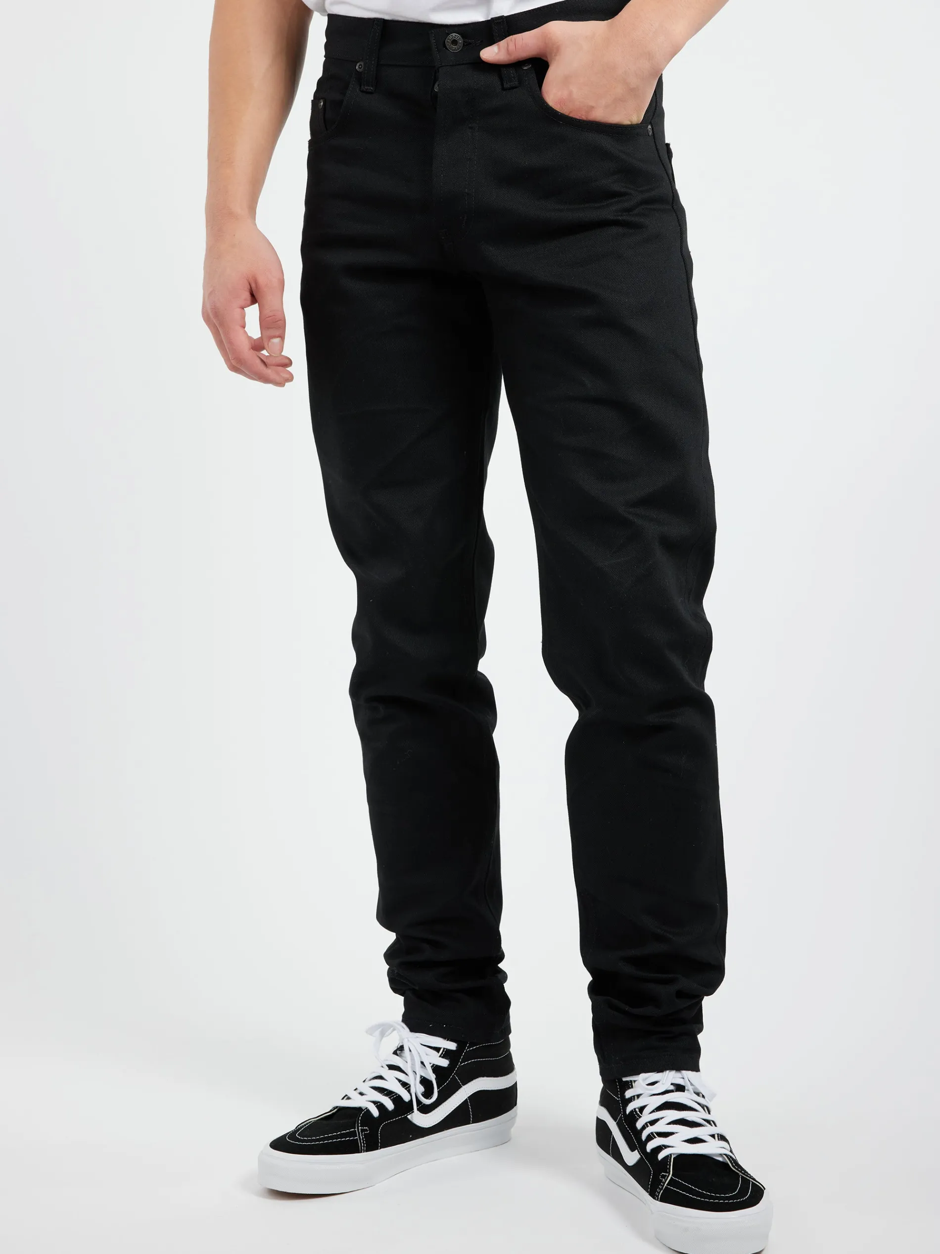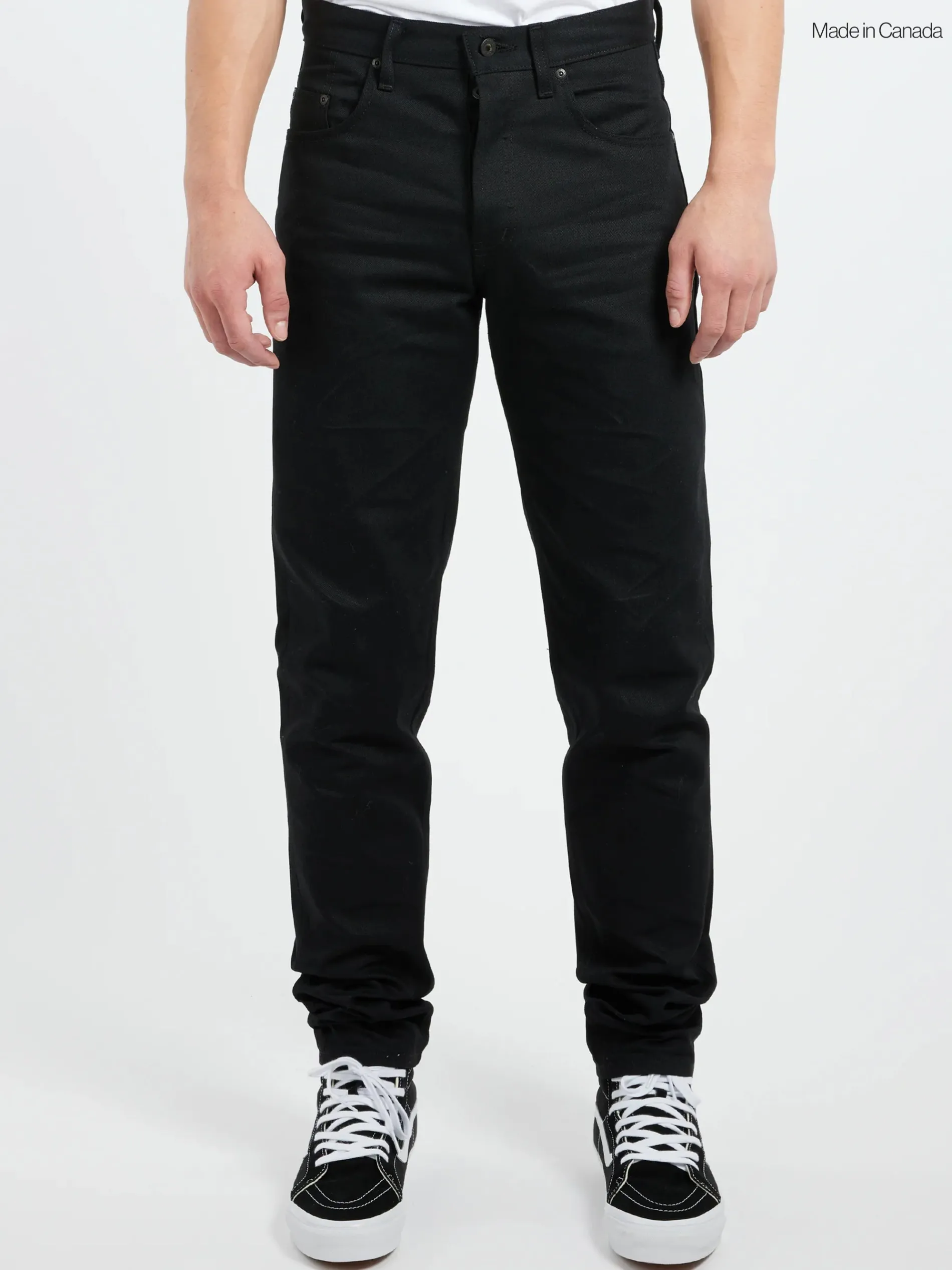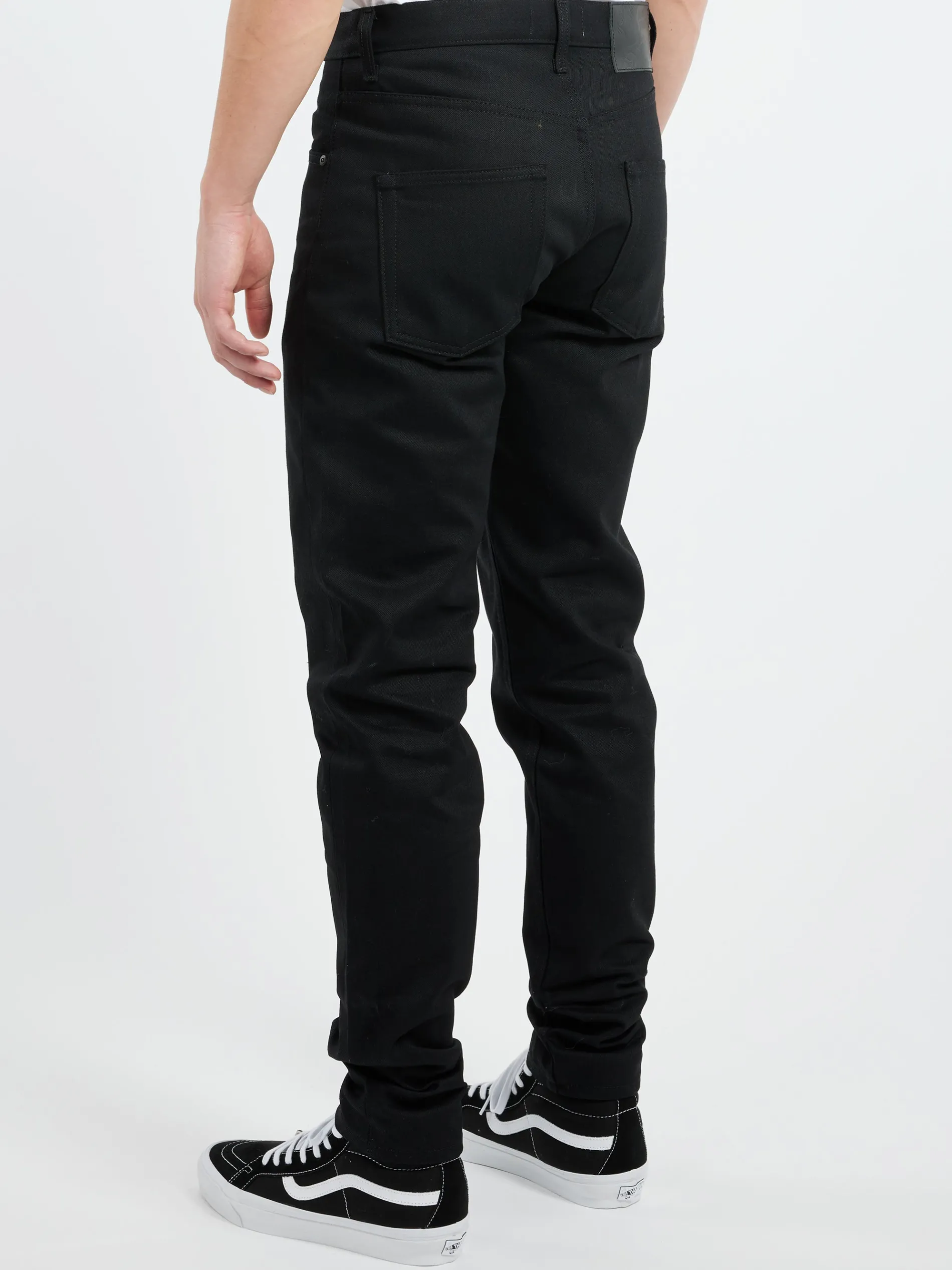 13oz black sulfur dyed Japanese selvedge denim, woven on vintage shuttle looms in a right hand twill construction. The denim is dyed black on both the warp and weft for a solid black color tone and also includes a classic red line selvedge ID. The sulfur dye is resistant to fading to ensure the jeans stay blacker longer.