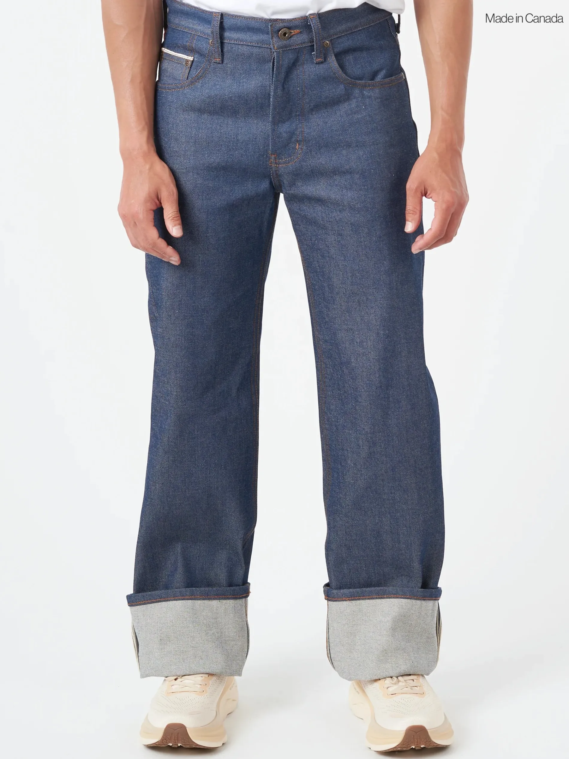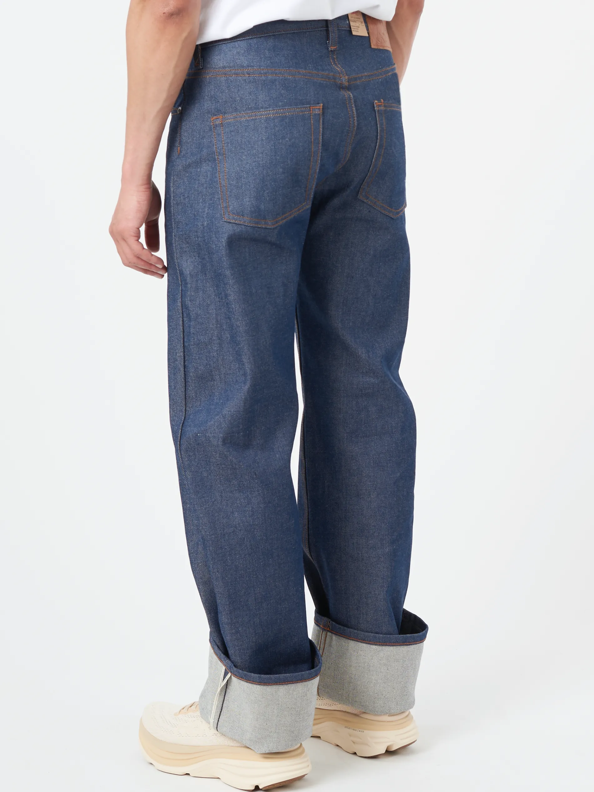 The Strong Guy is a relaxed straight fit; high rise, fuller in the seat and thigh that falls to a wide leg opening. The Natural Indigo Selvedge is a 12.5oz indigo rope dyed Japanese selvedge denim, woven on vintage shuttle looms in a right hand twill construction.
