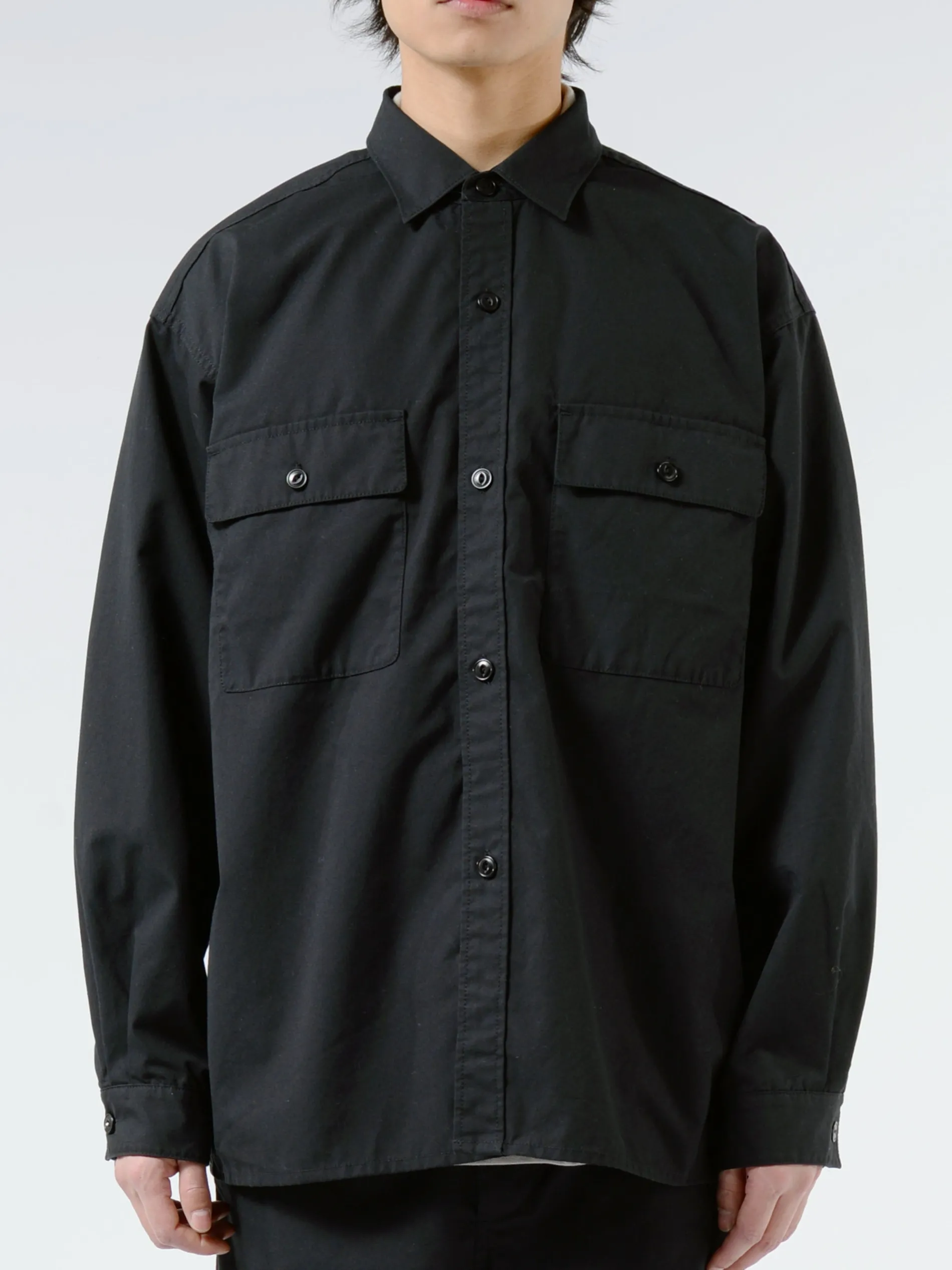 Nanamica shirt jacket with a relaxed silhouette that can be worn as light outerwear.
