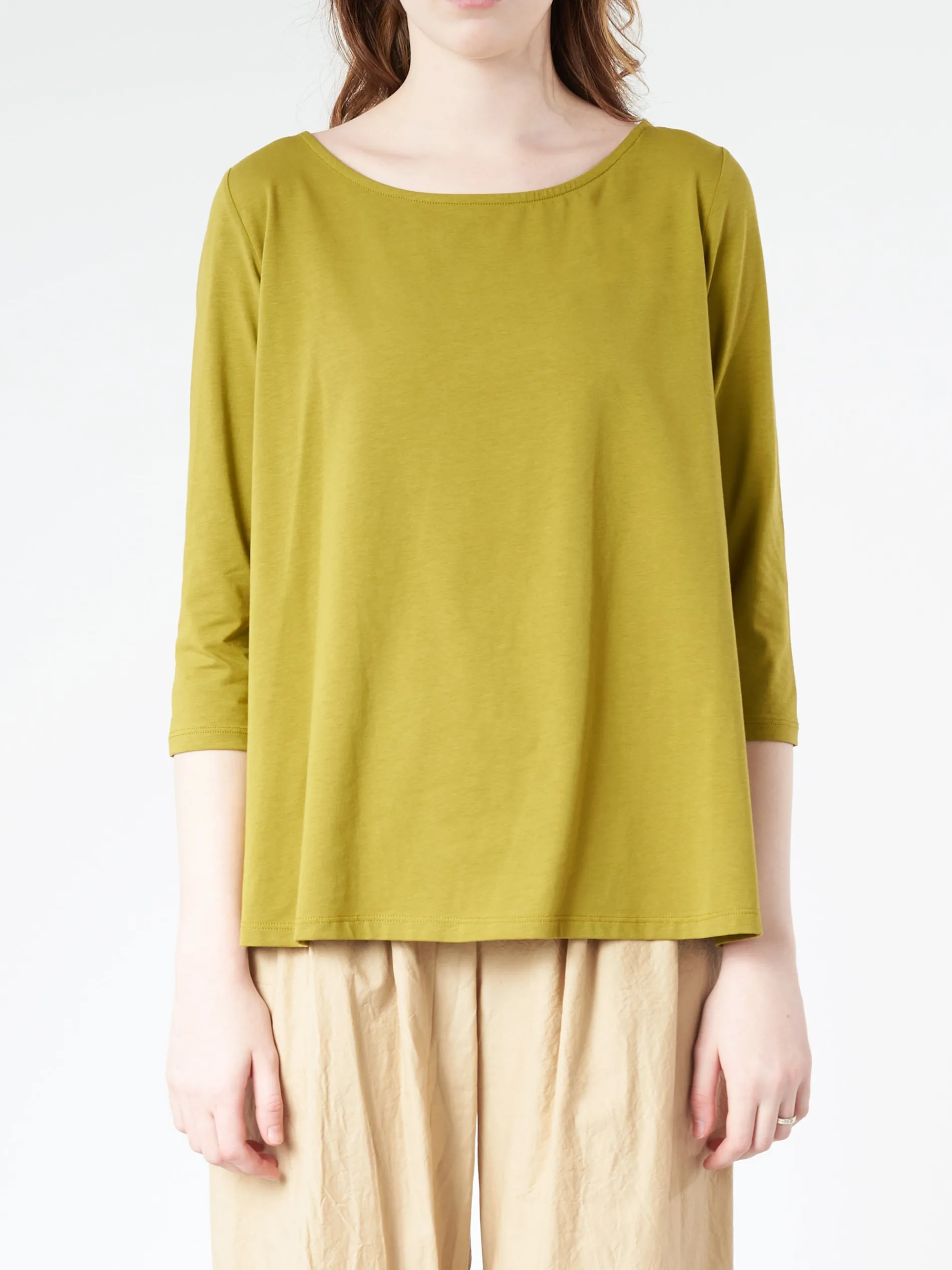 Basic crew-neck t-shirt with dropped shoulders and A-shape. Shallow neckline and comfortable fit.
