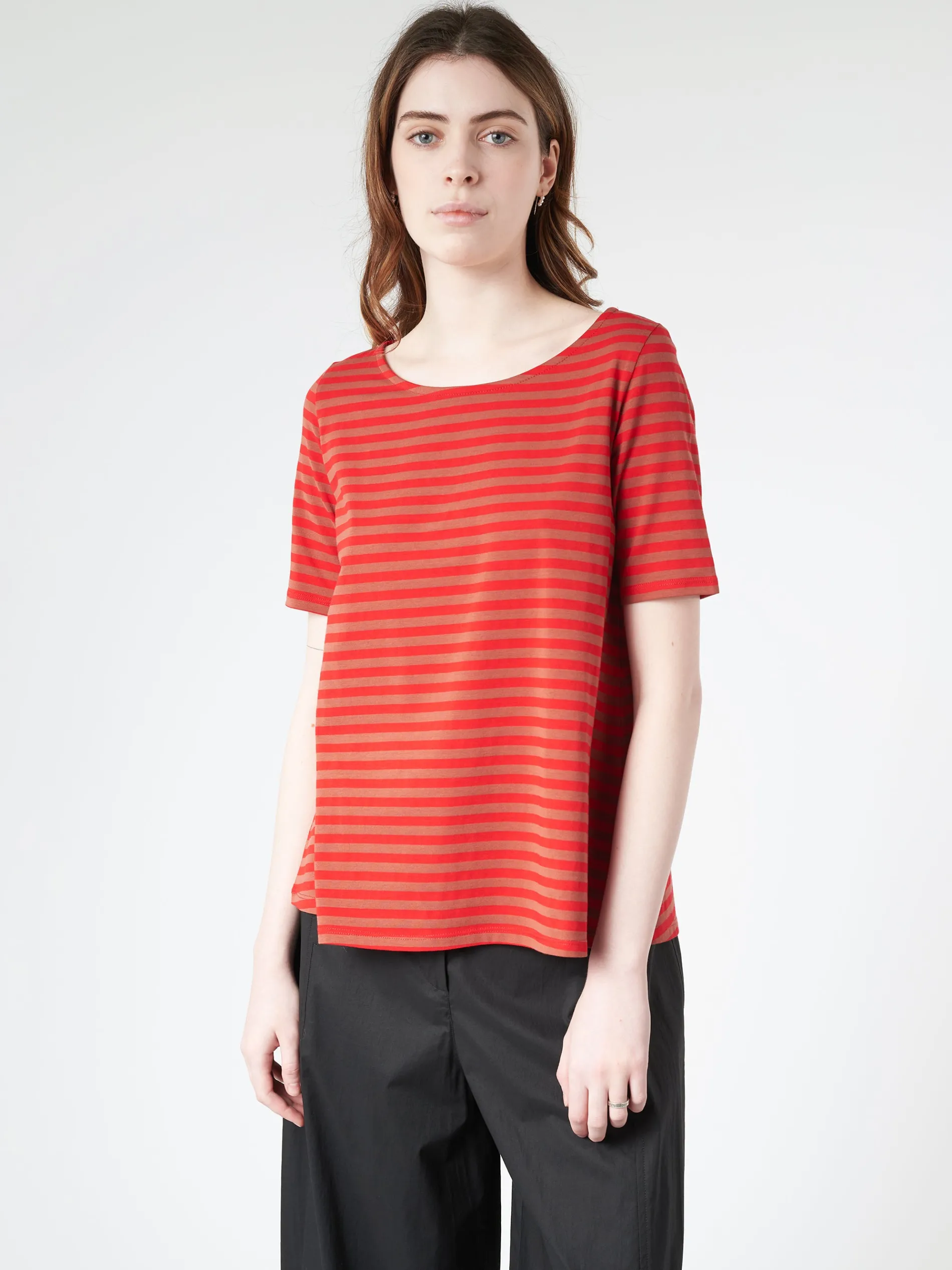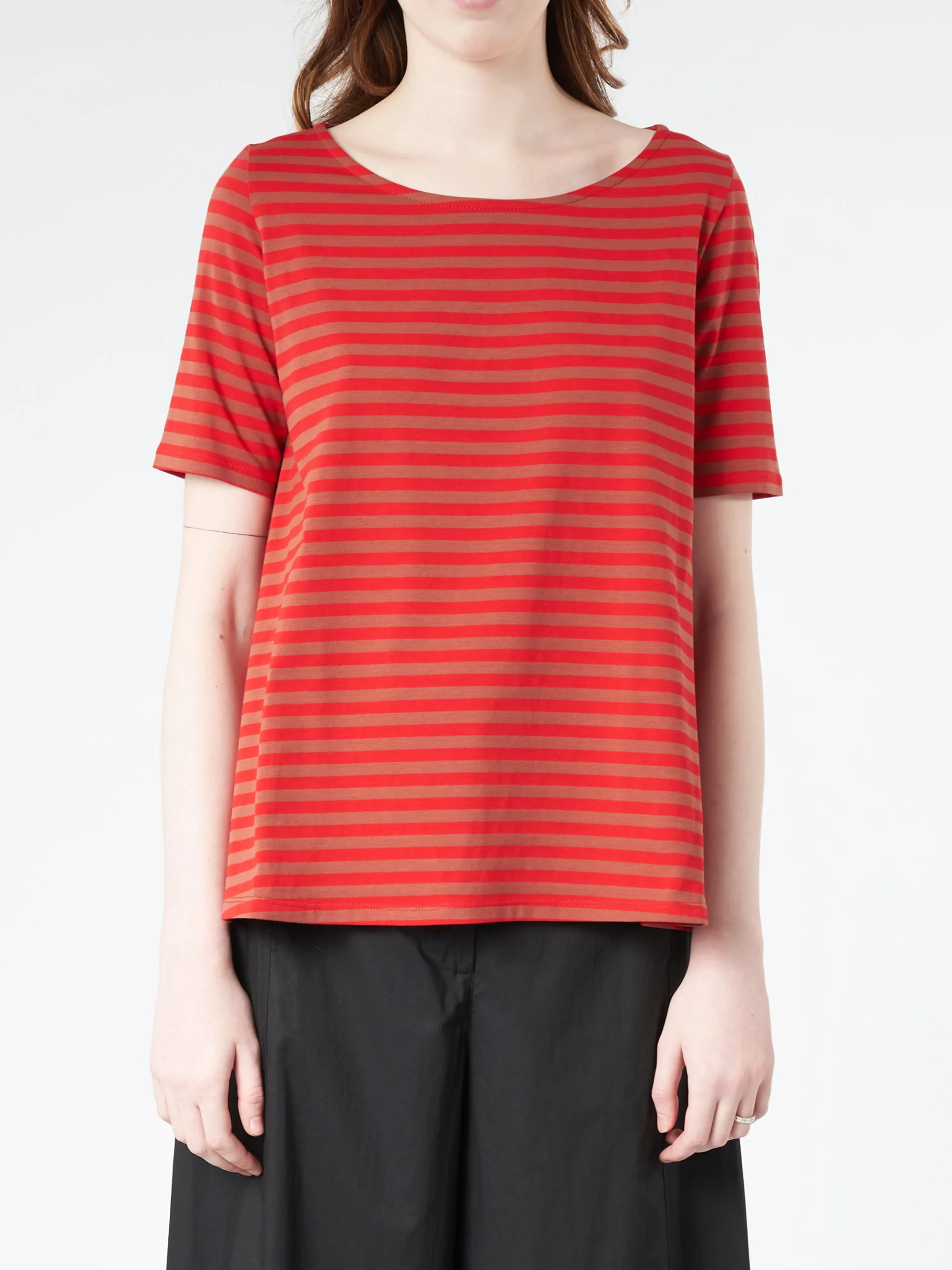 Basic crew-neck t-shirt with a striped pattern and A-shape. Shallow neckline and comfortable fit.