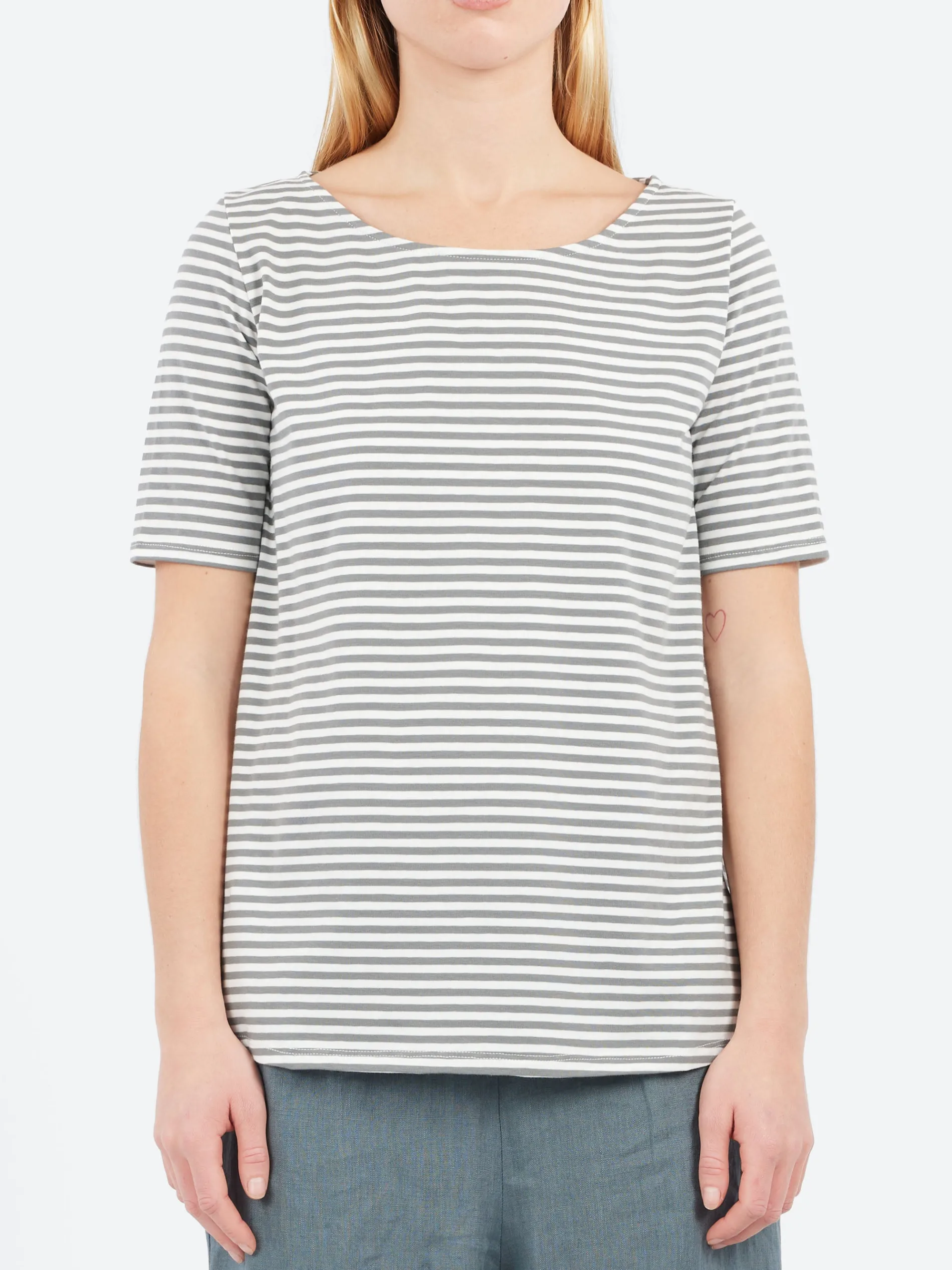A basic t-shirt with a striped pattern and an A-line silhouette. Featuring a round neckline, short sleeves, and an easy fit, this piece embodies the relaxed essence of the Neirami silhouette. The wide, intentionally abundant lines are designed to enhance both comfort and dynamism, creating a stylish and effortless look.