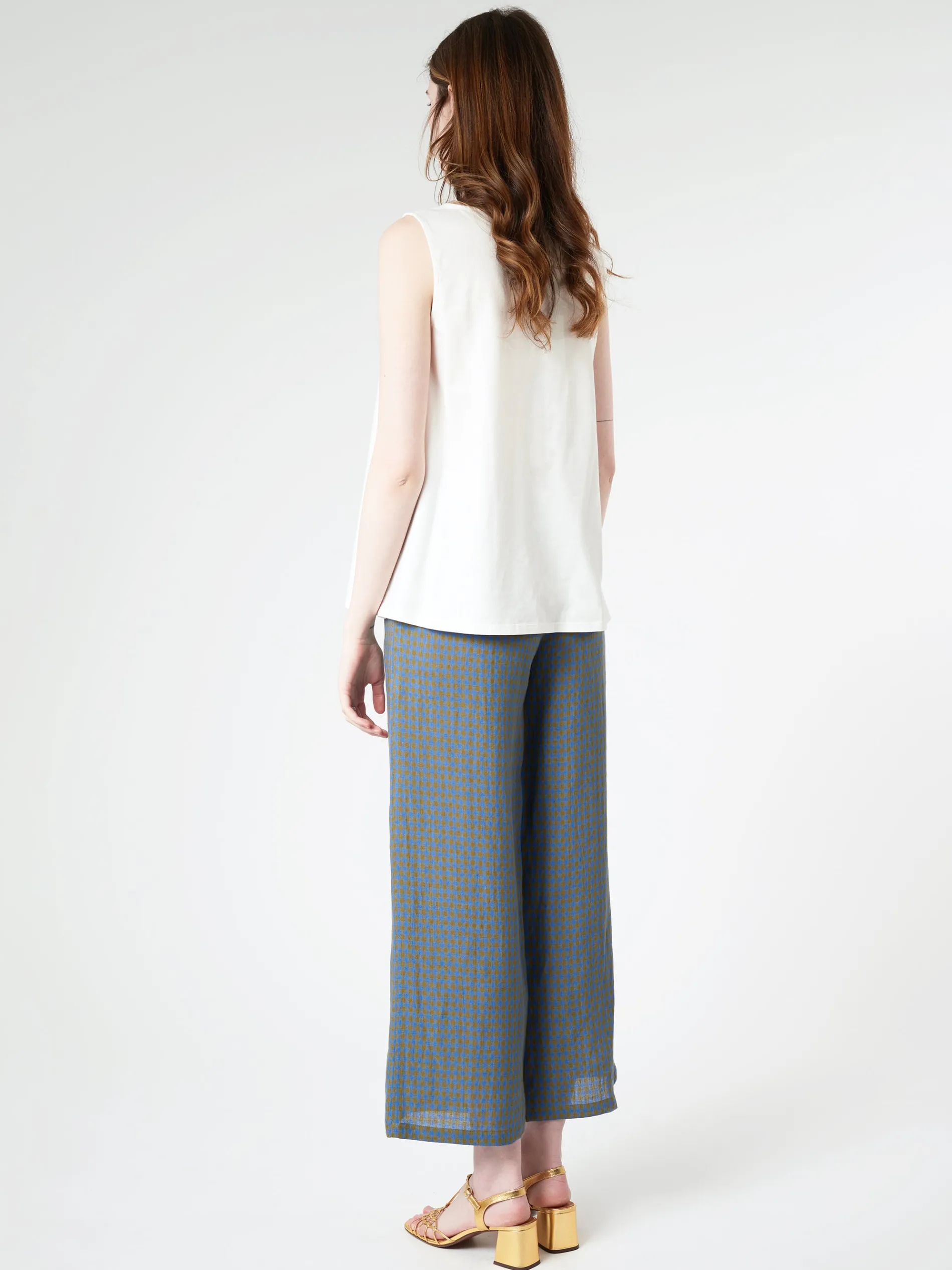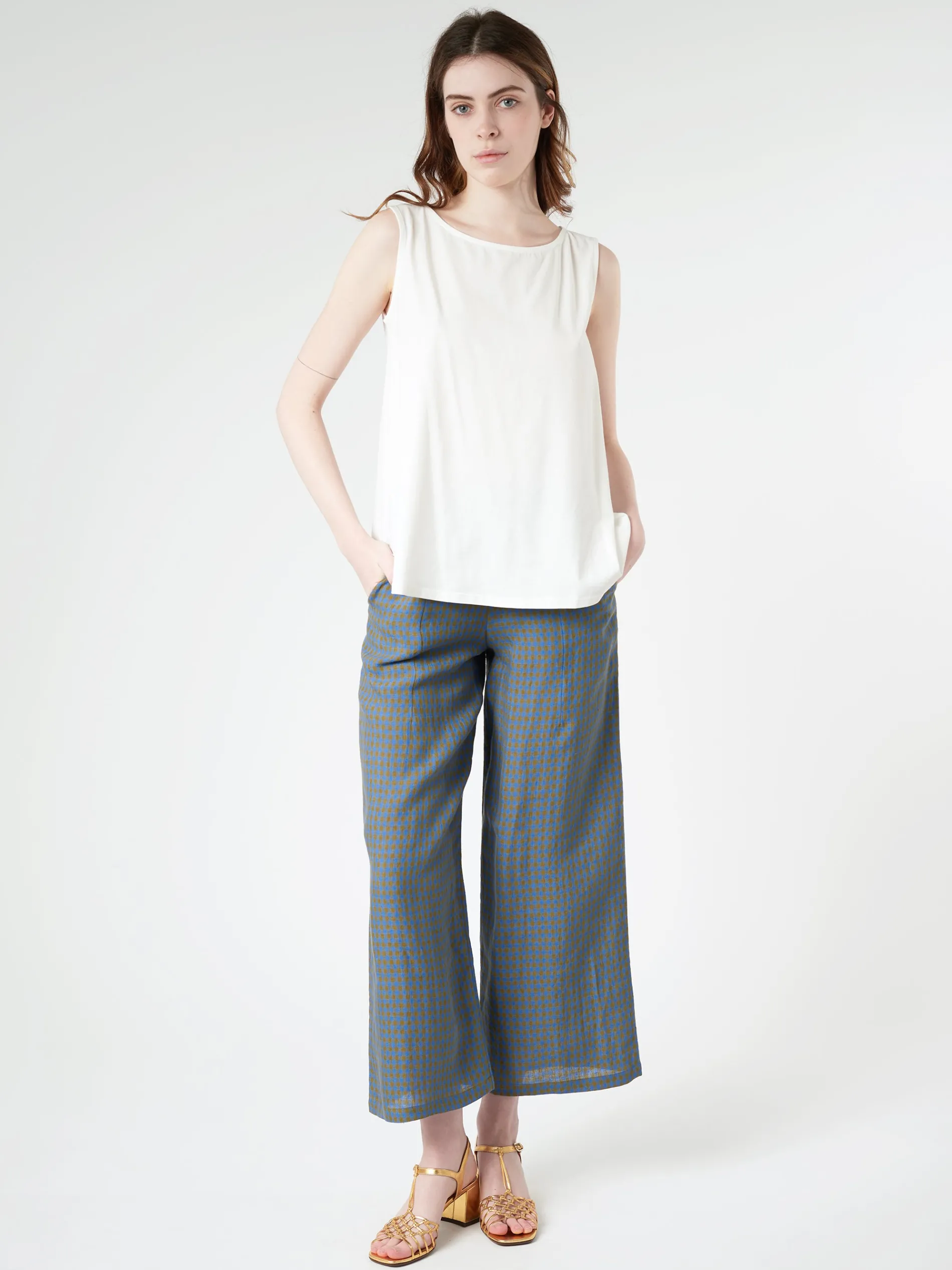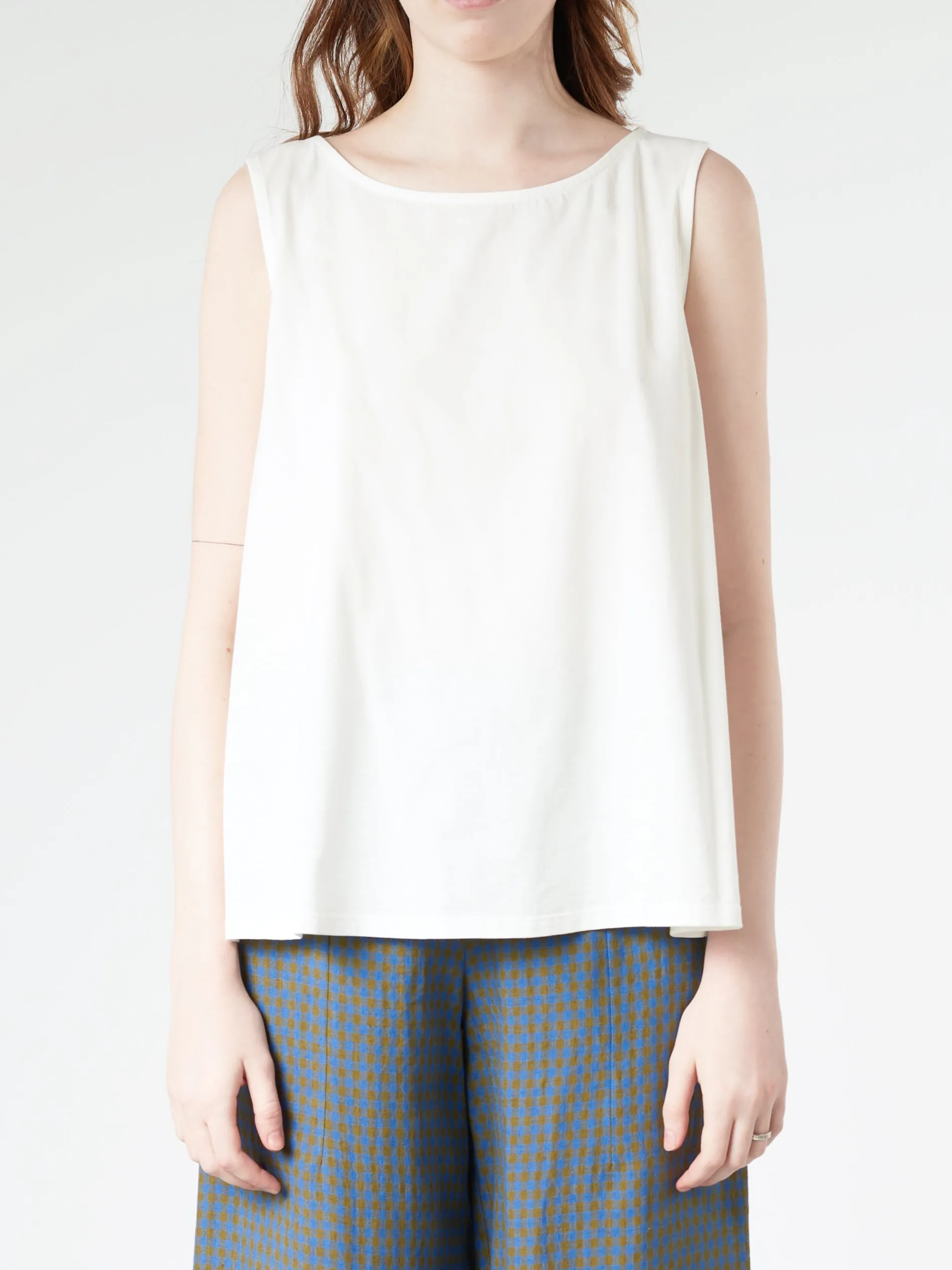 Basic crew-neck tank with wide shoulder and A-shape. Shallow neckline and comfortable fit.