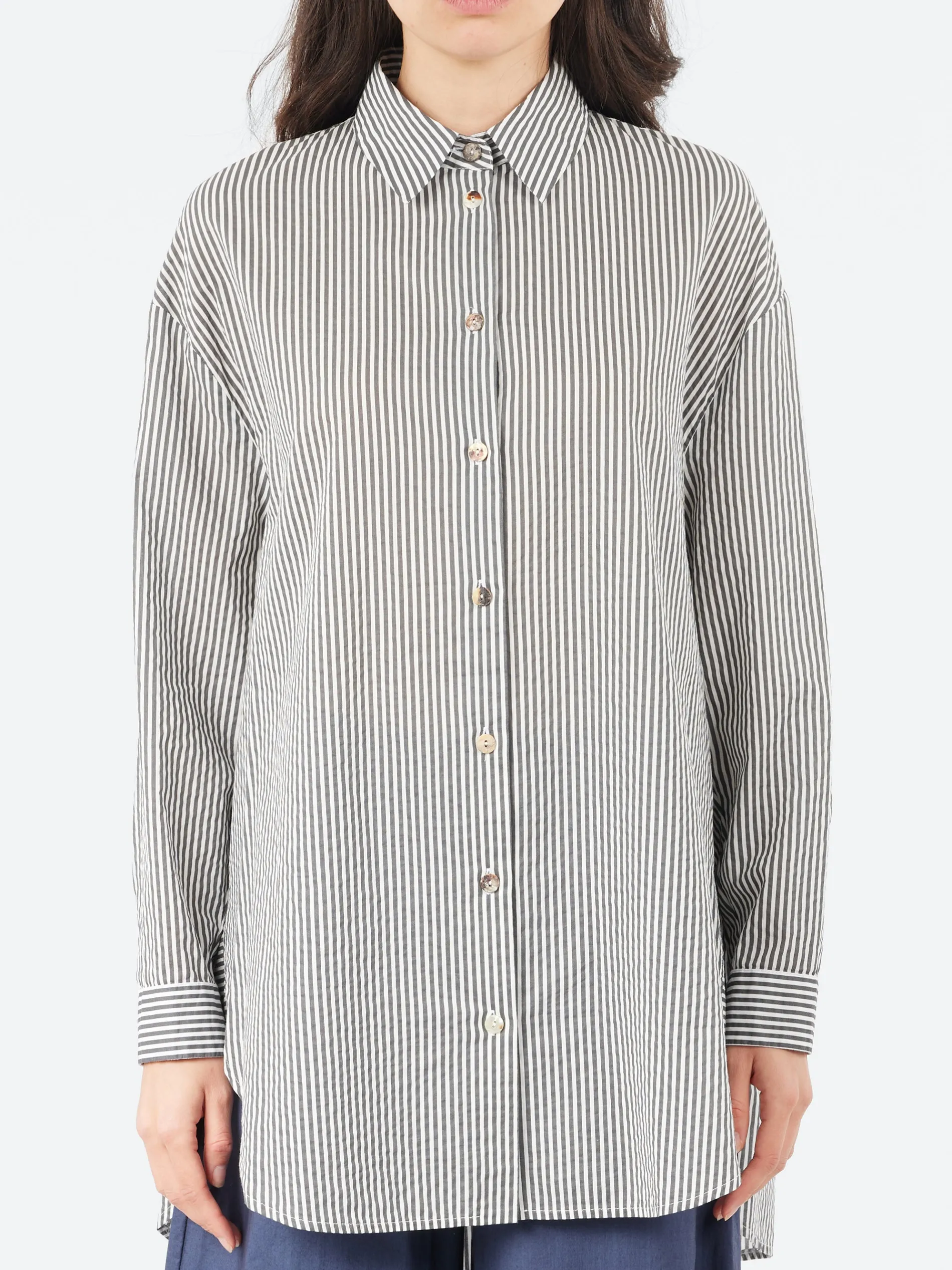 Oversized button-up shirt with long sleeves, cut from a striped cotton with a rounded hem slightly longer at the back.