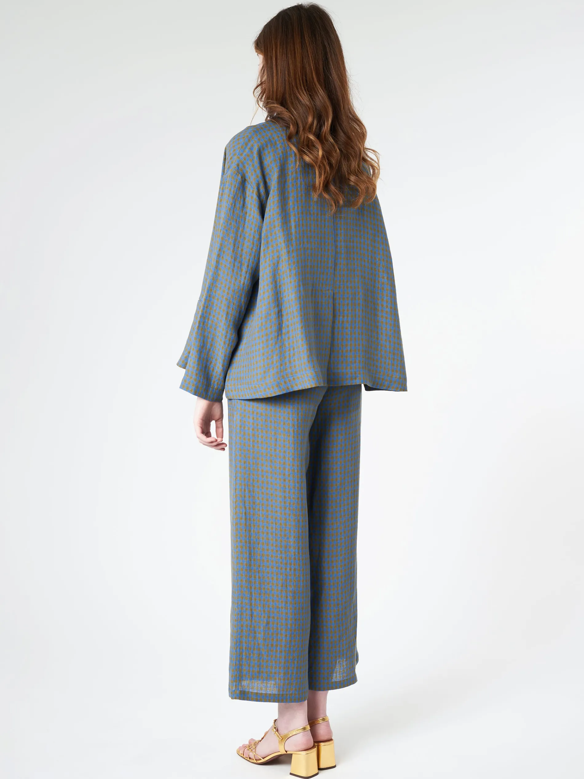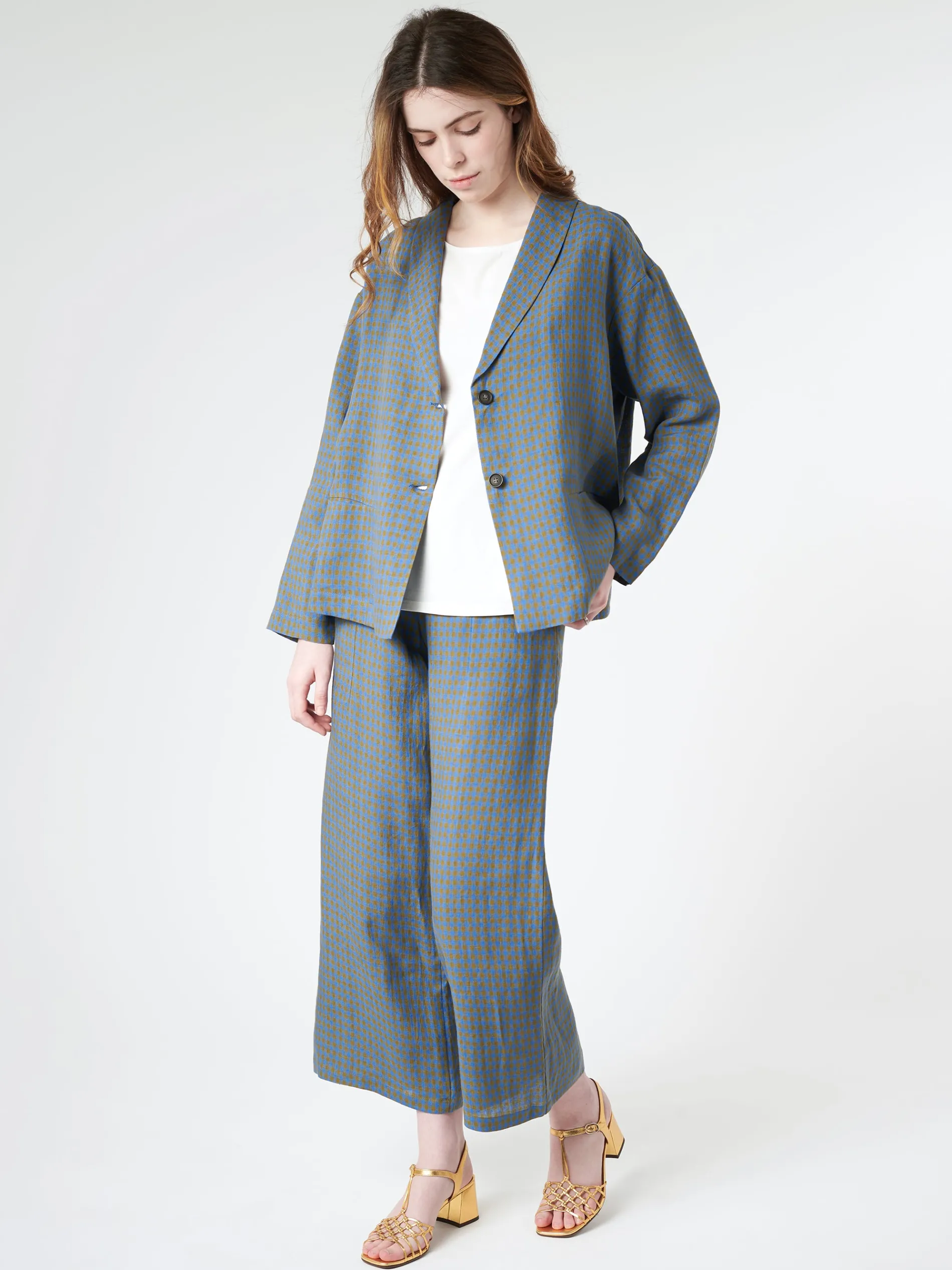 Turquoise and green checked linen jacket with a boxy shape and wide shoulders.
