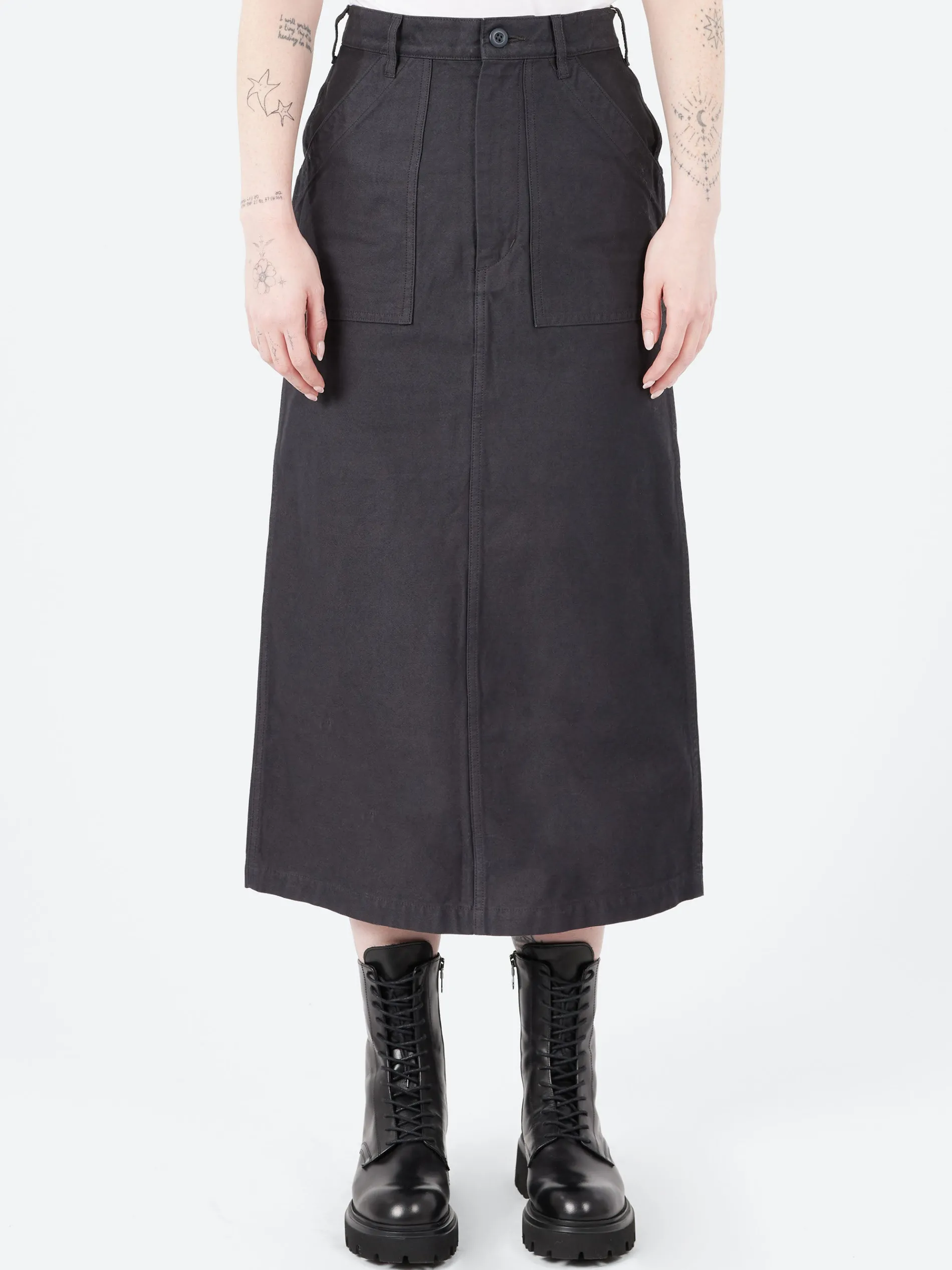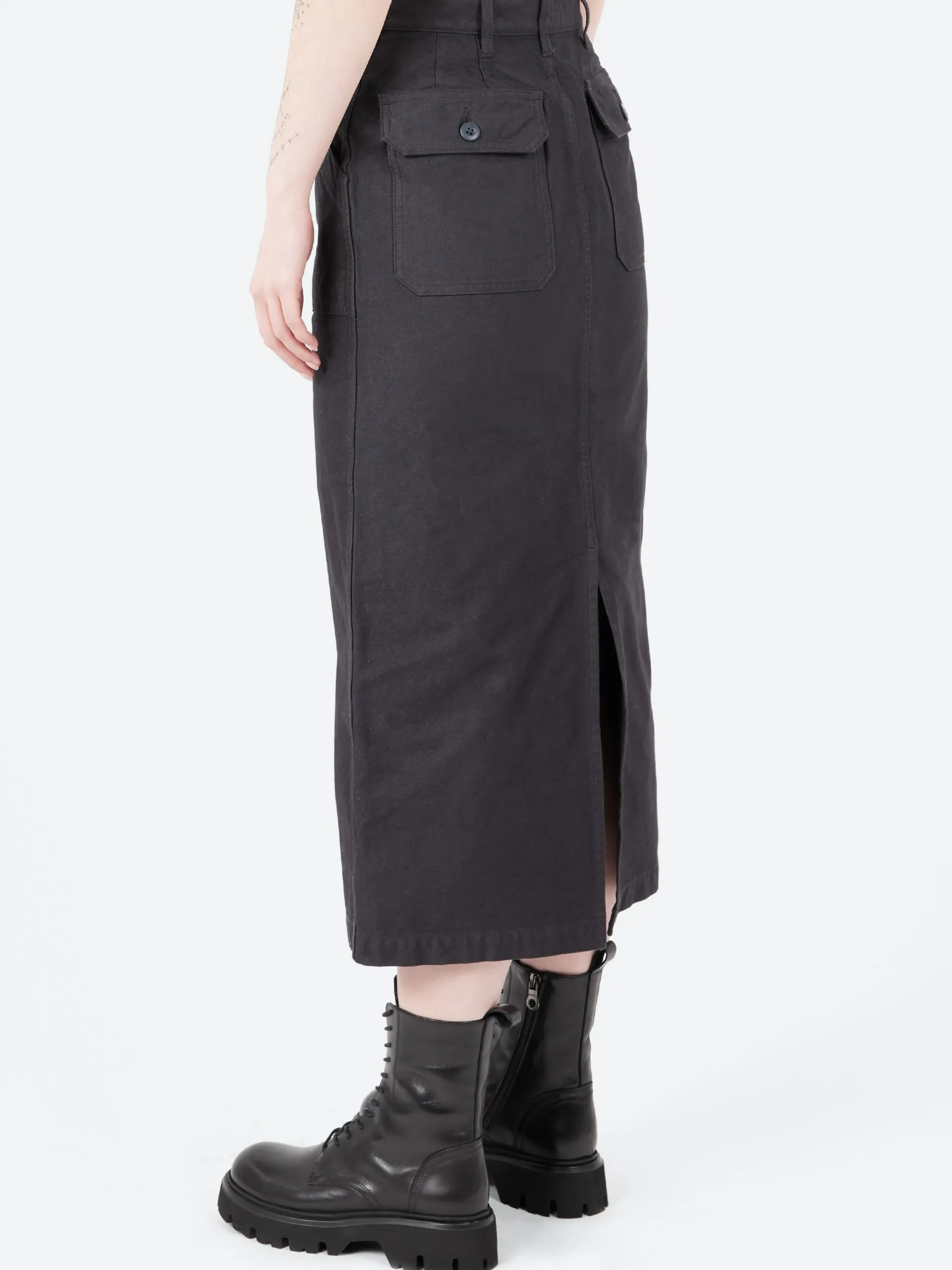This Nigel Cabourn skirt is inspired by the OG-107 Utility Pants (commonly known as Baker Pants) worn by the US military for work. The material is soft back satin and is finished with a back slit for extra movement.