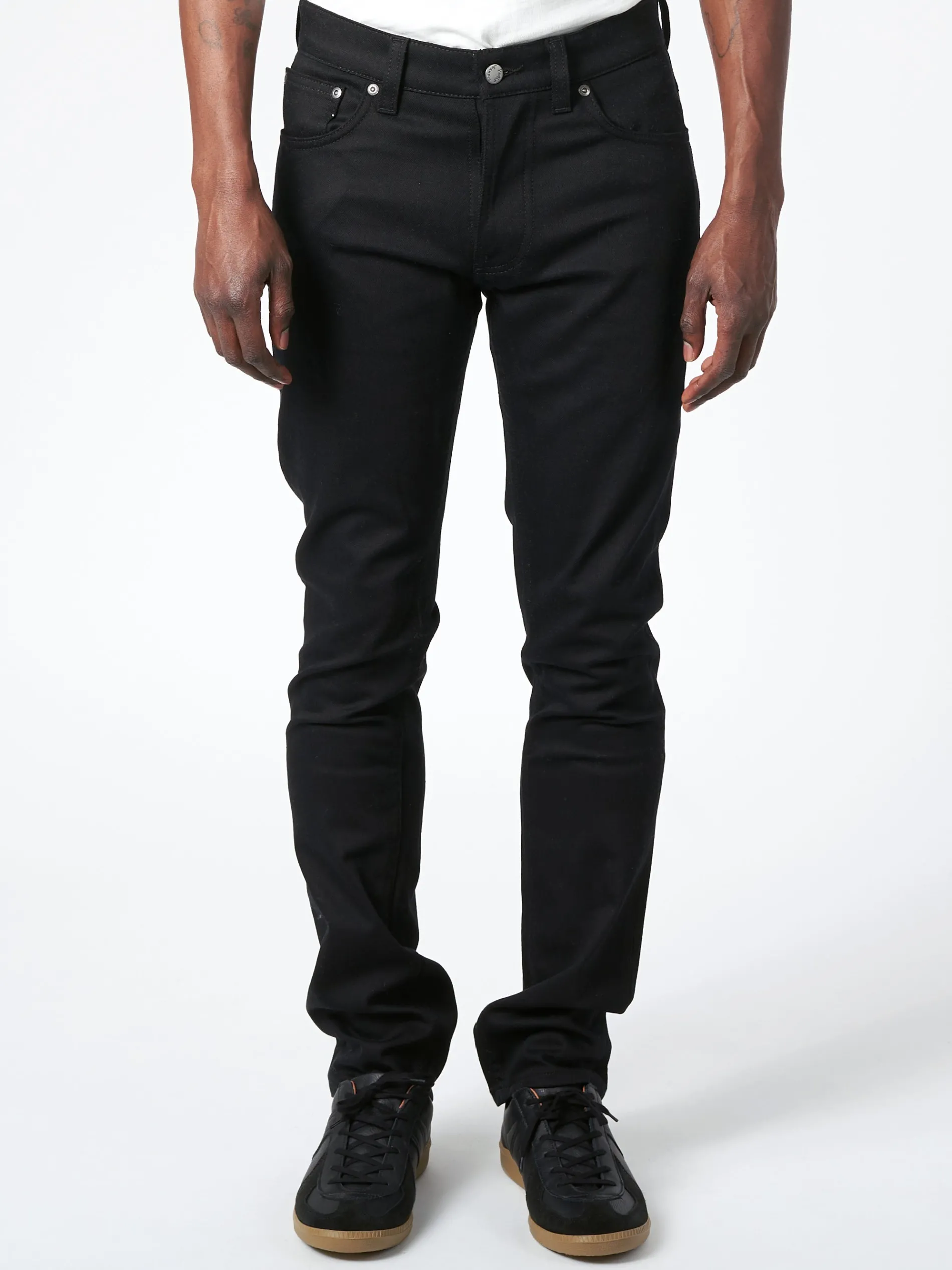 Nudie’s Grim Tim is a slim regular fit jean with a regular rise and straight from the hips through the thigh and down to the ankle. The Grim Tim also features a button fly and a narrow leg opening. Made from a comfort stretch denim, this is a perfect basic everyday jean. Cut from Everblack fabric, made to maintain its color for as long as possible, withstanding 40 or more washes without any significant loss of color.